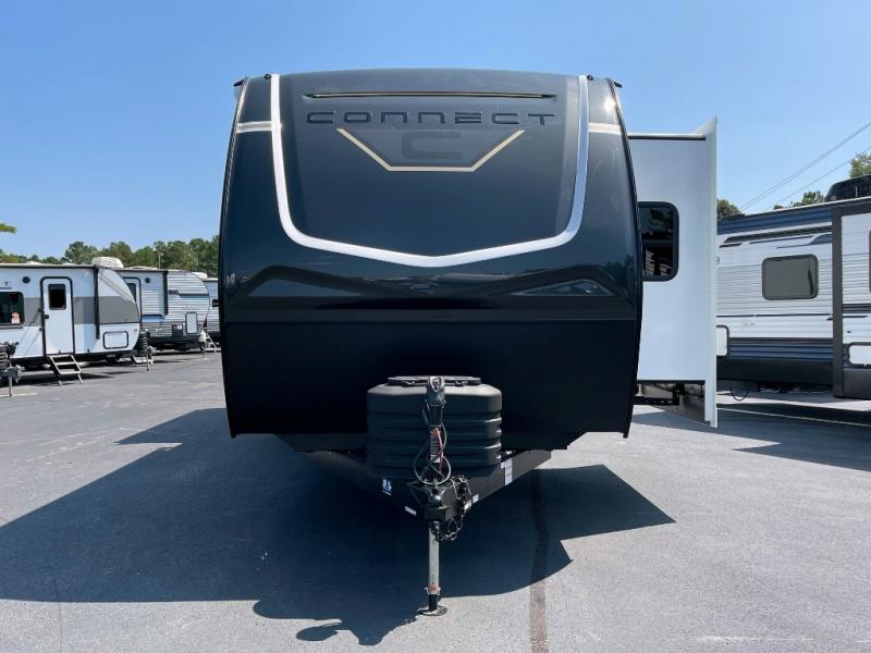 How about a nice afternoon of relaxing on the lake and then rinsing off in the 30" x 36" shower on this Connect travel trailer? After you get clean, you can grab a fresh change of clothes from the front walk-in closet and dresser in the private bedroom. The bedroom also has an area prepped for a washer and dryer and a king bed slide. Out in the main living area, you'll be able to prepare a meal without much effort at all since this trailer has a three-burner range, a microwave, a 10 cu. ft. 12V refrigerator, and a kitchen island for more prep space. You can even have your friends sit on the 70" sofa, theater seating, and booth dinette to chat with you while you finish the meal. You all will also benefit from the two electric awnings with LED lights on the exterior.