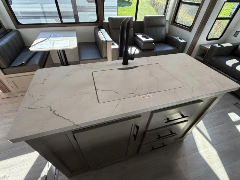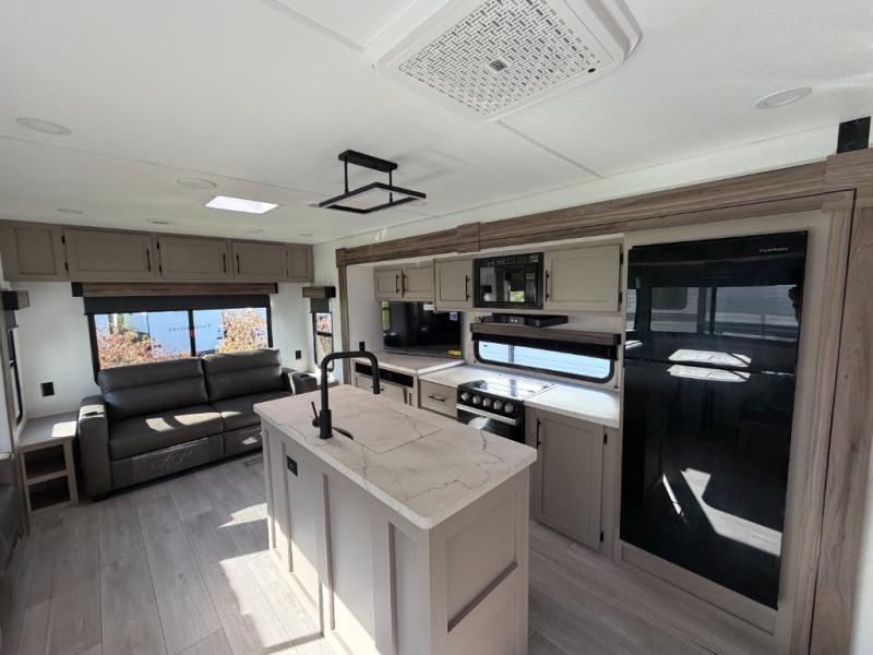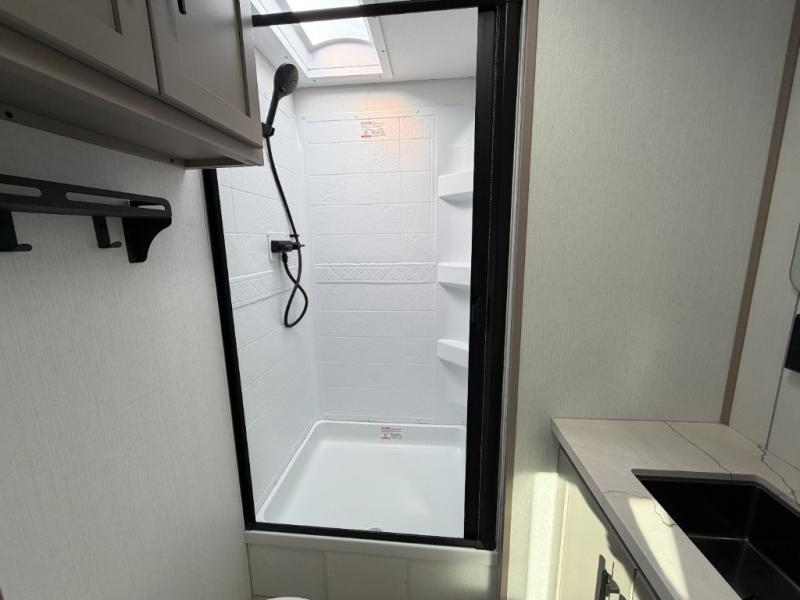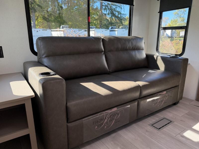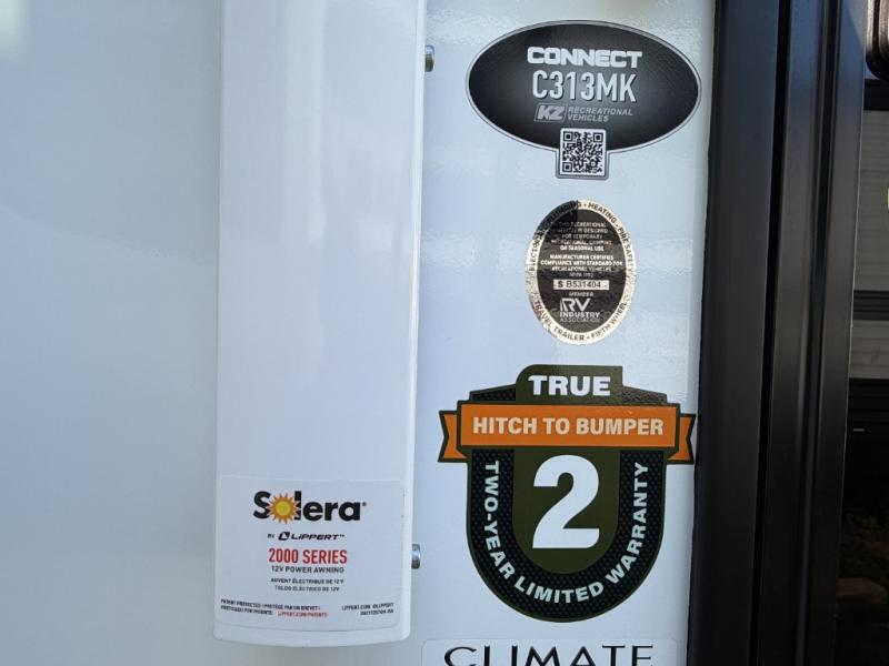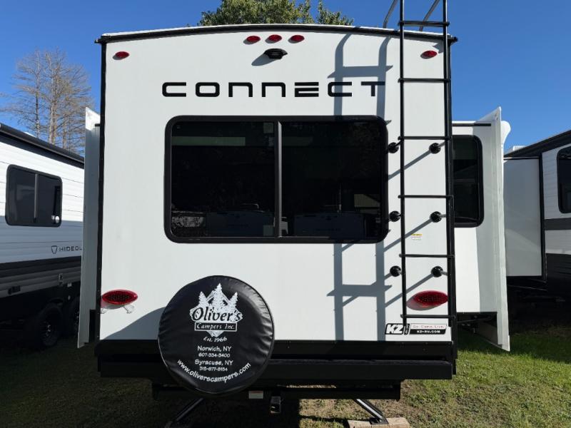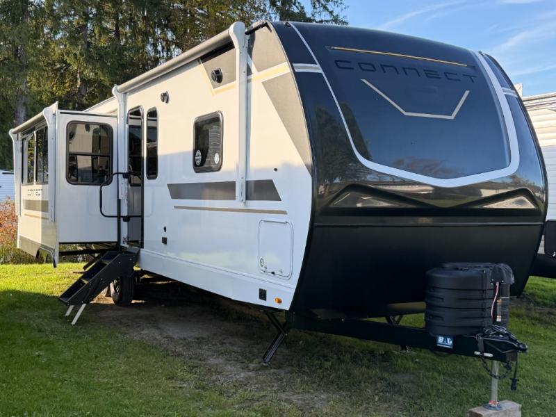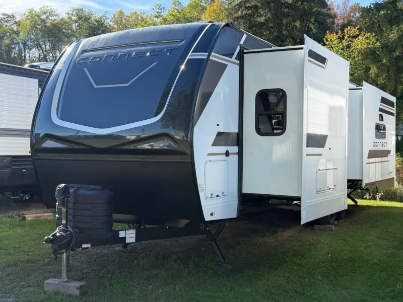 How about a nice afternoon of relaxing on the lake and then rinsing off in the 30" x 36" shower on this Connect travel trailer? After you get clean, you can grab a fresh change of clothes from the front walk-in closet and dresser in the private bedroom. The bedroom also has an area prepped for a washer and dryer and a king bed slide. Out in the main living area, you'll be able to prepare a meal without much effort at all since this trailer has a three-burner range, a microwave, a 10 cu. ft. 12V refrigerator, and a kitchen island for more prep space. You can even have your friends sit on the 70" sofa, theater seating, and booth dinette to chat with you while you finish the meal. You all will also benefit from the two electric awnings with LED lights on the exterior.