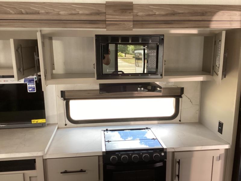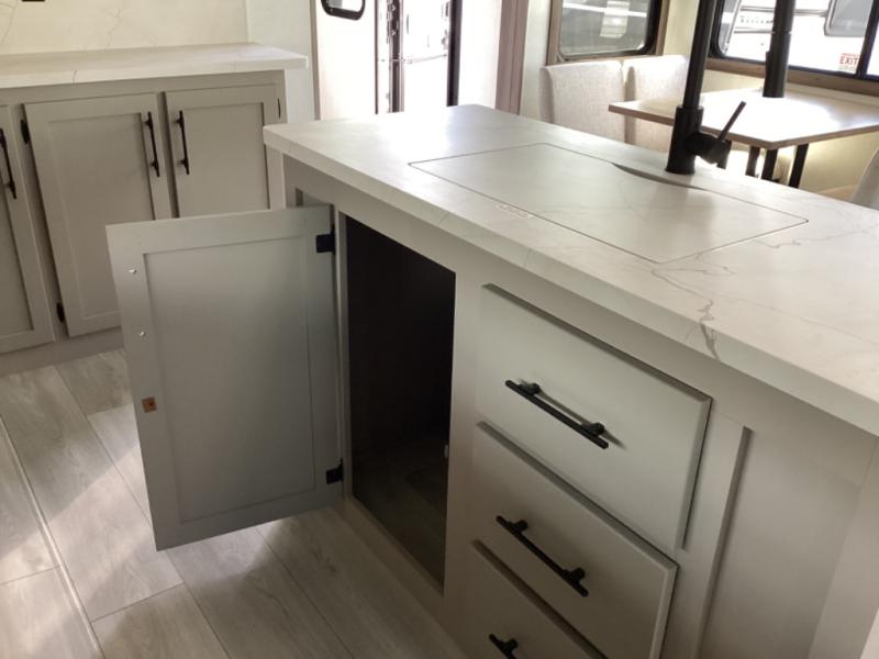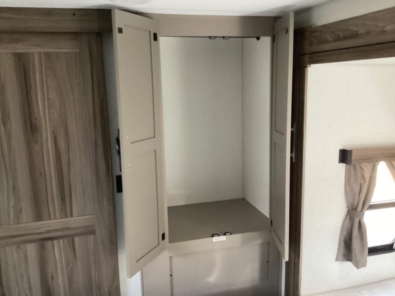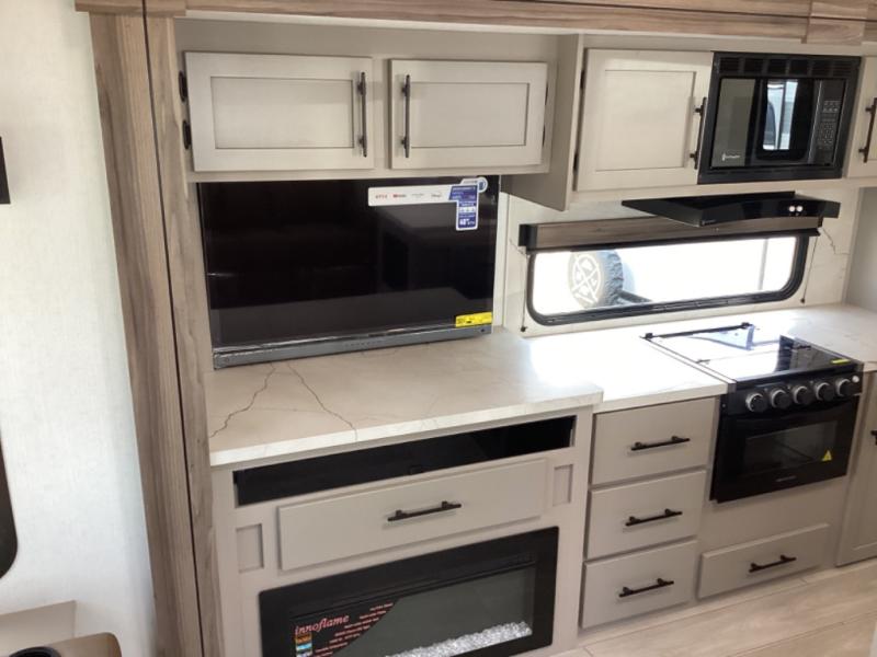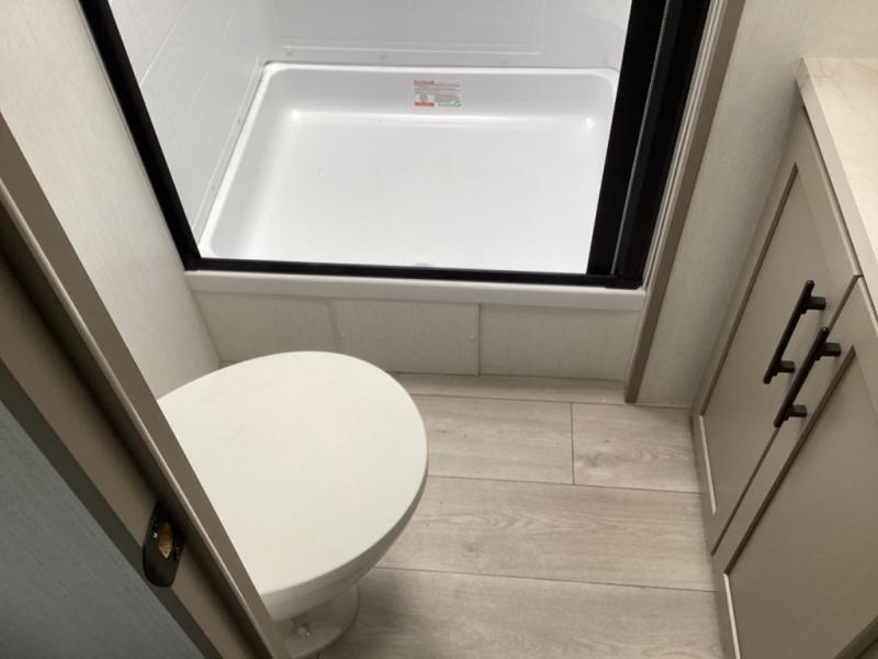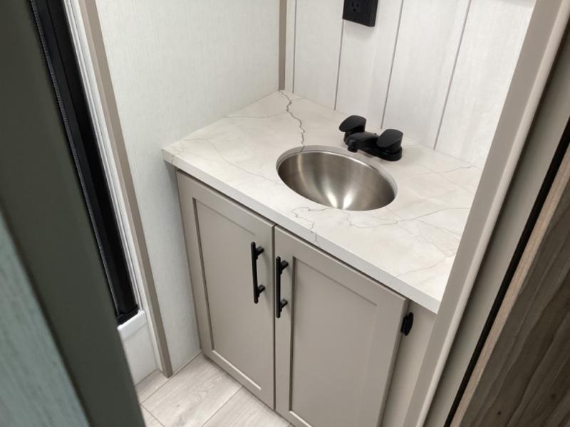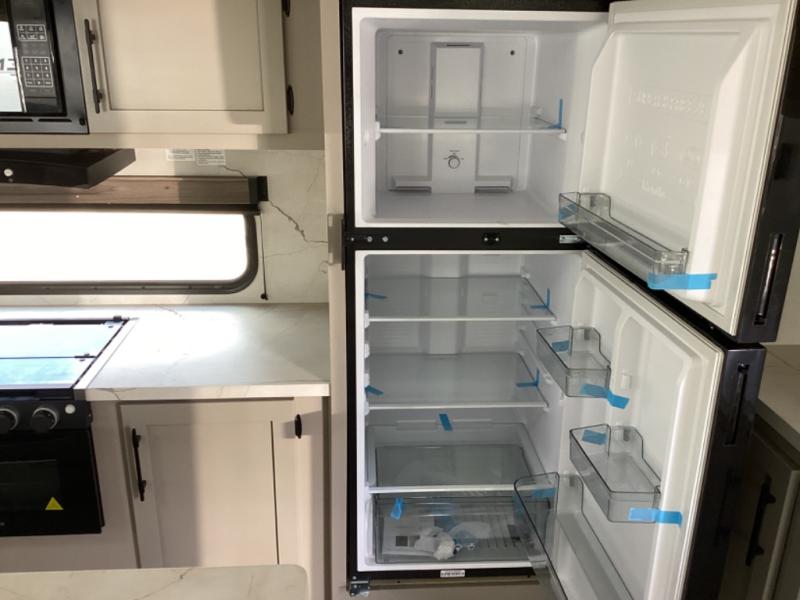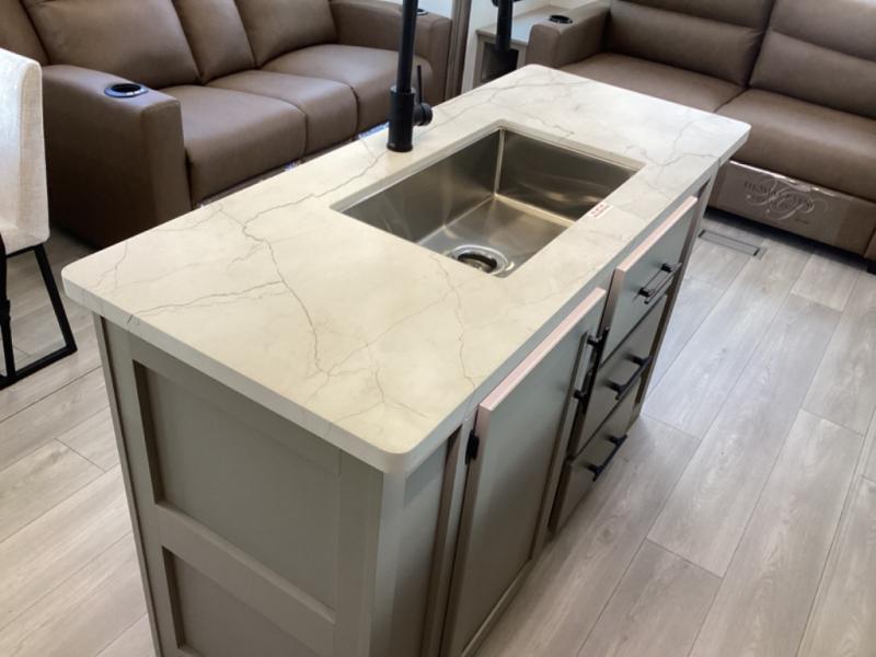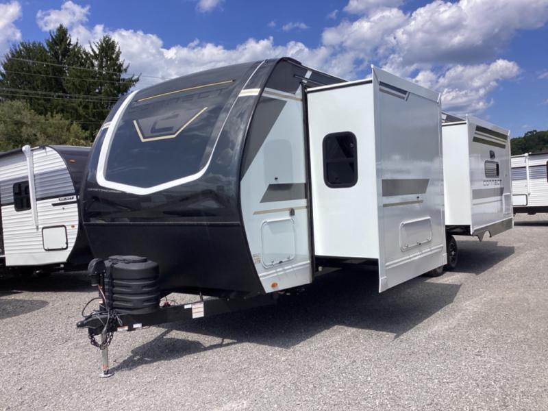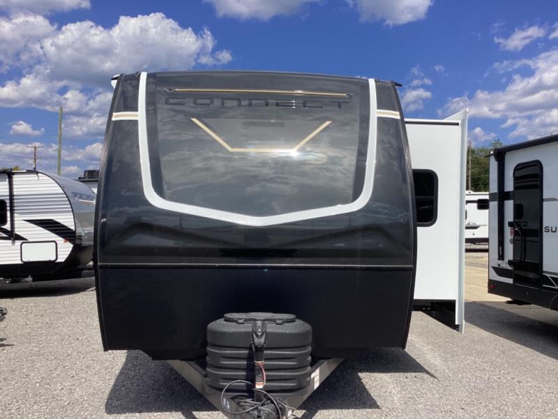 How about a nice afternoon of relaxing on the lake and then rinsing off in the 30" x 36" shower on this Connect travel trailer? After you get clean, you can grab a fresh change of clothes from the front walk-in closet and dresser in the private bedroom. The bedroom also has an area prepped for a washer and dryer and a king bed slide. Out in the main living area, you'll be able to prepare a meal without much effort at all since this trailer has a three-burner range, a microwave, a 10 cu. ft. 12V refrigerator, and a kitchen island for more prep space. You can even have your friends sit on the 70" sofa, theater seating, and booth dinette to chat with you while you finish the meal. You all will also benefit from the two electric awnings with LED lights on the exterior.