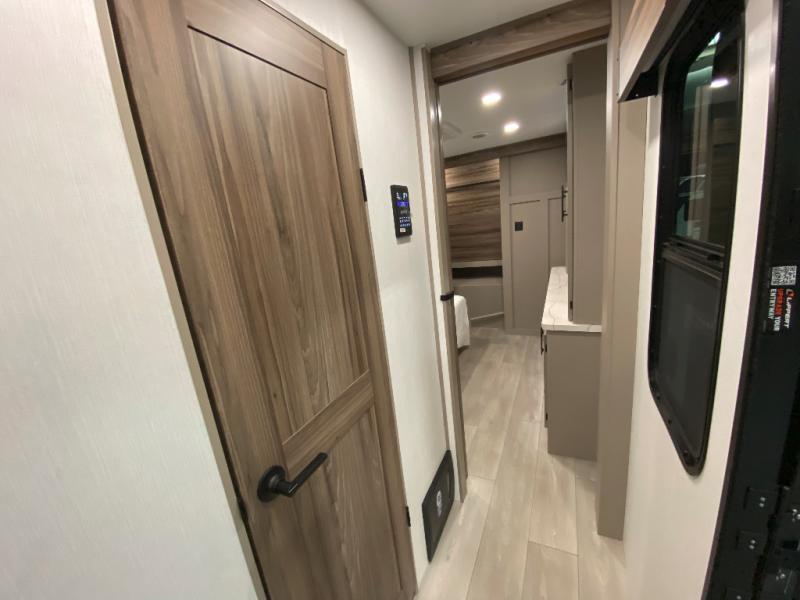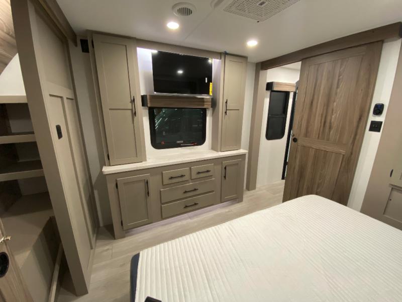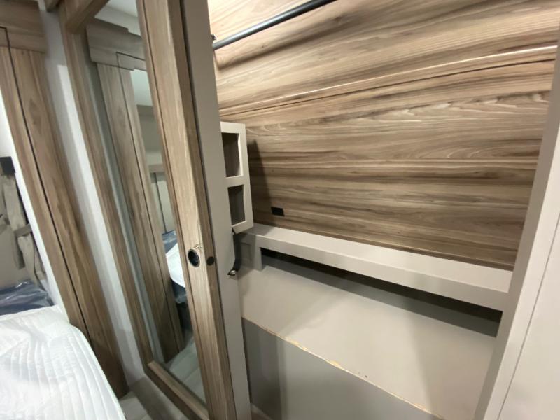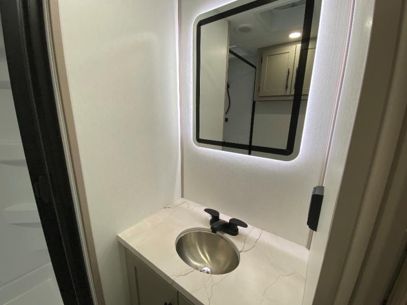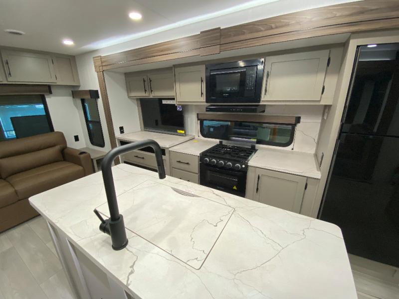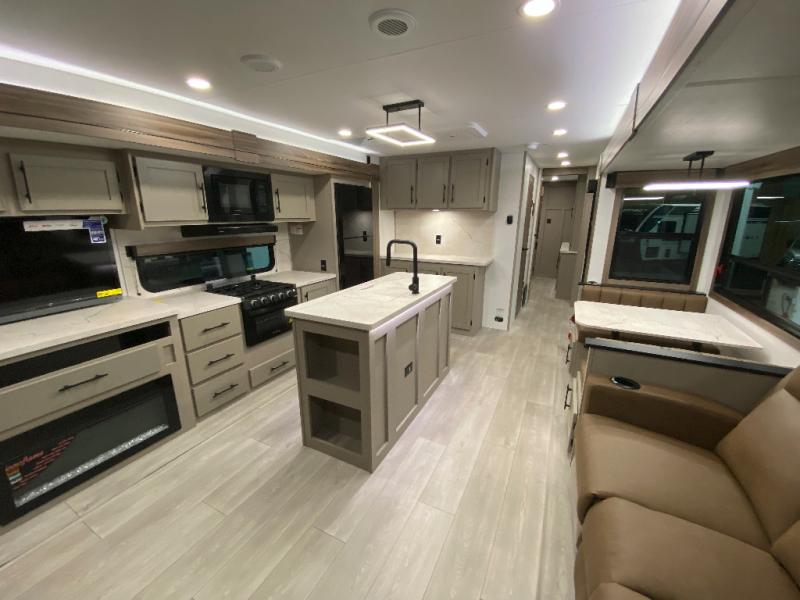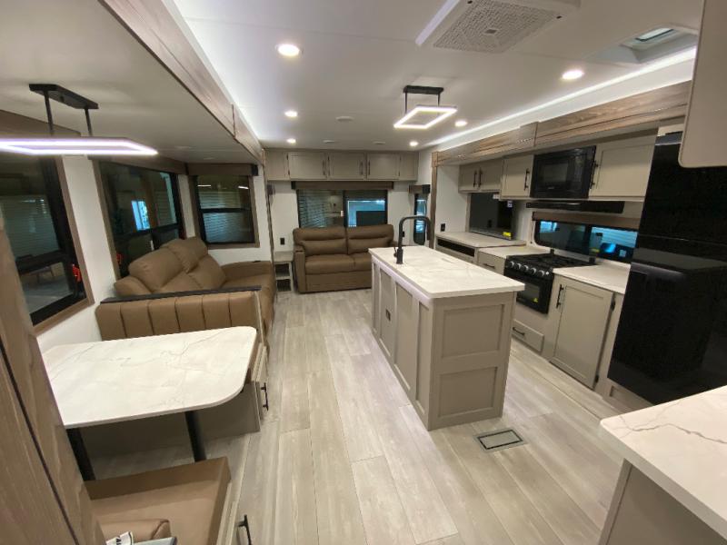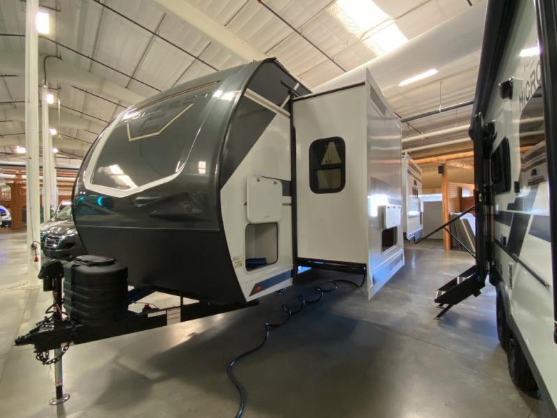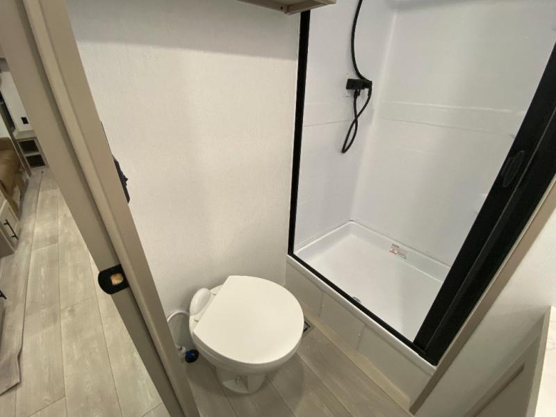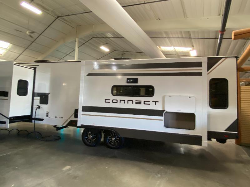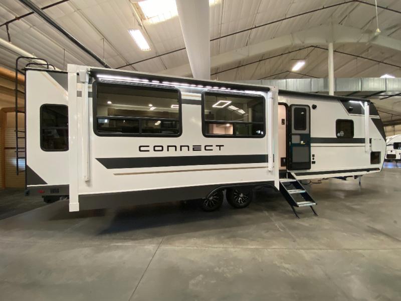 How about a nice afternoon of relaxing on the lake and then rinsing off in the 30" x 36" shower on this Connect travel trailer? After you get clean, you can grab a fresh change of clothes from the front walk-in closet and dresser in the private bedroom. The bedroom also has an area prepped for a washer and dryer and a king bed slide. Out in the main living area, you'll be able to prepare a meal without much effort at all since this trailer has a three-burner range, a microwave, a 10 cu. ft. 12V refrigerator, and a kitchen island for more prep space. You can even have your friends sit on the 70" sofa, theater seating, and booth dinette to chat with you while you finish the meal. You all will also benefit from the two electric awnings with LED lights on the exterior.