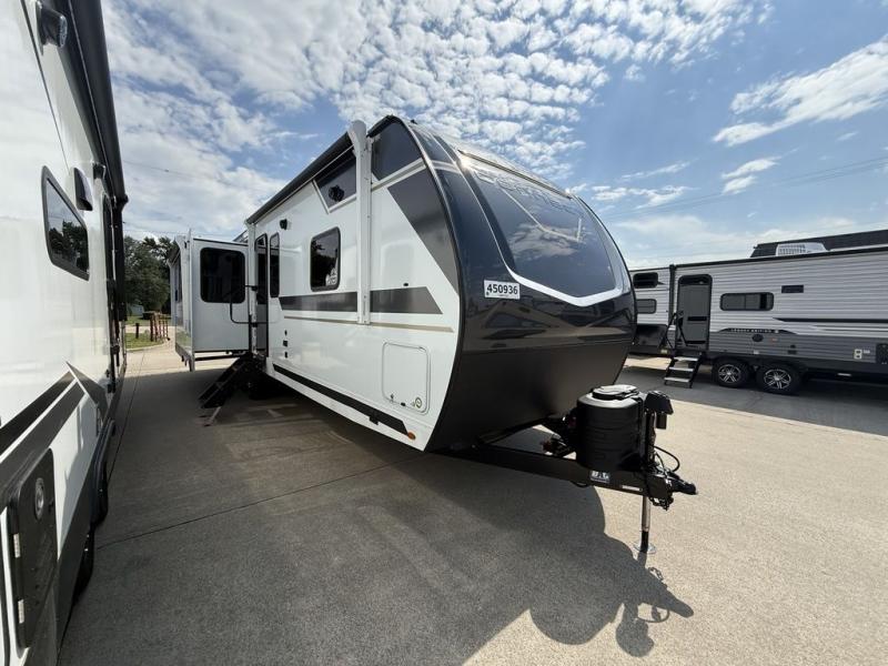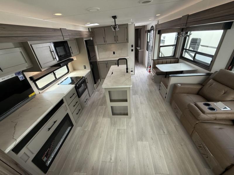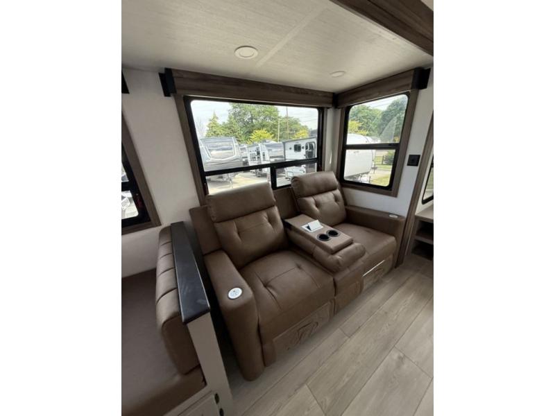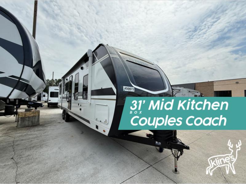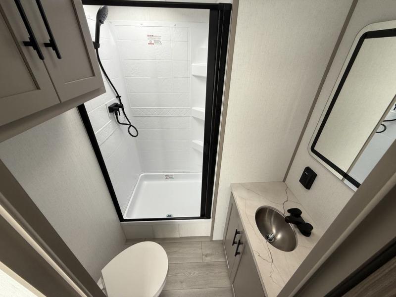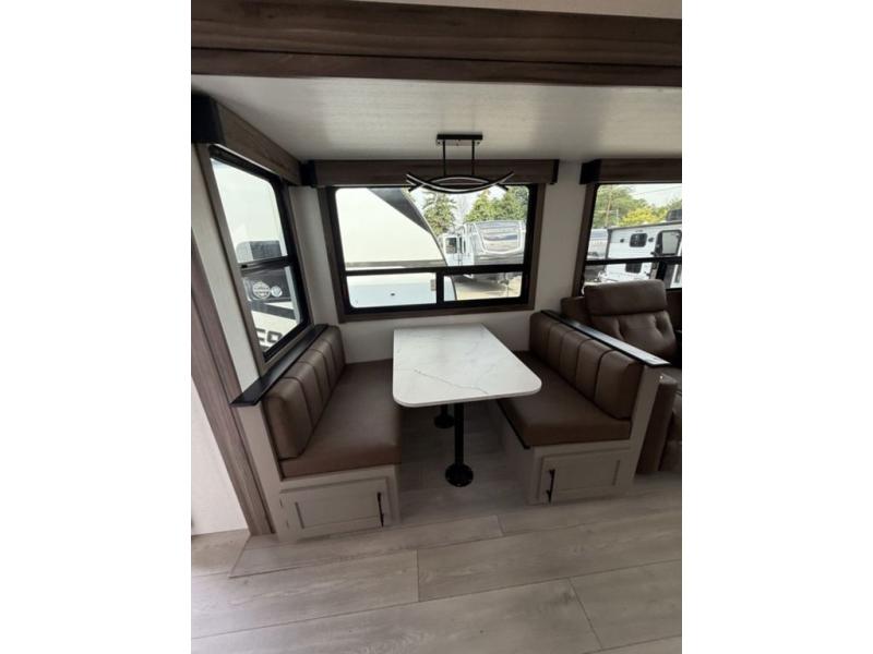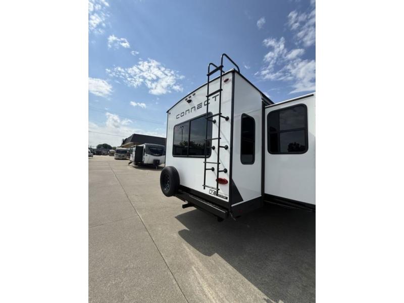 How about a nice afternoon of relaxing on the lake and then rinsing off in the 30" x 36" shower on this Connect travel trailer? After you get clean, you can grab a fresh change of clothes from the front walk-in closet and dresser in the private bedroom. The bedroom also has an area prepped for a washer and dryer and a king bed slide. Out in the main living area, you'll be able to prepare a meal without much effort at all since this trailer has a three-burner range, a microwave, a 10 cu. ft. 12V refrigerator, and a kitchen island for more prep space. You can even have your friends sit on the 70" sofa, theater seating, and booth dinette to chat with you while you finish the meal. You all will also benefit from the two electric awnings with LED lights on the exterior.