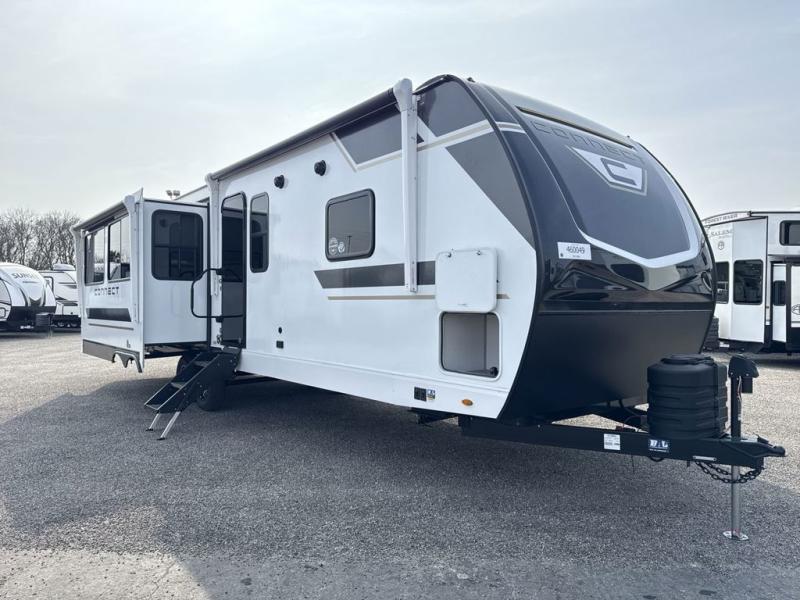 How about a nice afternoon of relaxing on the lake and then rinsing off in the 30" x 36" shower on this Connect travel trailer? After you get clean, you can grab a fresh change of clothes from the front walk-in closet and dresser in the private bedroom. The bedroom also has an area prepped for a washer and dryer and a king bed slide. Out in the main living area, you'll be able to prepare a meal without much effort at all since this trailer has a three-burner range, a microwave, a 10 cu. ft. 12V refrigerator, and a kitchen island for more prep space. You can even have your friends sit on the 70" sofa, theater seating, and booth dinette to chat with you while you finish the meal. You all will also benefit from the two electric awnings with LED lights on the exterior.