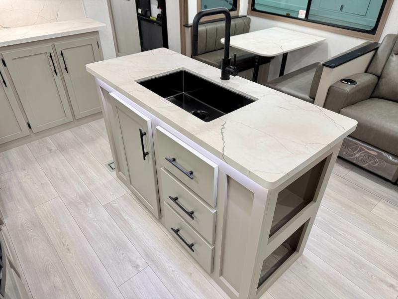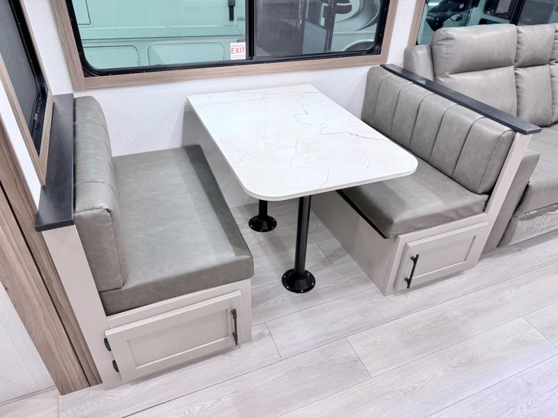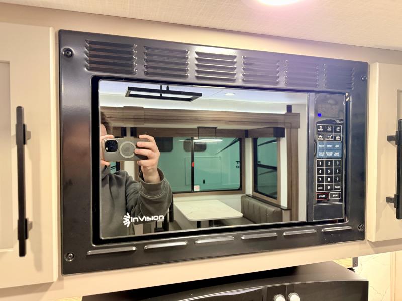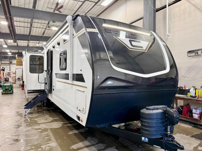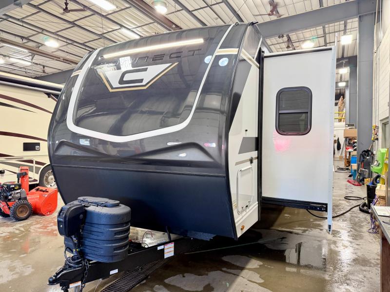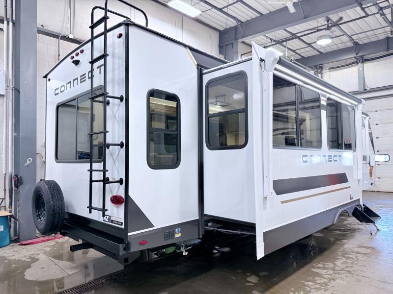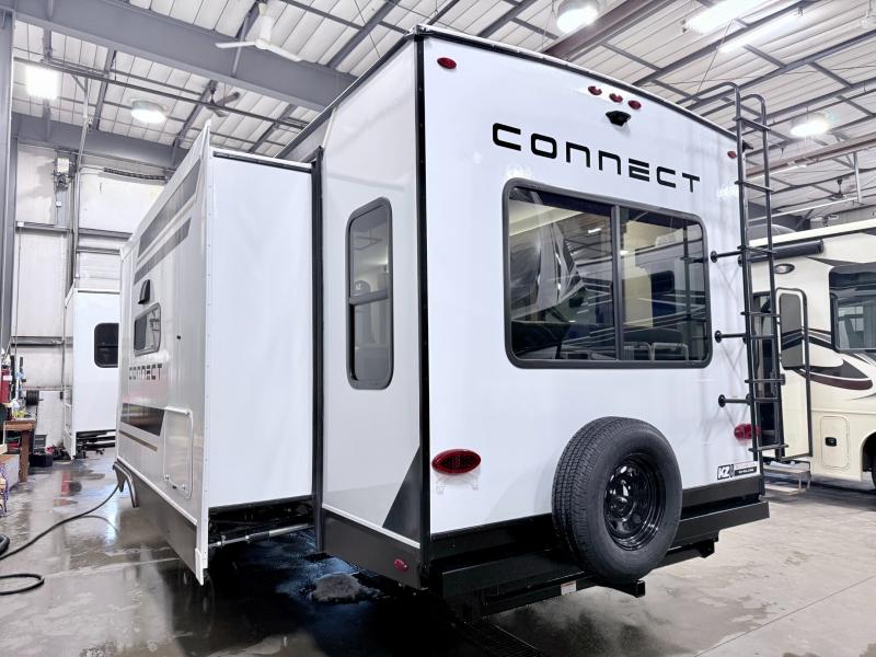 How about a nice afternoon of relaxing on the lake and then rinsing off in the 30" x 36" shower on this Connect travel trailer? After you get clean, you can grab a fresh change of clothes from the front walk-in closet and dresser in the private bedroom. The bedroom also has an area prepped for a washer and dryer and a king bed slide. Out in the main living area, you'll be able to prepare a meal without much effort at all since this trailer has a three-burner range, a microwave, a 10 cu. ft. 12V refrigerator, and a kitchen island for more prep space. You can even have your friends sit on the 70" sofa, theater seating, and booth dinette to chat with you while you finish the meal. You all will also benefit from the two electric awnings with LED lights on the exterior.
