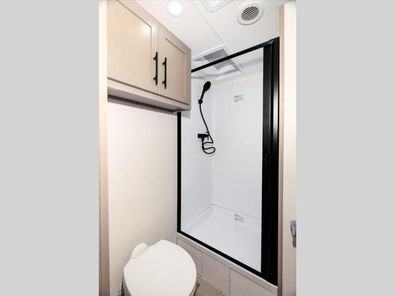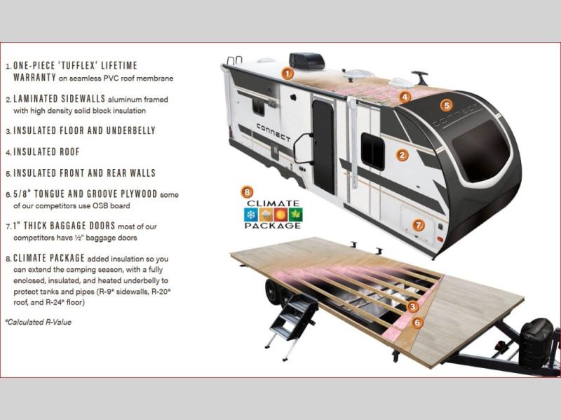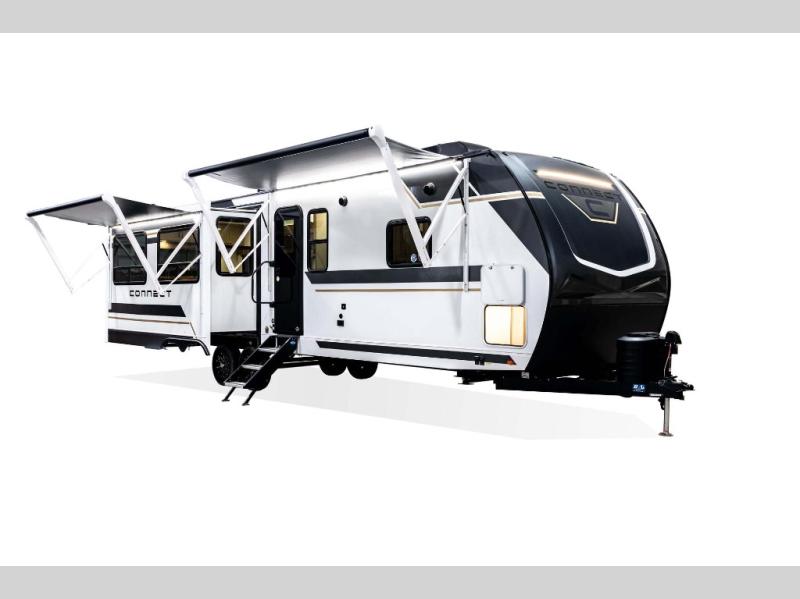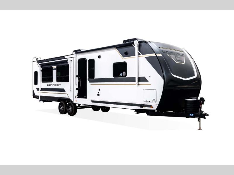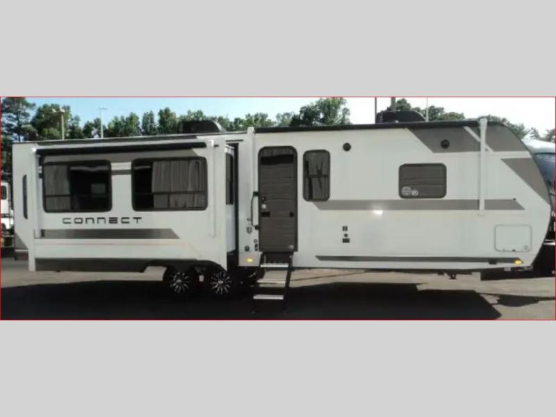 How about a nice afternoon of relaxing on the lake and then rinsing off in the 30" x 36" shower on this Connect travel trailer? After you get clean, you can grab a fresh change of clothes from the front walk-in closet and dresser in the private bedroom. The bedroom also has an area prepped for a washer and dryer and a king bed slide. Out in the main living area, you'll be able to prepare a meal without much effort at all since this trailer has a three-burner range, a microwave, a 10 cu. ft. 12V refrigerator, and a kitchen island for more prep space. You can even have your friends sit on the 70" sofa, theater seating, and booth dinette to chat with you while you finish the meal. You all will also benefit from the two electric awnings with LED lights on the exterior.