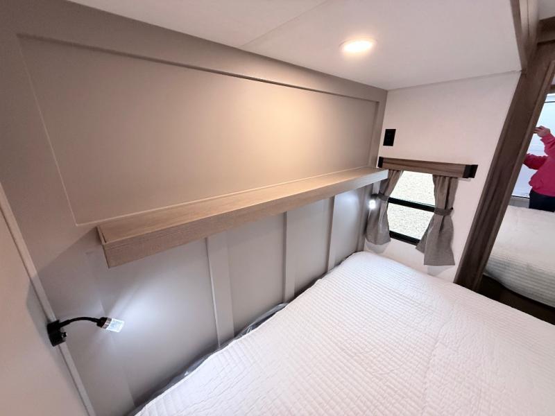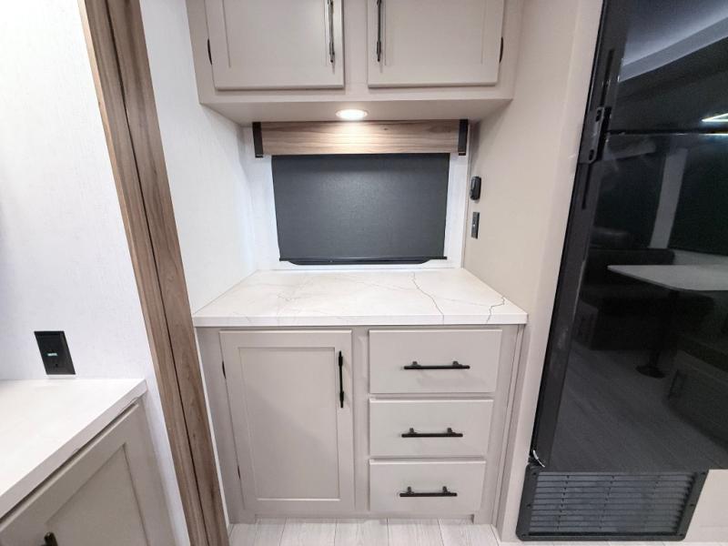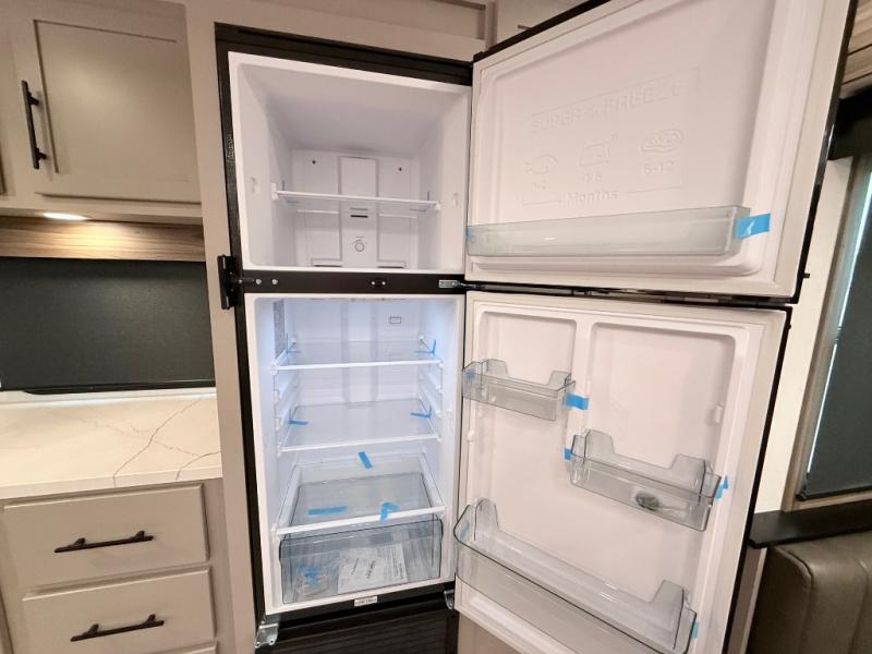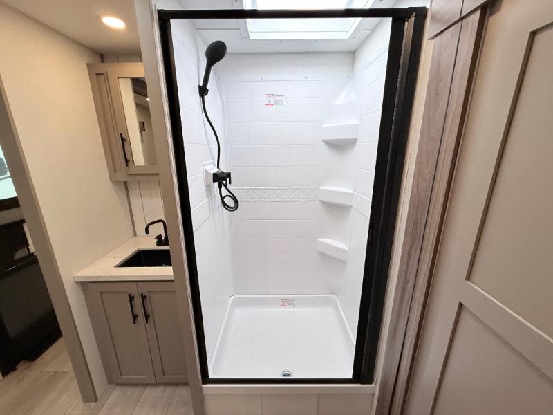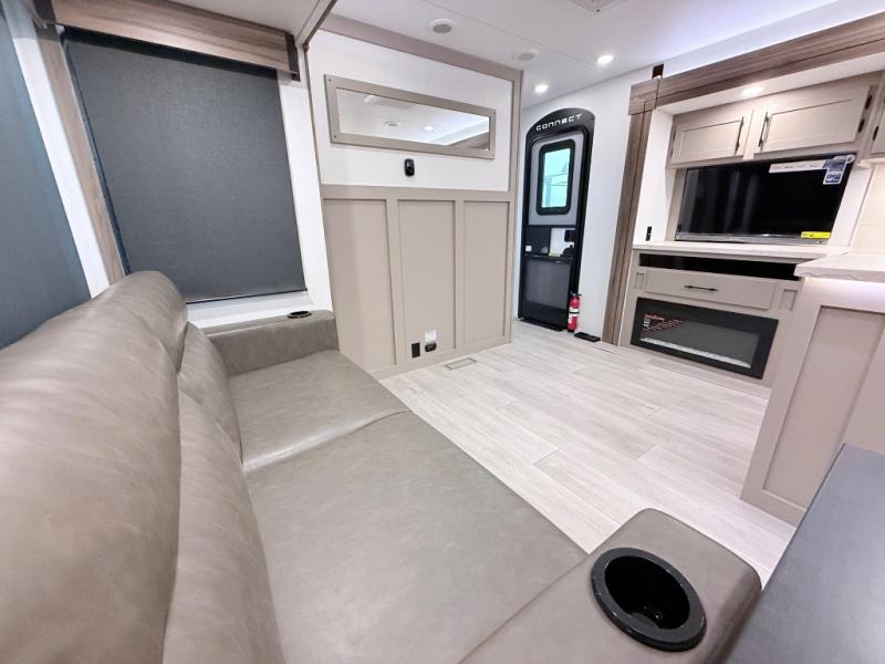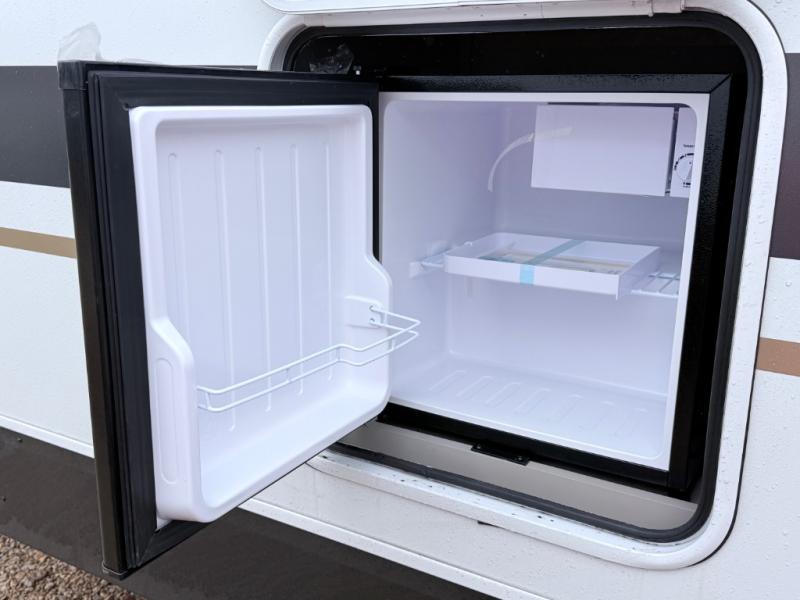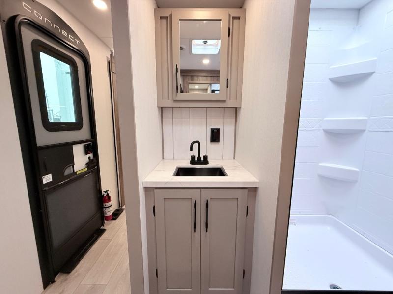 Imagine capping off a relaxing day by the lake with a rejuvenating rinse in the spacious 30" x 36" shower of your KZ Connect travel trailer. Afterward, step into the private bedroom to grab a fresh outfit from the front walk-in closet and dresser. The bedroom is a true sanctuary, featuring a king bed slide and an area prepped for an optional washer and dryer perfect for extended trips! Need to catch up on email? The bedroom also includes a convenient built-in desk, offering a private spot for work or study. In the main living area, you'll find everything you need to easily prepare a delicious meal. The kitchen boasts a three-burner range, a microwave, a 10-cu. ft. 12V refrigerator, and a convenient kitchen island for maximum prep space. Plus, you’ll love the dedicated coffee bar area, keeping your morning routine separate and the main counter clear. When it's time to eat or just relax, invite friends to join you on the hide-a-bed sofa and booth dinette. You can enjoy the outdoors too, you will find two power awnings with LED lights that create a comfortable, illuminated patio space.