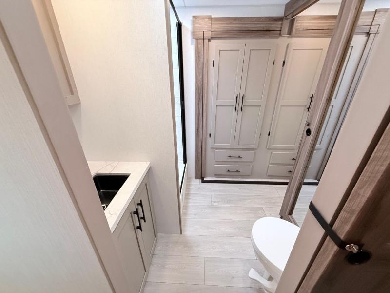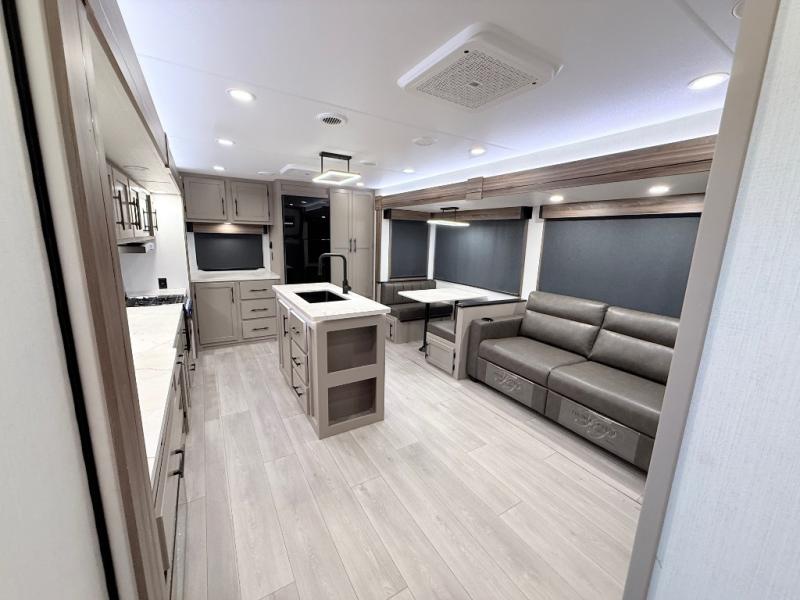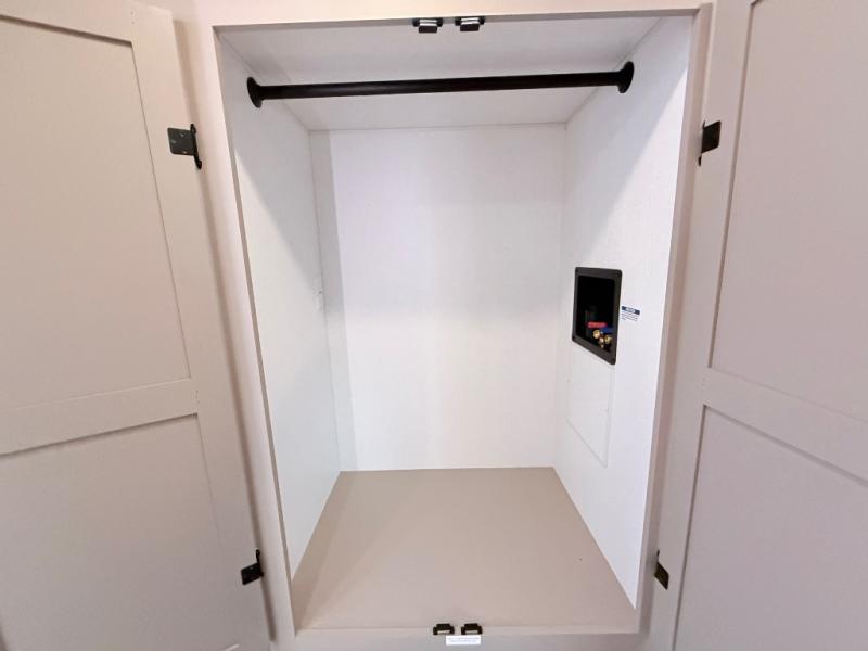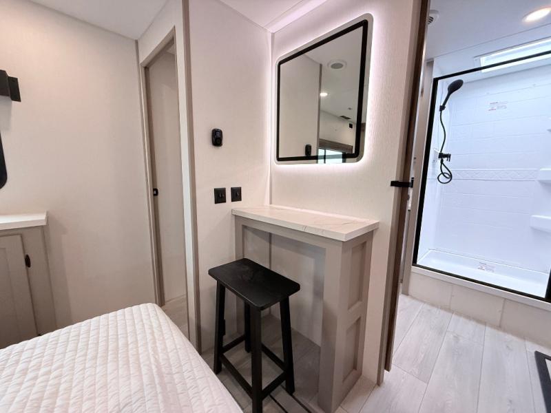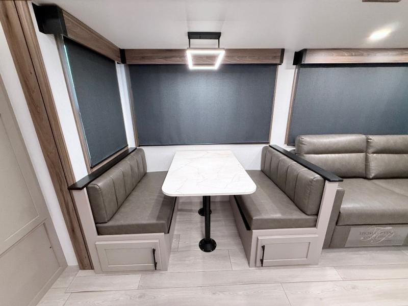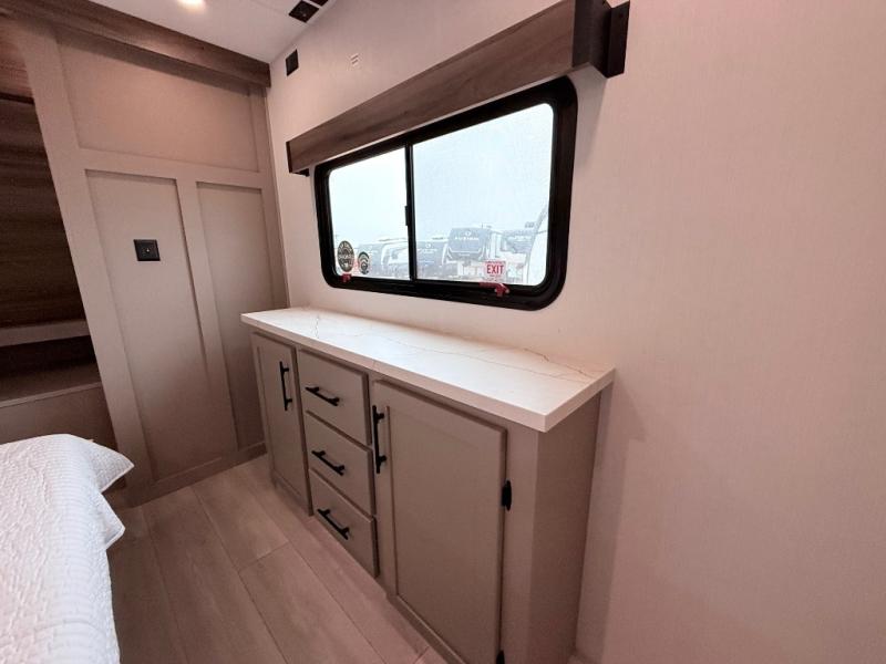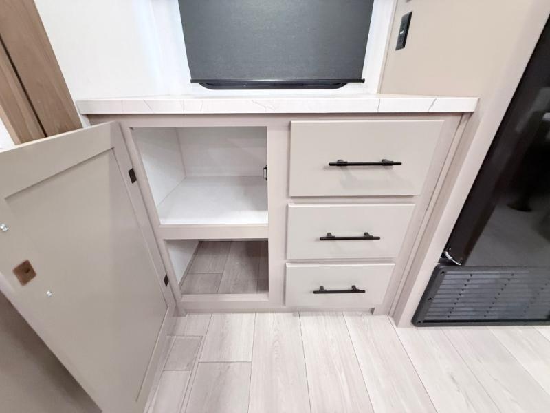 Imagine capping off a relaxing day by the lake with a rejuvenating rinse in the spacious 30" x 36" shower of your KZ Connect travel trailer. Afterward, step into the private bedroom to grab a fresh outfit from the front walk-in closet and dresser. The bedroom is a true sanctuary, featuring a king bed slide and an area prepped for an optional washer and dryer perfect for extended trips! Need to catch up on email? The bedroom also includes a convenient built-in desk, offering a private spot for work or study. In the main living area, you'll find everything you need to easily prepare a delicious meal. The kitchen boasts a three-burner range, a microwave, a 10-cu. ft. 12V refrigerator, and a convenient kitchen island for maximum prep space. Plus, you’ll love the dedicated coffee bar area, keeping your morning routine separate and the main counter clear. When it's time to eat or just relax, invite friends to join you on the hide-a-bed sofa and booth dinette. You can enjoy the outdoors too, you will find two power awnings with LED lights that create a comfortable, illuminated patio space.