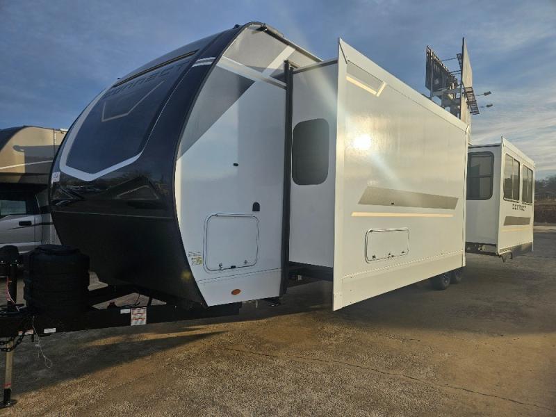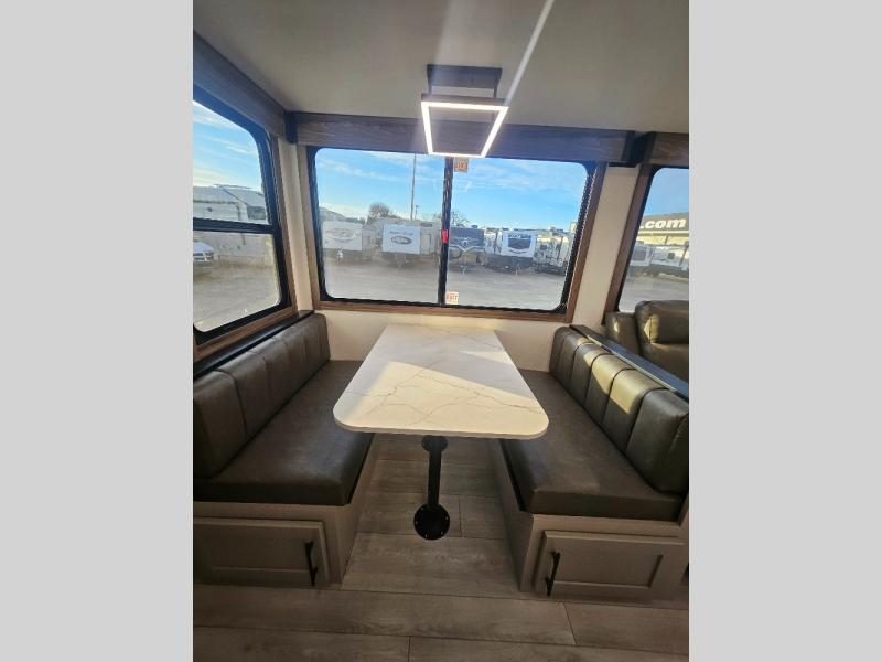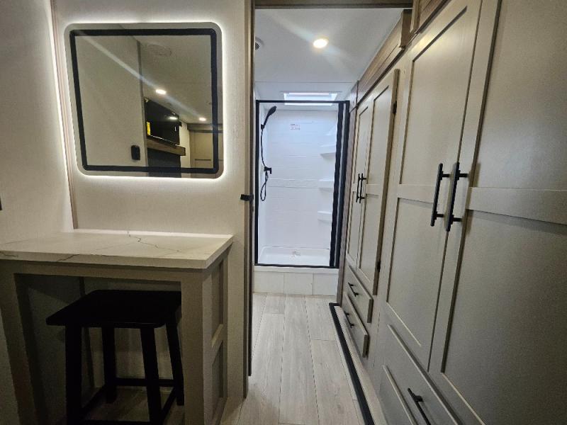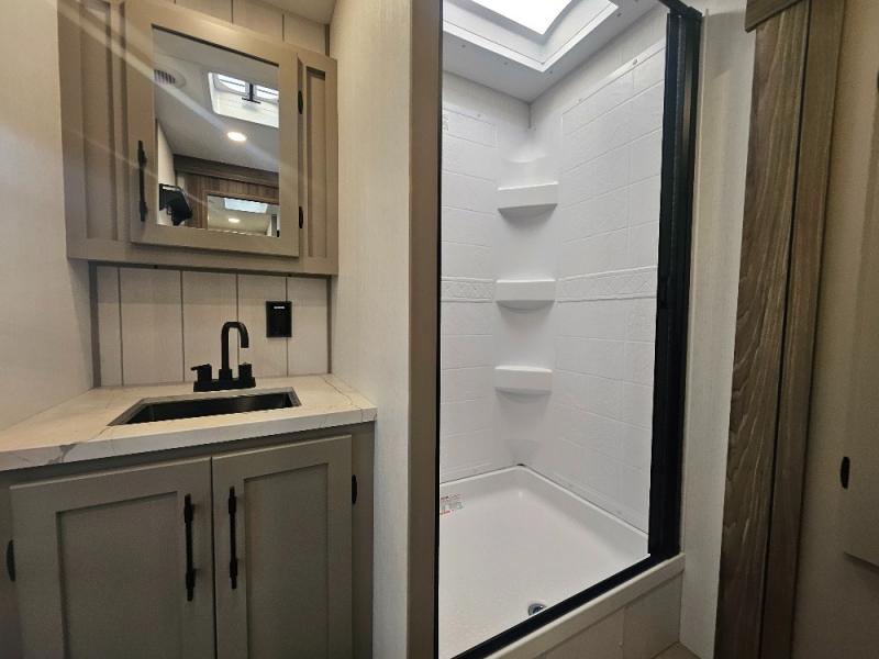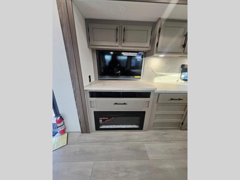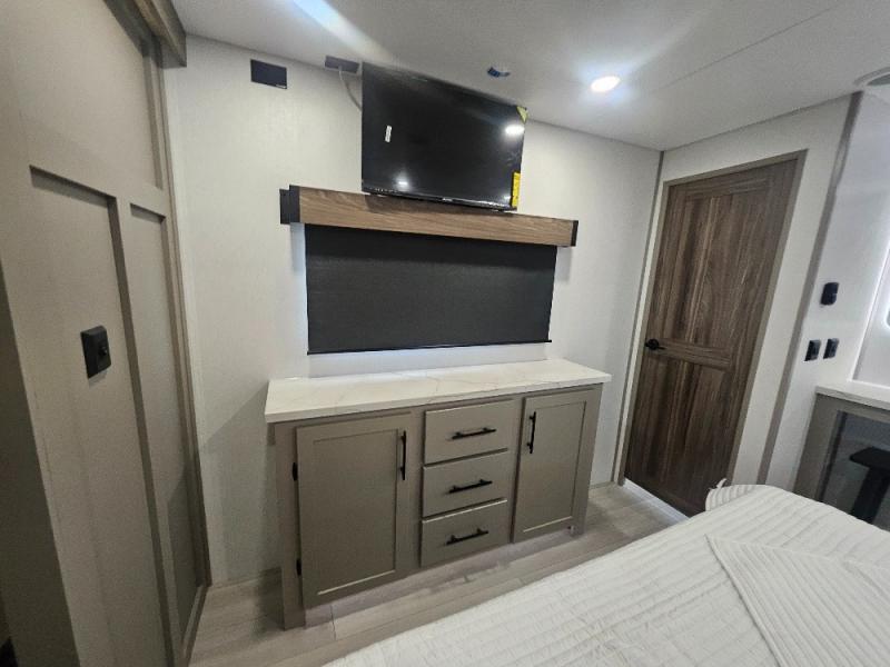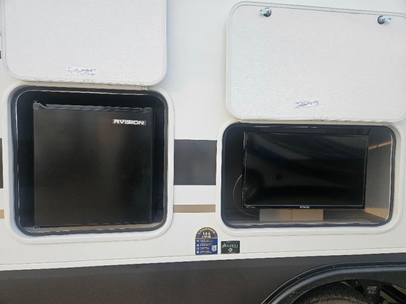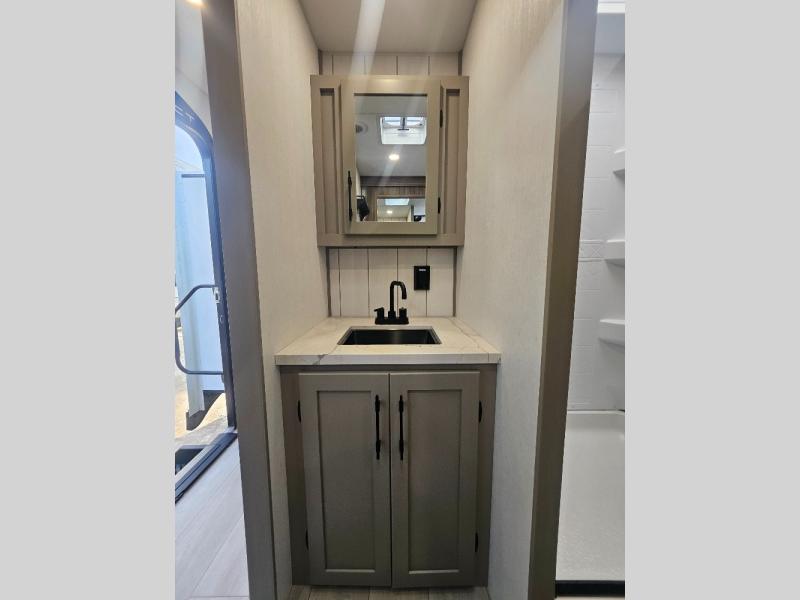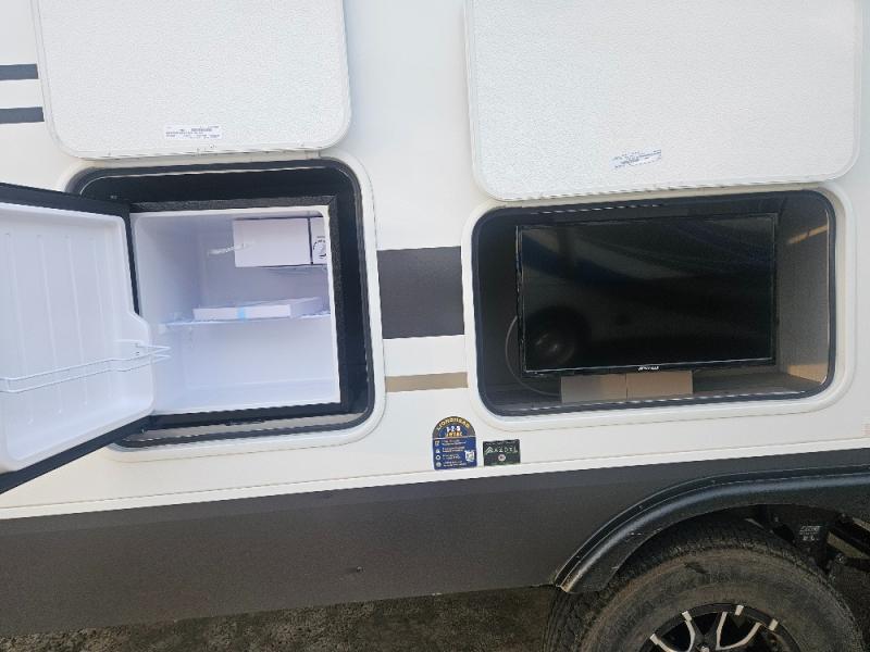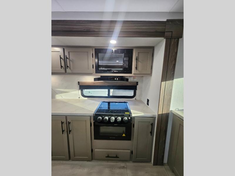 Imagine capping off a relaxing day by the lake with a rejuvenating rinse in the spacious 30" x 36" shower of your KZ Connect travel trailer. Afterward, step into the private bedroom to grab a fresh outfit from the front walk-in closet and dresser. The bedroom is a true sanctuary, featuring a king bed slide and an area prepped for an optional washer and dryer perfect for extended trips! Need to catch up on email? The bedroom also includes a convenient built-in desk, offering a private spot for work or study. In the main living area, you'll find everything you need to easily prepare a delicious meal. The kitchen boasts a three-burner range, a microwave, a 10-cu. ft. 12V refrigerator, and a convenient kitchen island for maximum prep space. Plus, you’ll love the dedicated coffee bar area, keeping your morning routine separate and the main counter clear. When it's time to eat or just relax, invite friends to join you on the hide-a-bed sofa and booth dinette. You can enjoy the outdoors too, you will find two power awnings with LED lights that create a comfortable, illuminated patio space.