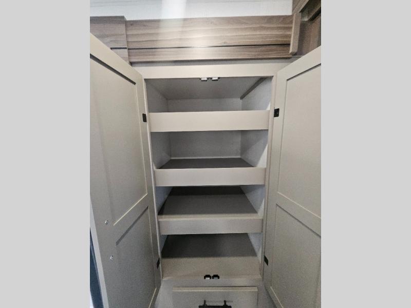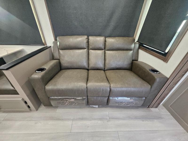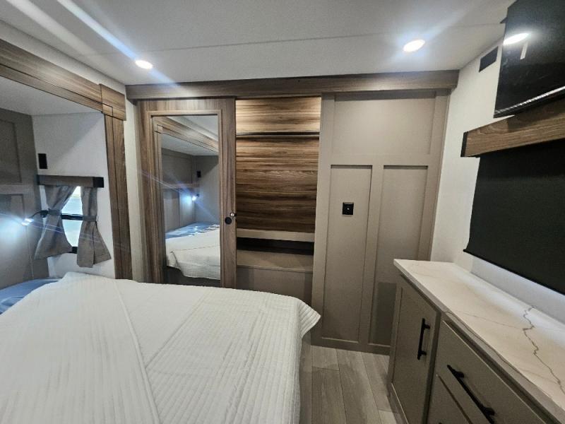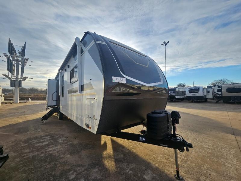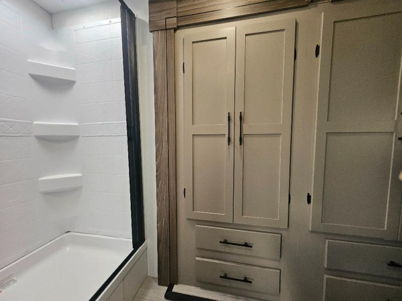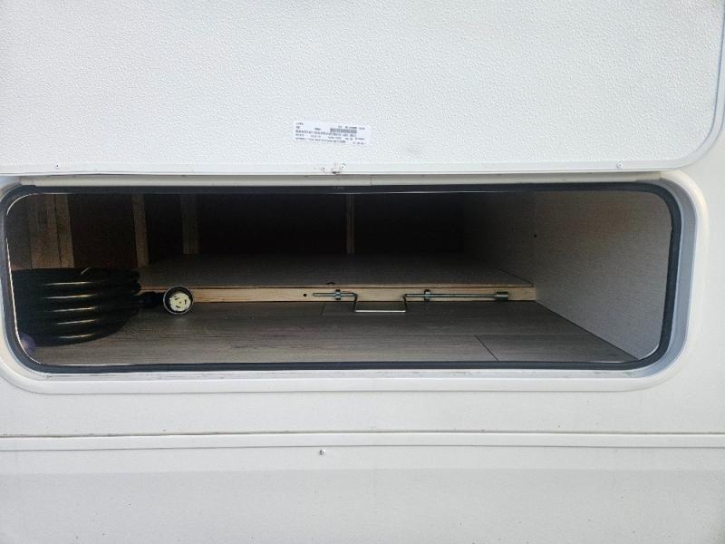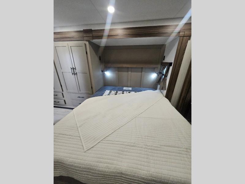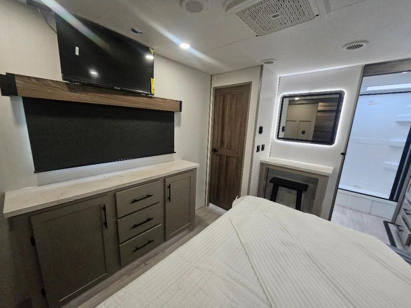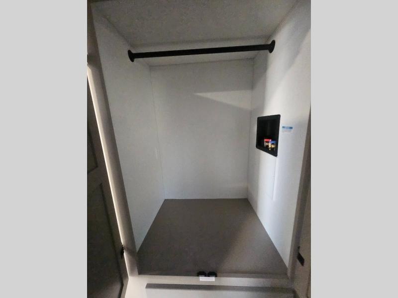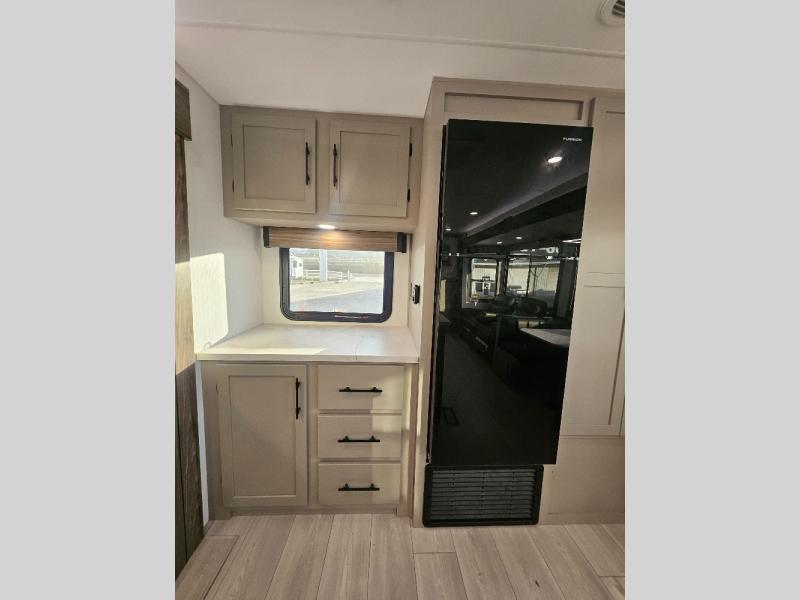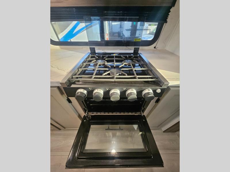 Imagine capping off a relaxing day by the lake with a rejuvenating rinse in the spacious 30" x 36" shower of your KZ Connect travel trailer. Afterward, step into the private bedroom to grab a fresh outfit from the front walk-in closet and dresser. The bedroom is a true sanctuary, featuring a king bed slide and an area prepped for an optional washer and dryer perfect for extended trips! Need to catch up on email? The bedroom also includes a convenient built-in desk, offering a private spot for work or study. In the main living area, you'll find everything you need to easily prepare a delicious meal. The kitchen boasts a three-burner range, a microwave, a 10-cu. ft. 12V refrigerator, and a convenient kitchen island for maximum prep space. Plus, you’ll love the dedicated coffee bar area, keeping your morning routine separate and the main counter clear. When it's time to eat or just relax, invite friends to join you on the hide-a-bed sofa and booth dinette. You can enjoy the outdoors too, you will find two power awnings with LED lights that create a comfortable, illuminated patio space.