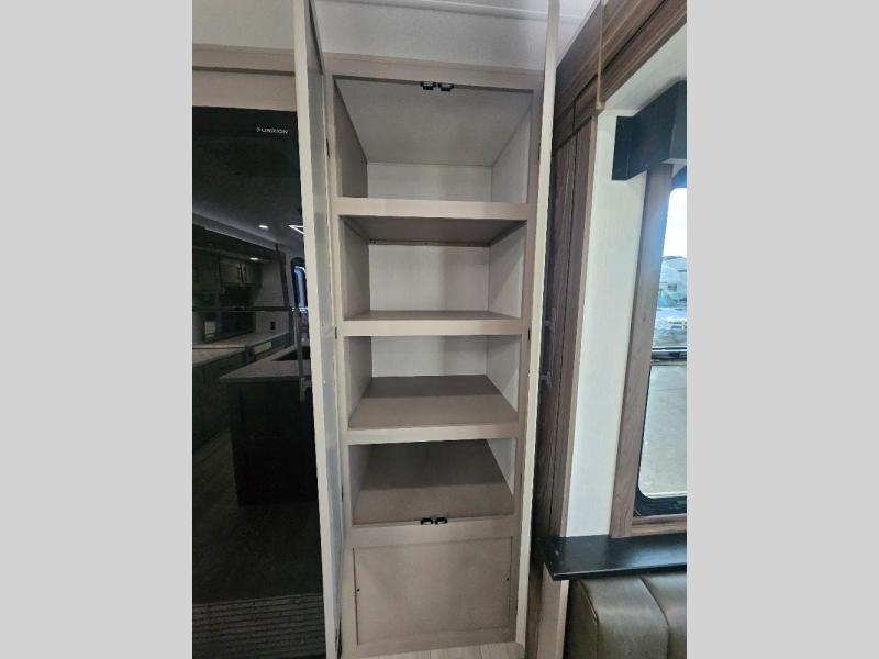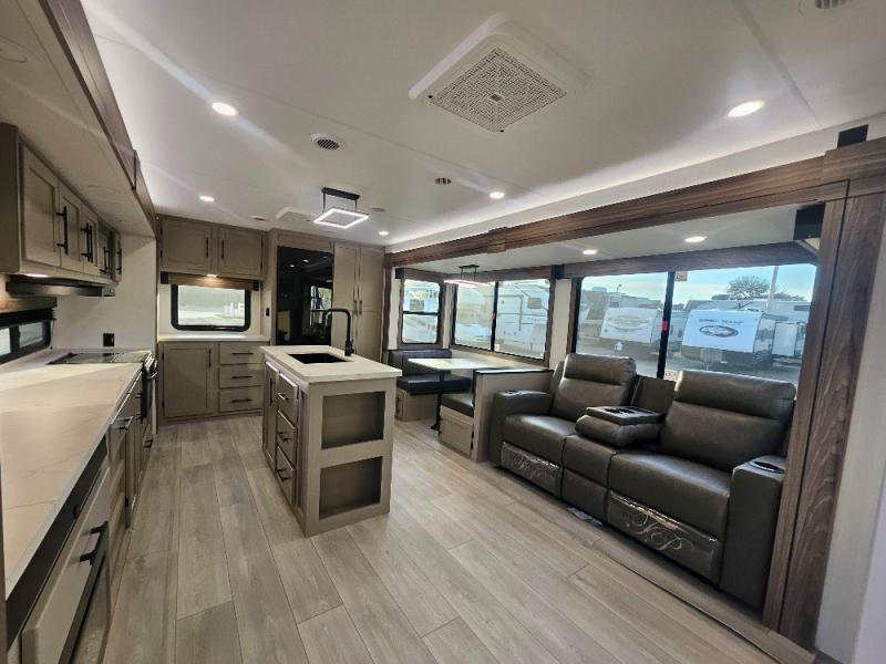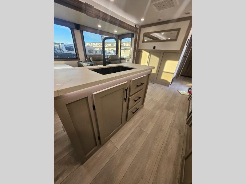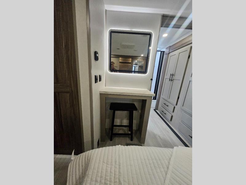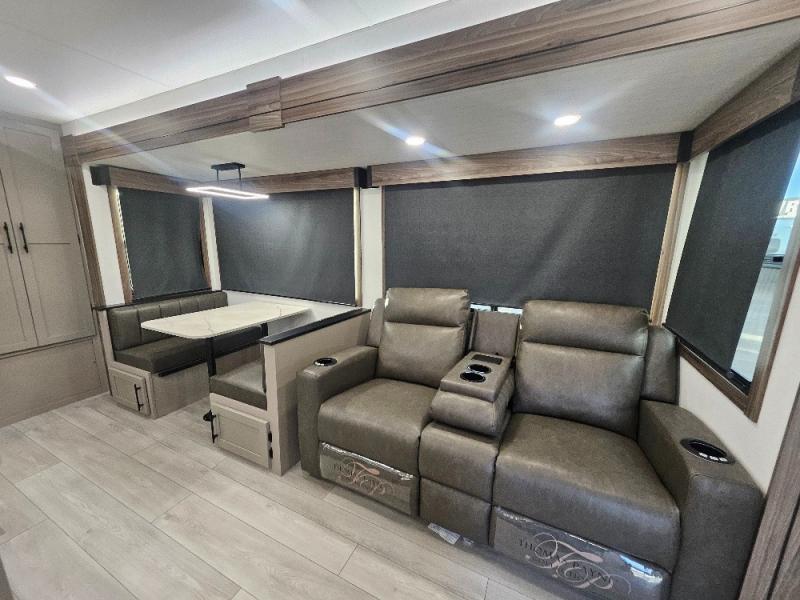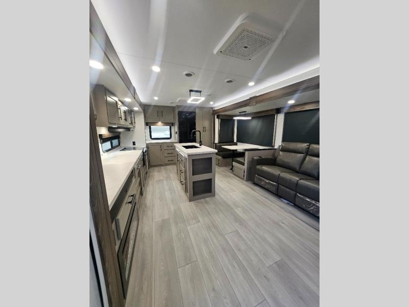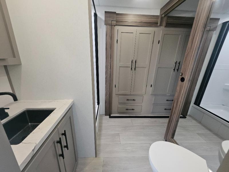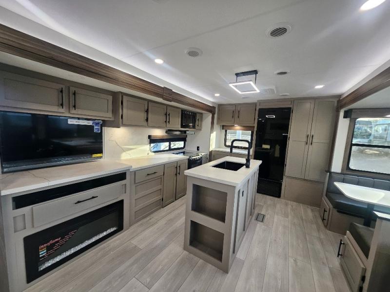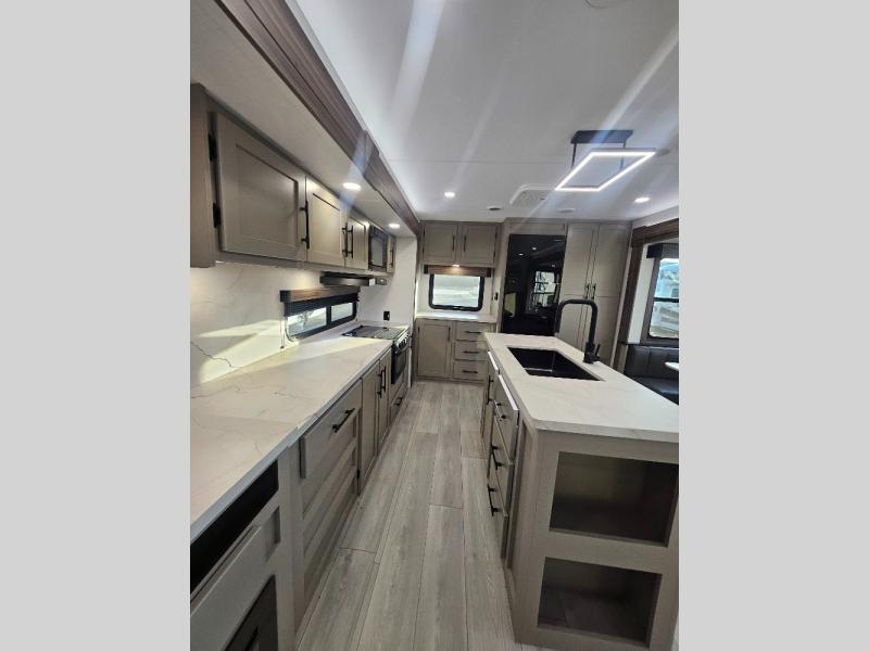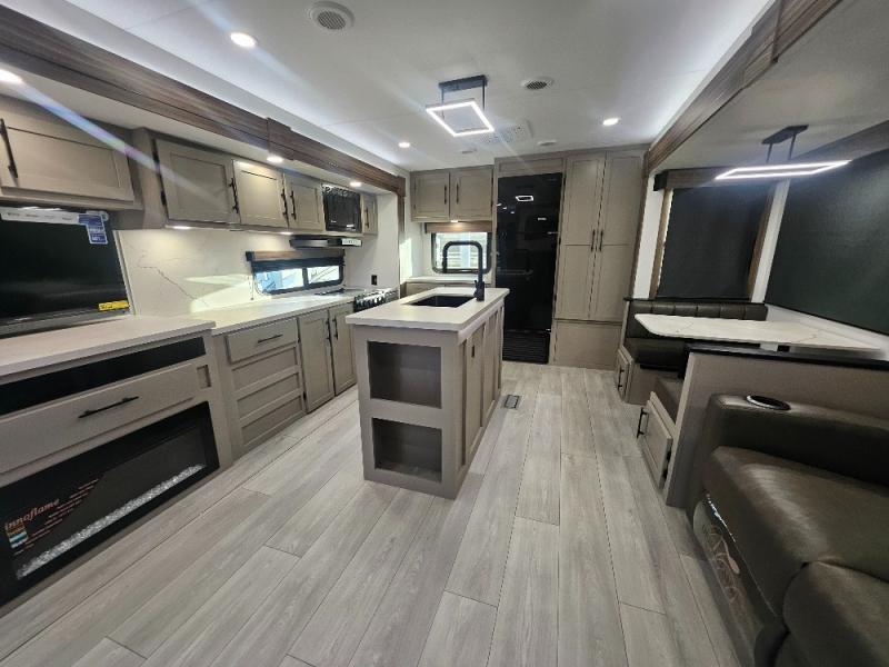 Imagine capping off a relaxing day by the lake with a rejuvenating rinse in the spacious 30" x 36" shower of your KZ Connect travel trailer. Afterward, step into the private bedroom to grab a fresh outfit from the front walk-in closet and dresser. The bedroom is a true sanctuary, featuring a king bed slide and an area prepped for an optional washer and dryer perfect for extended trips! Need to catch up on email? The bedroom also includes a convenient built-in desk, offering a private spot for work or study. In the main living area, you'll find everything you need to easily prepare a delicious meal. The kitchen boasts a three-burner range, a microwave, a 10-cu. ft. 12V refrigerator, and a convenient kitchen island for maximum prep space. Plus, you’ll love the dedicated coffee bar area, keeping your morning routine separate and the main counter clear. When it's time to eat or just relax, invite friends to join you on the hide-a-bed sofa and booth dinette. You can enjoy the outdoors too, you will find two power awnings with LED lights that create a comfortable, illuminated patio space.