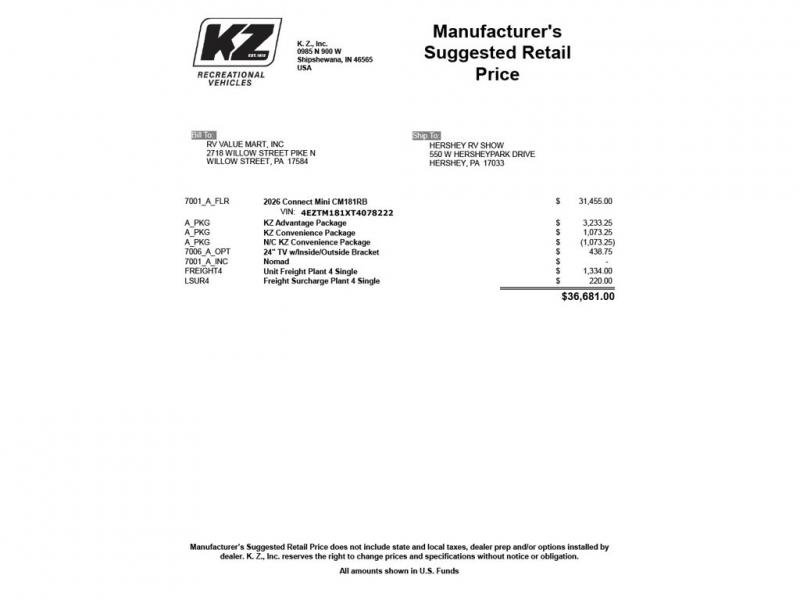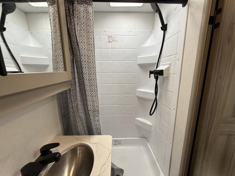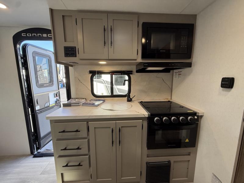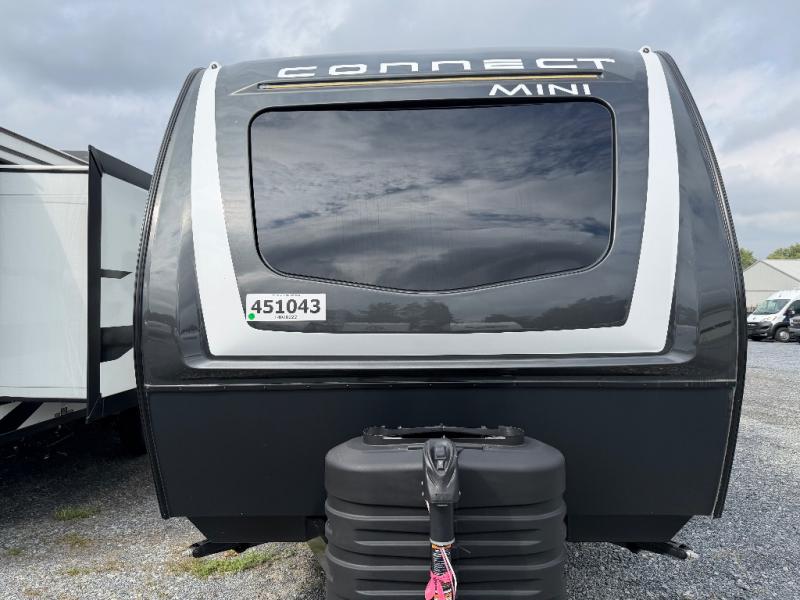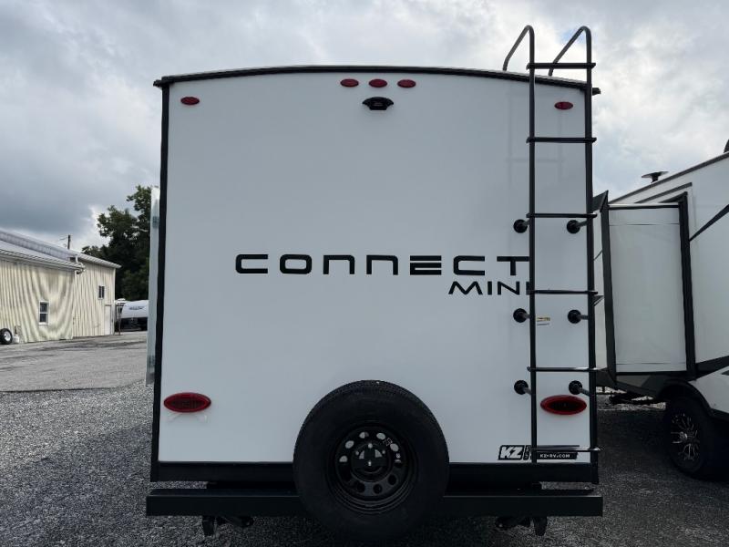 With any Connect Mini travel trailer by KZ, you will enjoy lightweight towing, interior comforts, and a price point you're sure to appreciate. Each model is constructed with durable 1-piece Tufflex material, 5/8" tongue and groove plywood flooring, and a molded fiberglass front cap with a windshield to let of your outdoor views in! You will love the look of the full glass friction hinged entry door, and the power awning with an LED light strip will provide a place to visit outdoors with friends and family. A hot and cold exterior shower also comes standard, along with a folding grab handle plus roof mounted solar prep and backup camera prep. Head inside to find residential grade linoleum, seamless countertops, roller shades, and painted hardwood cabinet doors. The 42,000 BTU tankless hot water heater will provide endless hot showers, and the low profile 13,500 BTU A/C will keep you comfortable during the summer!