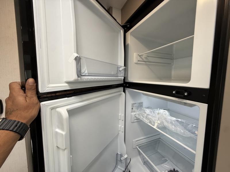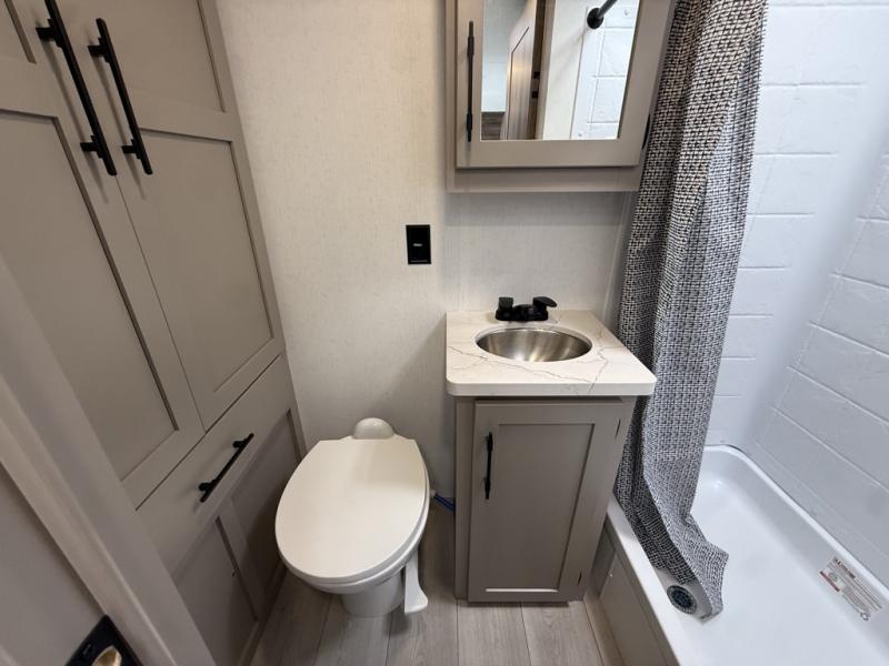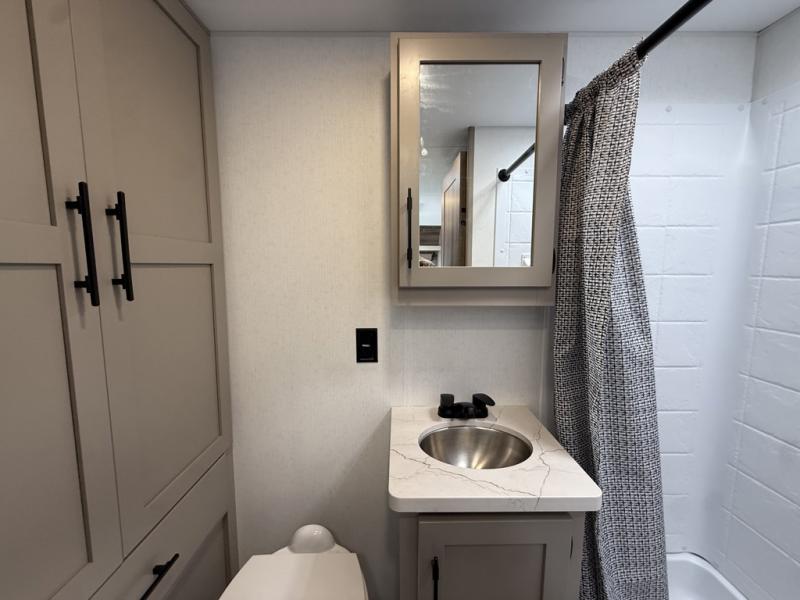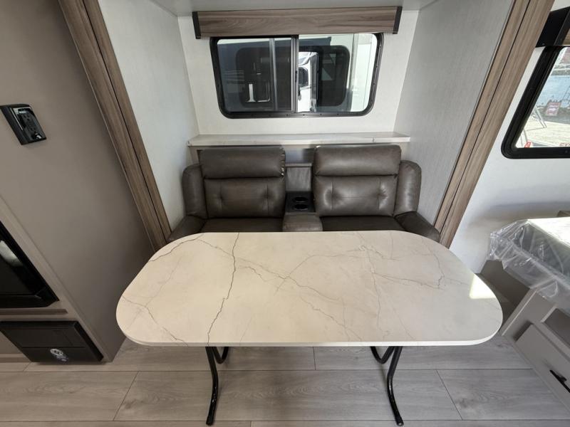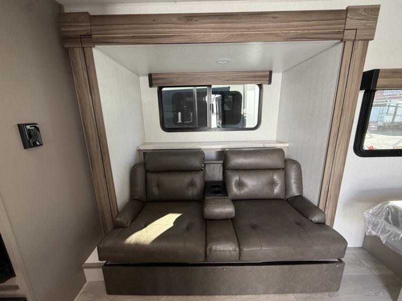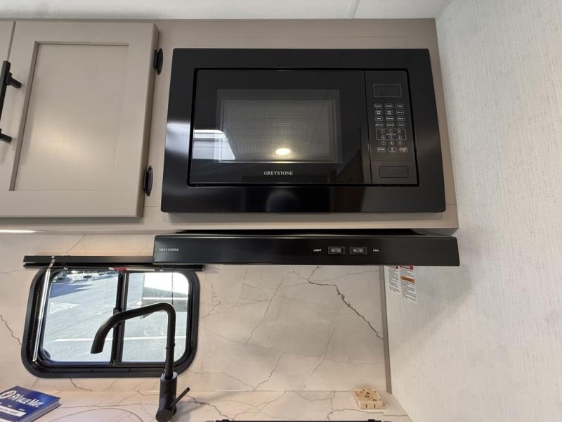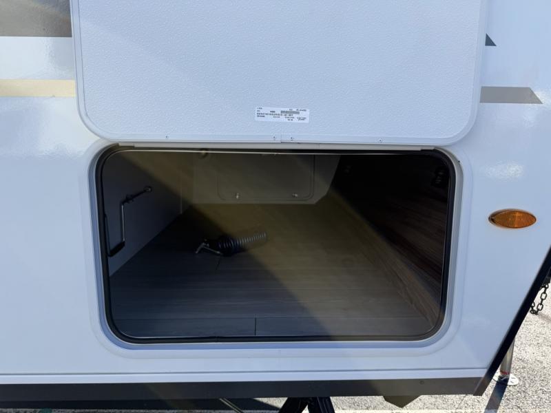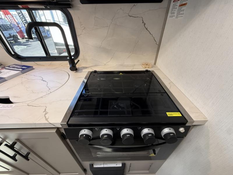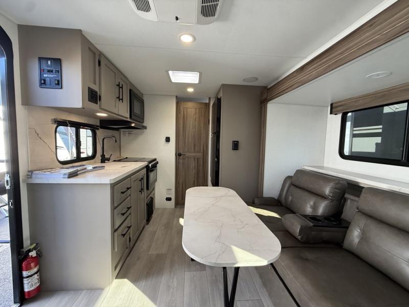 If you're wanting to upgrade from a tent to a travel trailer, this unit will be perfect for two to three campers. Instead of an air mattress, you'll sleep soundly on the front RV queen bed, and there are dual bedroom wardrobes so you don't have to live out of suitcases. The full rear bath is sure to come in handy, especially at night and you'll find more storage space here in the bath closet. When you're not wanting to grill on an open flame outdoors, the 17" oven with a three burner cooktop and the microwave oven will let you cook meals for your crew. There is also a 64" Jackknife sofa slide that will provide seating space, sleeping space for a guest, and extra floor space!
