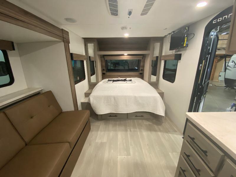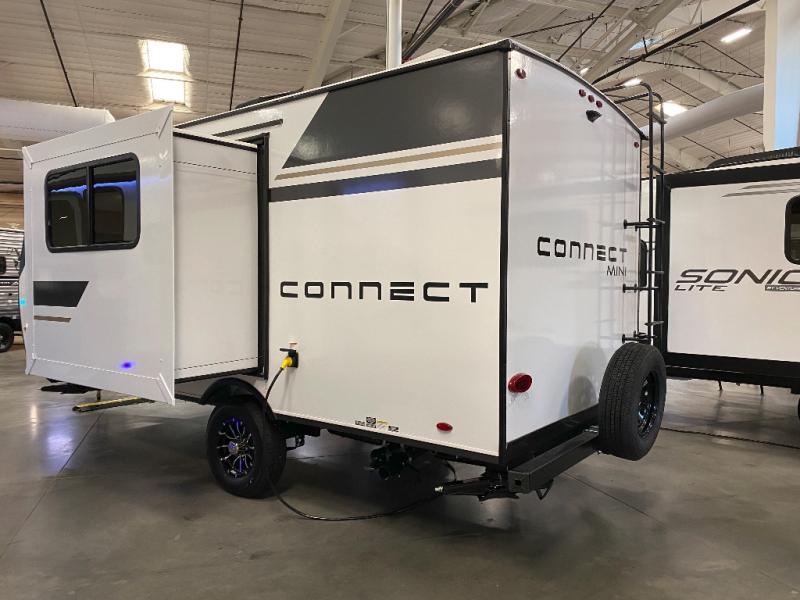 With any Connect Mini travel trailer by KZ, you will enjoy lightweight towing, interior comforts, and a price point you're sure to appreciate. Each model is constructed with durable 1-piece Tufflex material, 5/8" tongue and groove plywood flooring, and a molded fiberglass front cap with a windshield to let of your outdoor views in! You will love the look of the full glass friction hinged entry door, and the power awning with an LED light strip will provide a place to visit outdoors with friends and family. A hot and cold exterior shower also comes standard, along with a folding grab handle plus roof mounted solar prep and backup camera prep. Head inside to find residential grade linoleum, seamless countertops, roller shades, and painted hardwood cabinet doors. The 42,000 BTU tankless hot water heater will provide endless hot showers, and the low profile 13,500 BTU A/C will keep you comfortable during the summer!