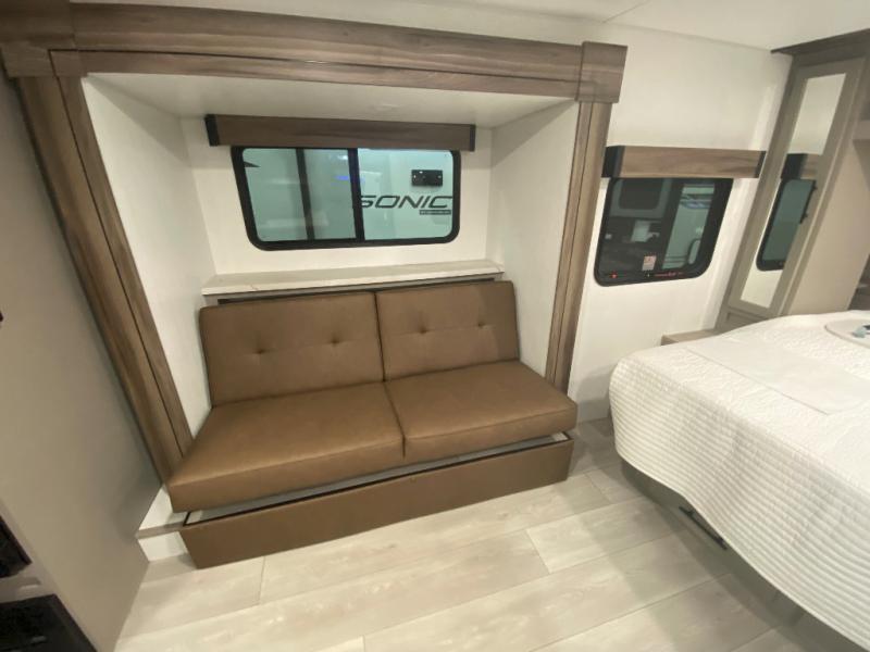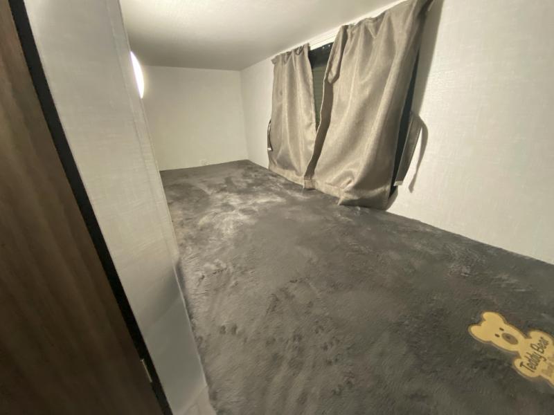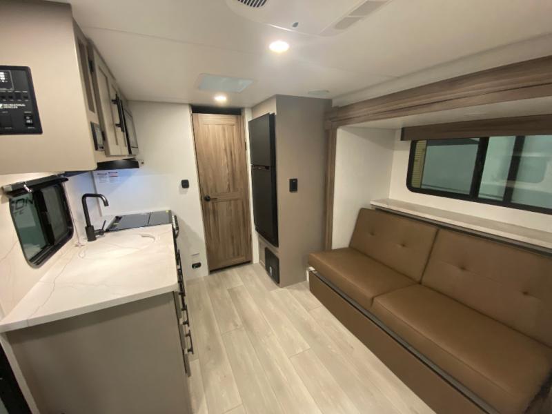If you're wanting to upgrade from a tent to a travel trailer, this unit will be perfect for two to three campers. Instead of an air mattress, you'll sleep soundly on the front RV queen bed, and there are dual bedroom wardrobes so you don't have to live out of suitcases. The full rear bath is sure to come in handy, especially at night and you'll find more storage space here in the bath closet. When you're not wanting to grill on an open flame outdoors, the 17" oven with a three burner cooktop and the microwave oven will let you cook meals for your crew. There is also a 64" Jackknife sofa slide that will provide seating space, sleeping space for a guest, and extra floor space!