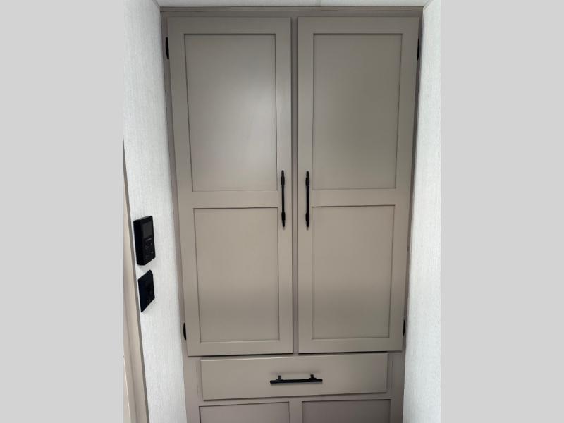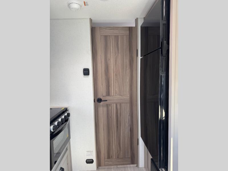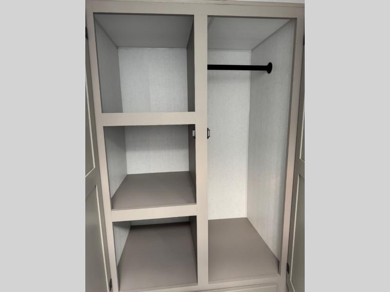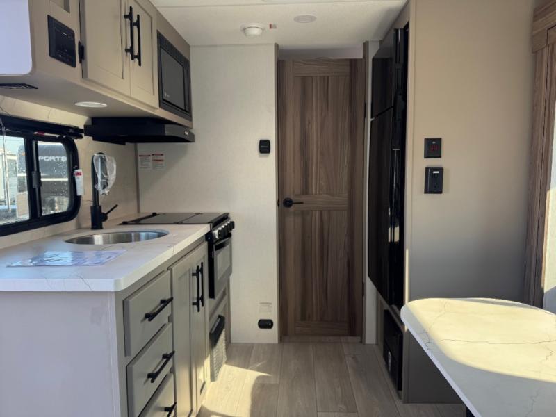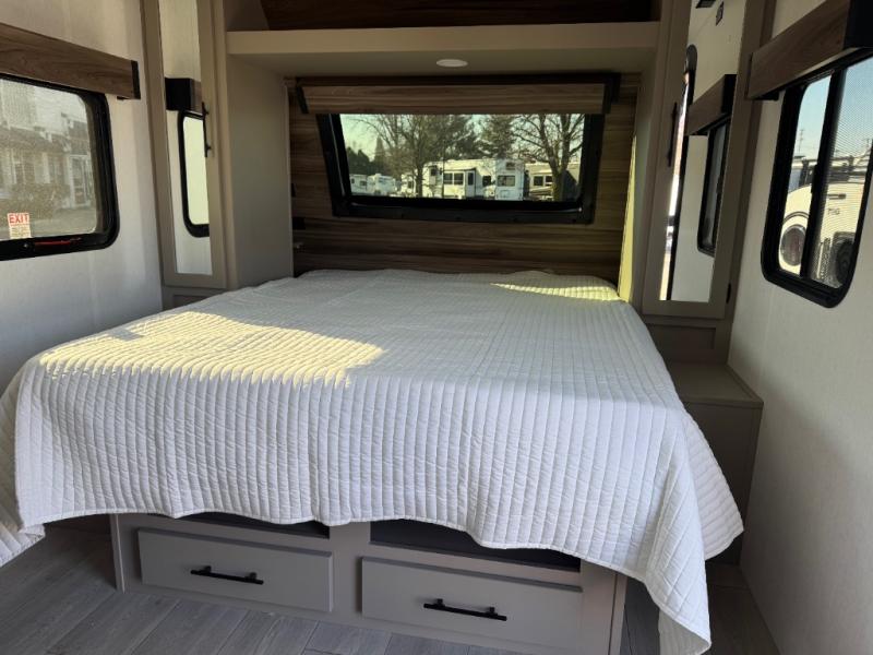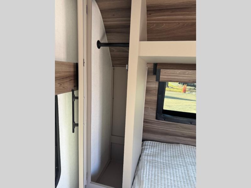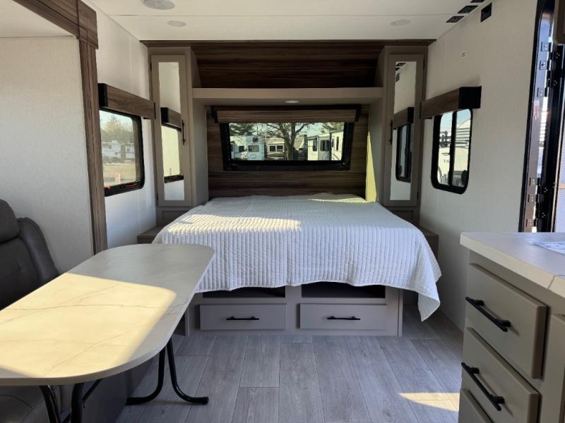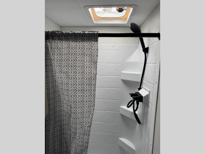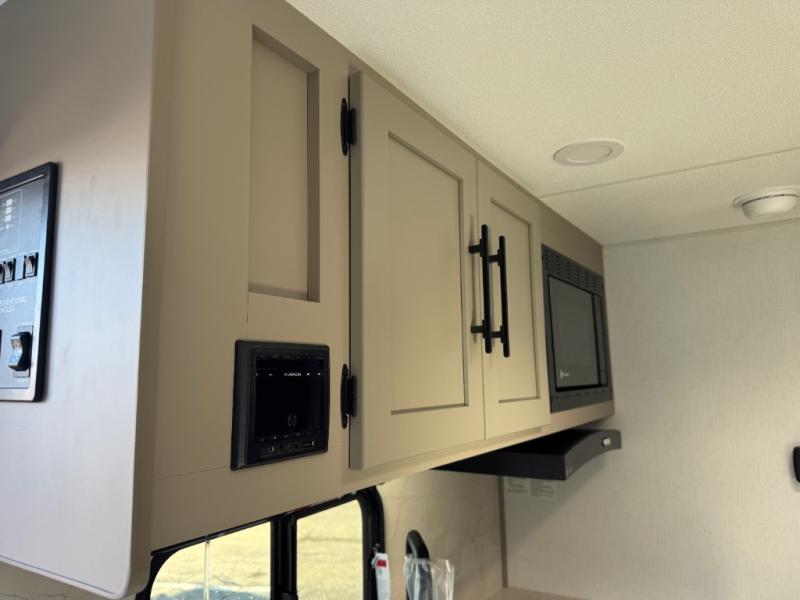 If you're wanting to upgrade from a tent to a travel trailer, this unit will be perfect for two to three campers. Instead of an air mattress, you'll sleep soundly on the front RV queen bed, and there are dual bedroom wardrobes so you don't have to live out of suitcases. The full rear bath is sure to come in handy, especially at night and you'll find more storage space here in the bath closet. When you're not wanting to grill on an open flame outdoors, the 17" oven with a three burner cooktop and the microwave oven will let you cook meals for your crew. There is also a 64" Jackknife sofa slide that will provide seating space, sleeping space for a guest, and extra floor space!