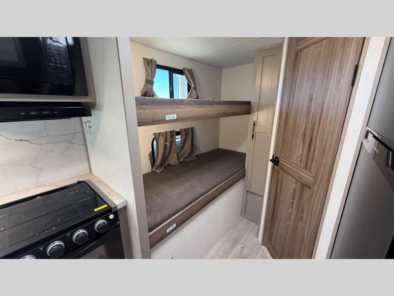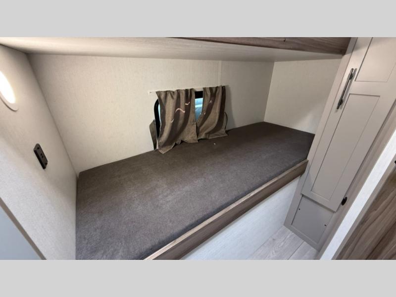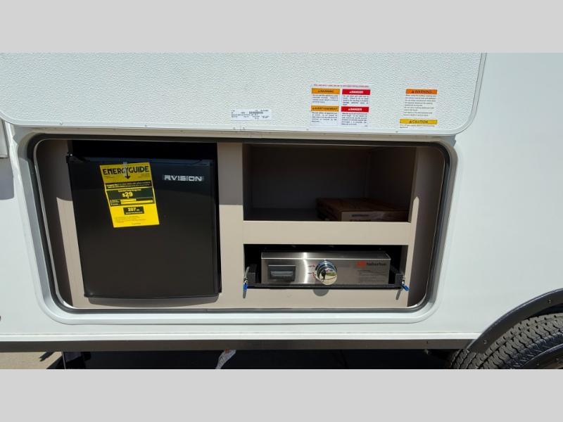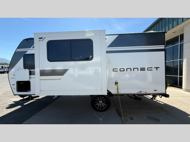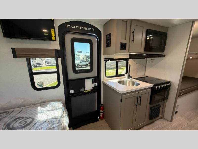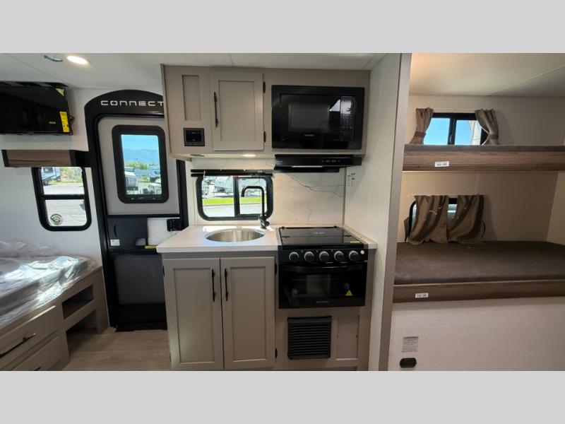 If you are looking for a little more sleeping space in a lightweight trailer, take a look at this Connect Mini. The 28" x 74" bunk beds will be perfect for guests or little ones, and the full bath is close by for easy nighttime use. You can take the front RV queen bed, and if you have any more guests, they can sleep on the booth dinette. A full kitchen, complete with a 17" oven and a microwave will let you cook breakfast each morning, and the radio included will let you listen to your favorite tunes. There is also an outside kitchen with a griddle and a refrigerator, exterior trunk doors, plus a 14' power awning with LED lights!
