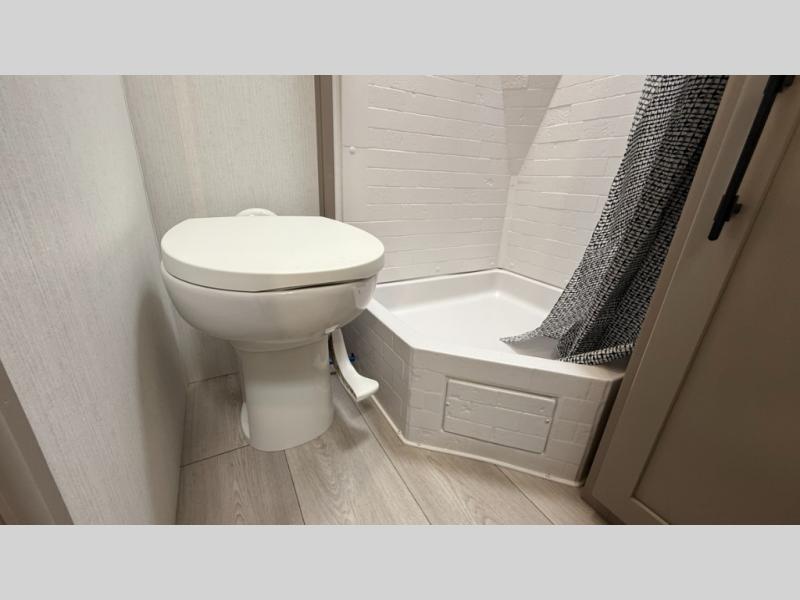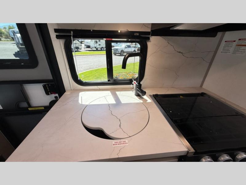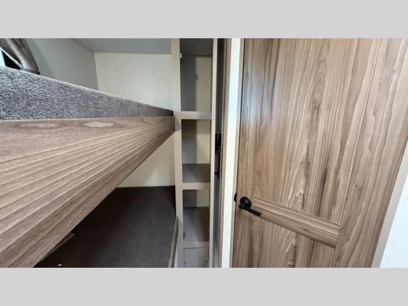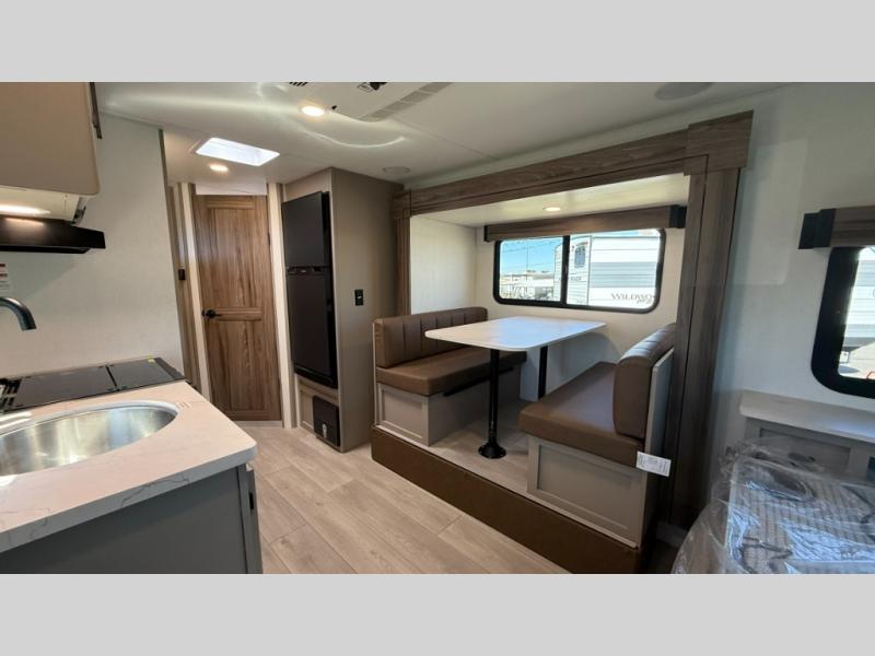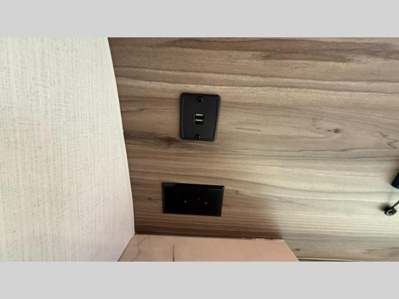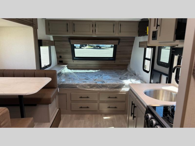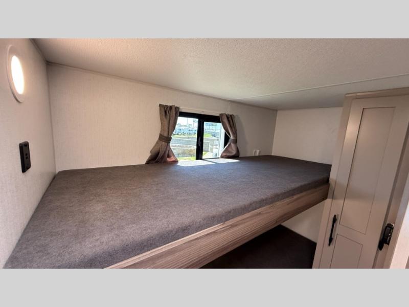 If you are looking for a little more sleeping space in a lightweight trailer, take a look at this Connect Mini. The 28" x 74" bunk beds will be perfect for guests or little ones, and the full bath is close by for easy nighttime use. You can take the front RV queen bed, and if you have any more guests, they can sleep on the booth dinette. A full kitchen, complete with a 17" oven and a microwave will let you cook breakfast each morning, and the radio included will let you listen to your favorite tunes. There is also an outside kitchen with a griddle and a refrigerator, exterior trunk doors, plus a 14' power awning with LED lights!