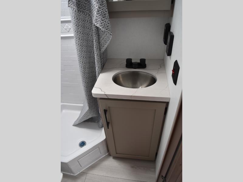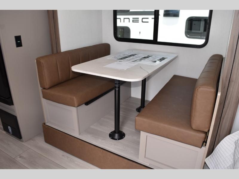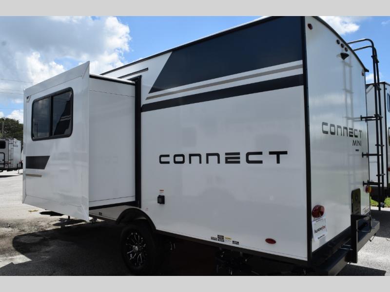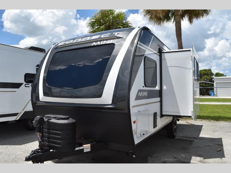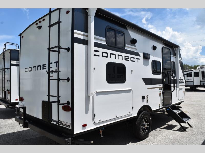 With any Connect Mini travel trailer by KZ, you will enjoy lightweight towing, interior comforts, and a price point you're sure to appreciate. Each model is constructed with durable 1-piece Tufflex material, 5/8" tongue and groove plywood flooring, and a molded fiberglass front cap with a windshield to let of your outdoor views in! You will love the look of the full glass friction hinged entry door, and the power awning with an LED light strip will provide a place to visit outdoors with friends and family. A hot and cold exterior shower also comes standard, along with nitrogen filled tires, a folding grab handle plus roof mounted solar prep and backup camera prep. Head inside to find residential grade linoleum, seamless countertops, roller shades, and painted hardwood cabinet doors. The 42,000 BTU tankless hot water heater will provide endless hot showers, and the low profile 13,500 BTU A/C will keep you comfortable during the summer!