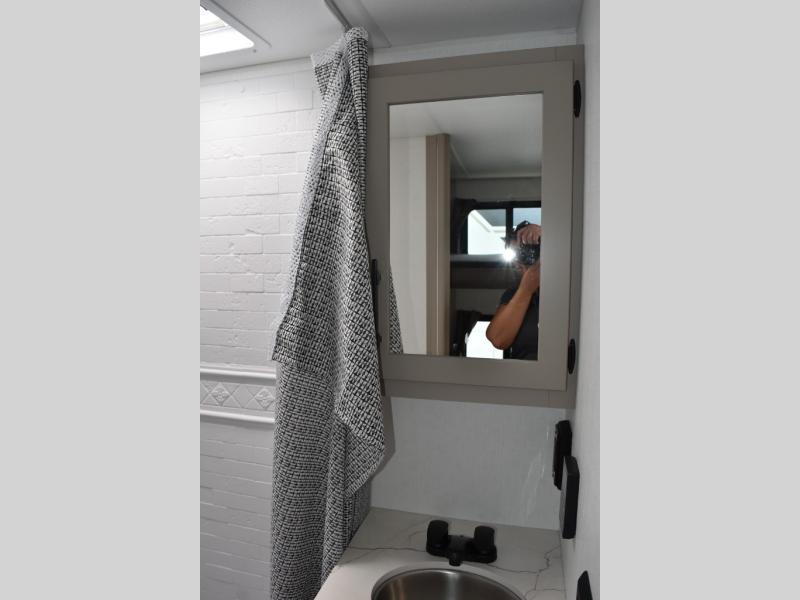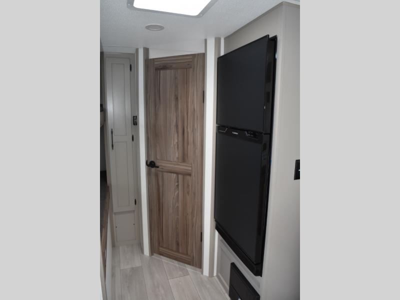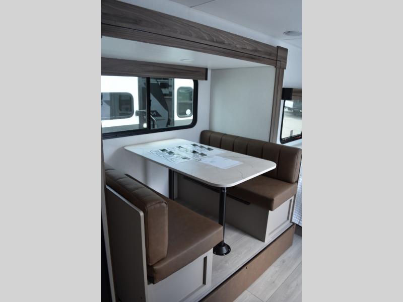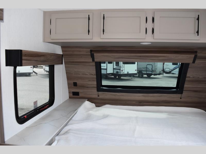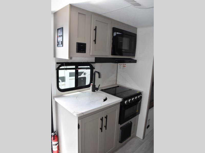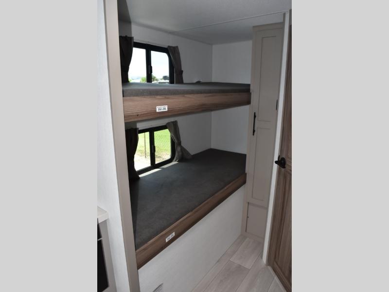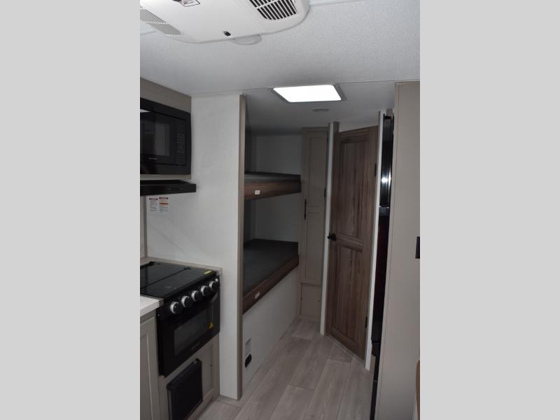 If you are looking for a little more sleeping space in a lightweight trailer, take a look at this Connect Mini. The 28" x 74" bunk beds will be perfect for guests or little ones, and the full bath is close by for easy nighttime use. You can take the front RV queen bed, and if you have any more guests, they can sleep on the booth dinette. A full kitchen, complete with a 17" oven and a microwave will let you cook breakfast each morning, and the radio included will let you listen to your favorite tunes. There is also an outside kitchen with a griddle and a refrigerator, exterior trunk doors, plus a 14' power awning with LED lights!