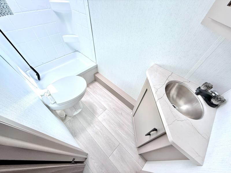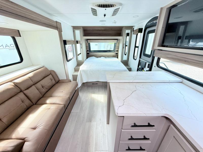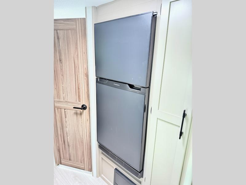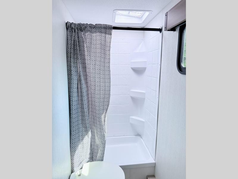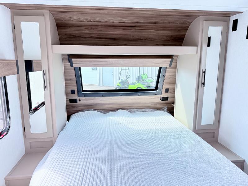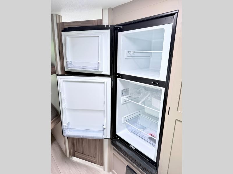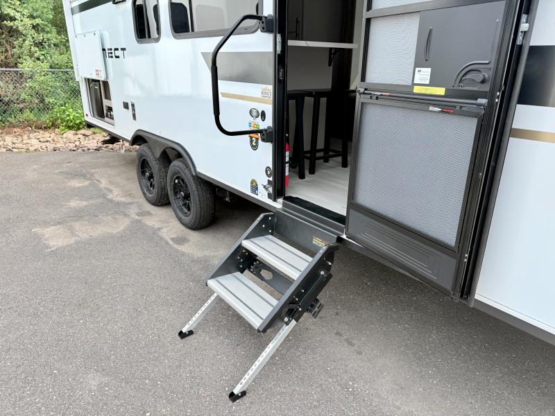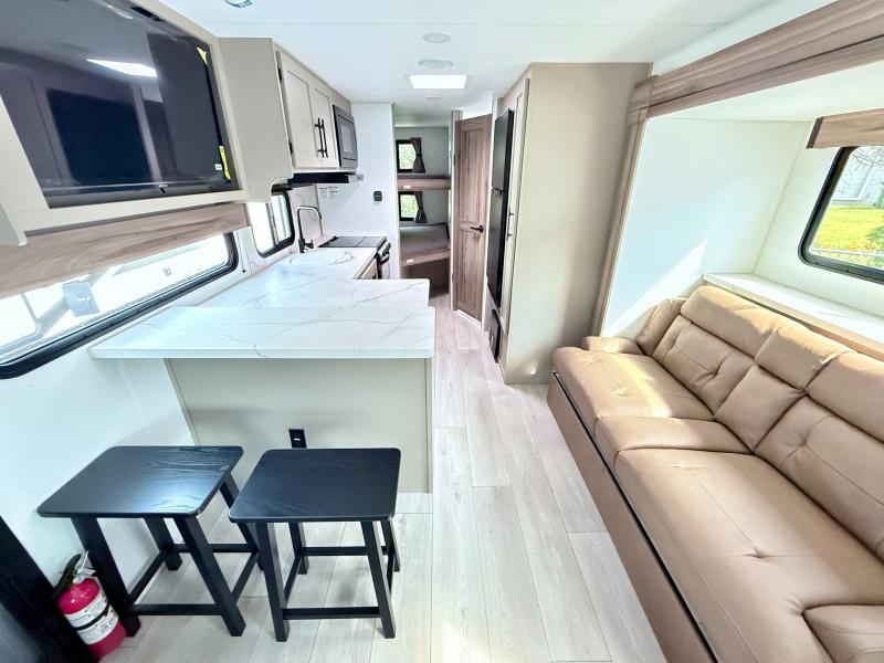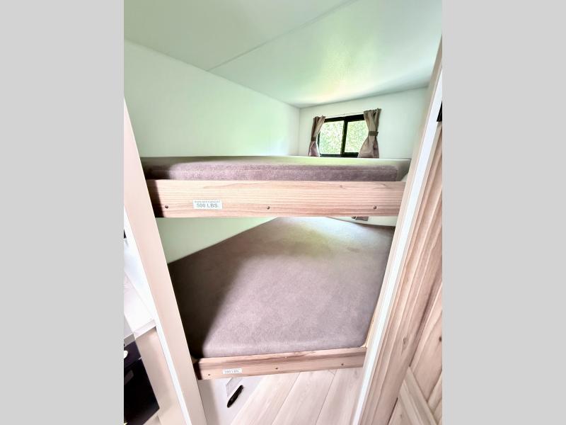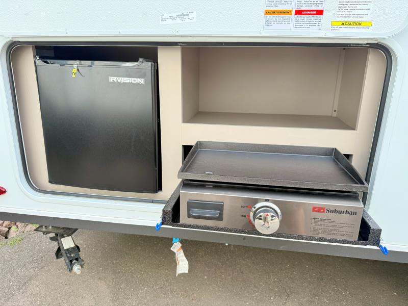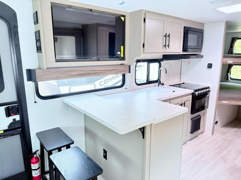 This travel trailer is the biggest in the Connect Mini lineup and you're sure to love it! There are double-size bunks for guests or little ones and a front RV queen bed for you! The slide out with a jackknife sofa and table will provide a place to relax and enjoy a meal together, and there is additional seating at the bar top with two stools. There is plenty of storage space found with this model, including dual bedroom closets, a pass-through storage, plus a pass-thru storage up front for fishing poles, hiking gear, and more! You will also love having an outside kitchen to cook meals when the weather is nice!
