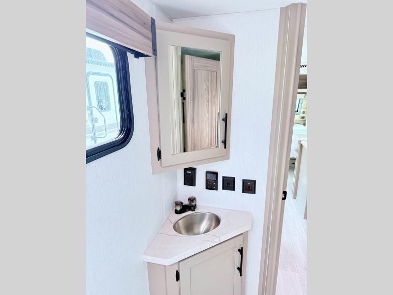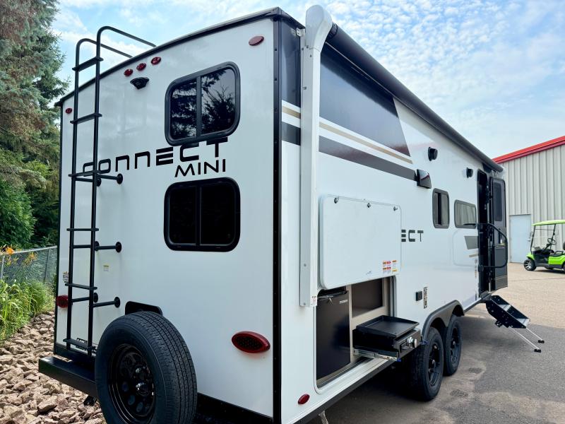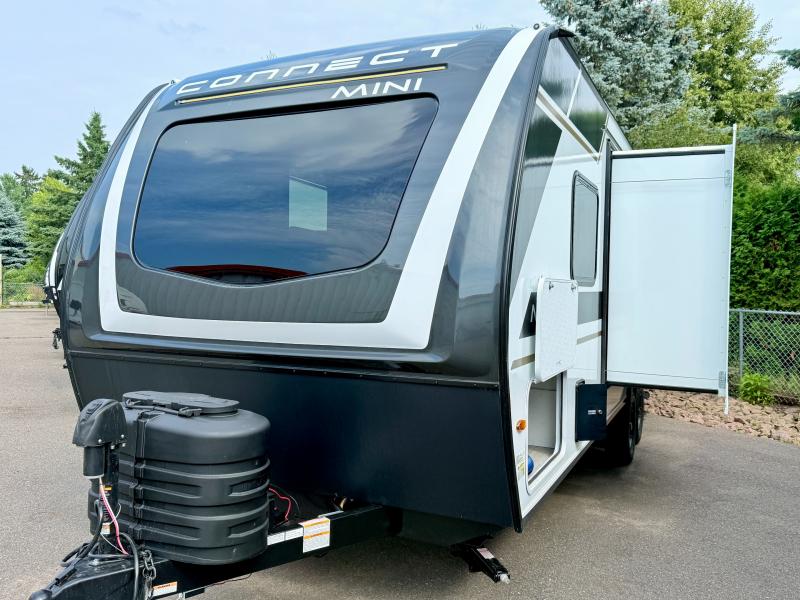 With any Connect Mini travel trailer by KZ, you will enjoy lightweight towing, interior comforts, and a price point you're sure to appreciate. Each model is constructed with durable 1-piece Tufflex material, 5/8" tongue and groove plywood flooring, and a molded fiberglass front cap with a windshield to let of your outdoor views in! You will love the look of the full glass friction hinged entry door, and the power awning with an LED light strip will provide a place to visit outdoors with friends and family. A hot and cold exterior shower also comes standard, along with nitrogen filled tires, a folding grab handle plus roof mounted solar prep and backup camera prep. Head inside to find residential grade linoleum, seamless countertops, roller shades, and painted hardwood cabinet doors. The 42,000 BTU tankless hot water heater will provide endless hot showers, and the low profile 13,500 BTU A/C will keep you comfortable during the summer!