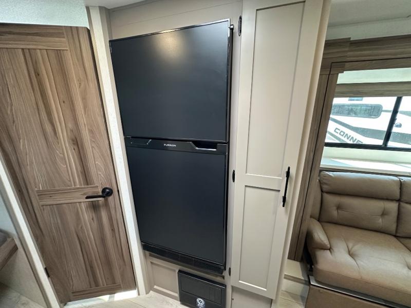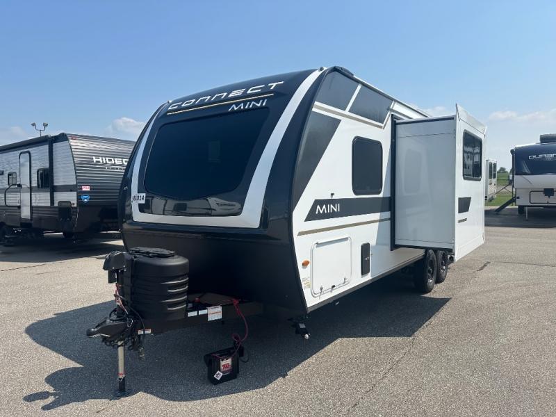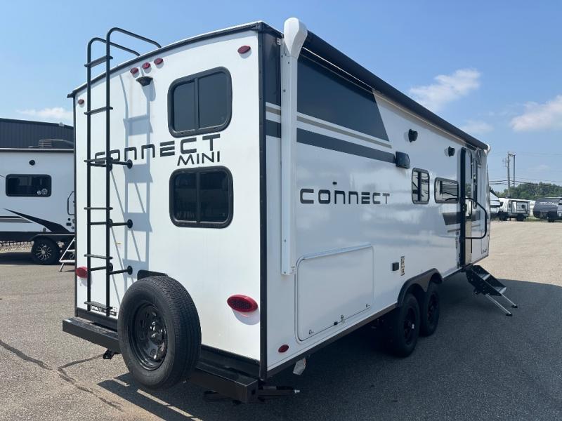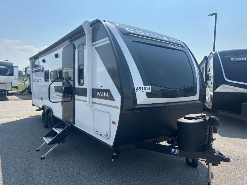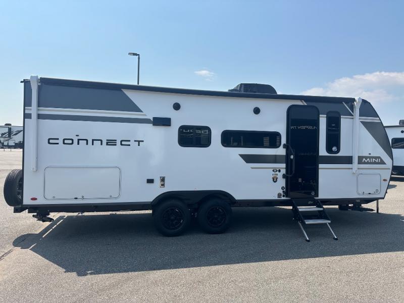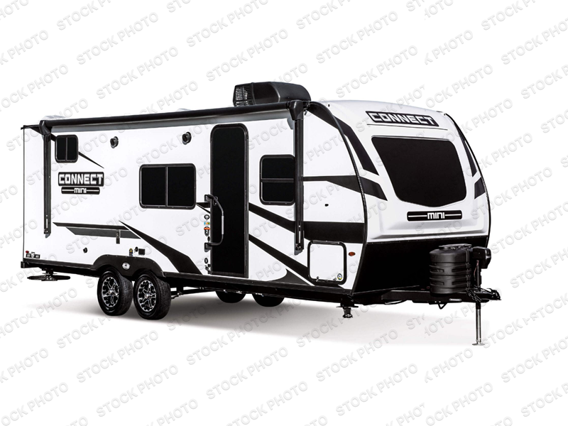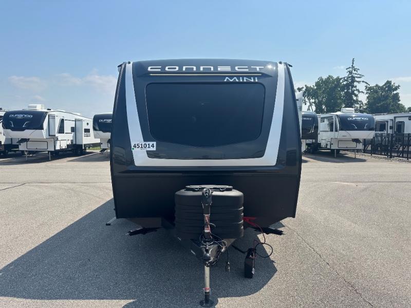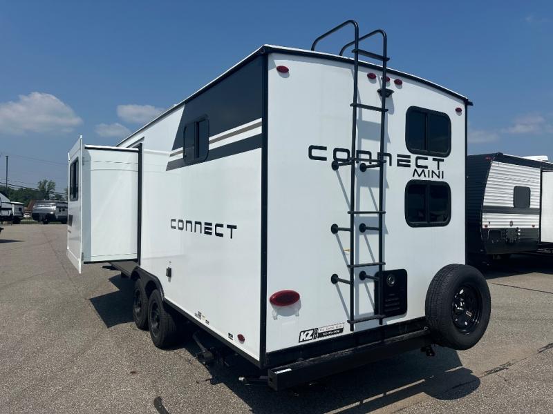 With any Connect Mini travel trailer by KZ, you will enjoy lightweight towing, interior comforts, and a price point you're sure to appreciate. Each model is constructed with durable 1-piece Tufflex material, 5/8" tongue and groove plywood flooring, and a molded fiberglass front cap with a windshield to let of your outdoor views in! You will love the look of the full glass friction hinged entry door, and the power awning with an LED light strip will provide a place to visit outdoors with friends and family. A hot and cold exterior shower also comes standard, along with nitrogen filled tires, a folding grab handle plus roof mounted solar prep and backup camera prep. Head inside to find residential grade linoleum, seamless countertops, roller shades, and painted hardwood cabinet doors. The 42,000 BTU tankless hot water heater will provide endless hot showers, and the low profile 13,500 BTU A/C will keep you comfortable during the summer!