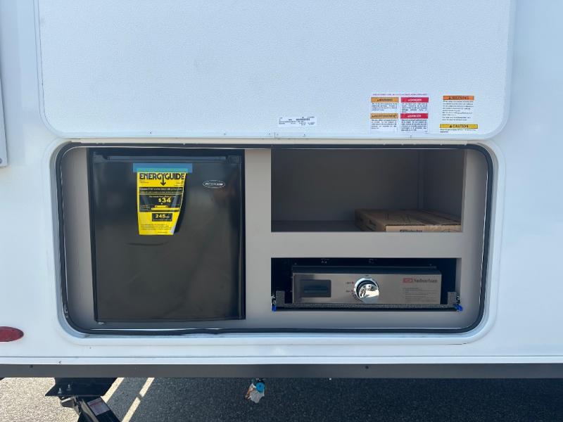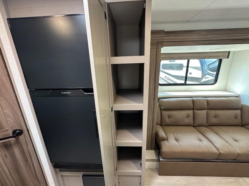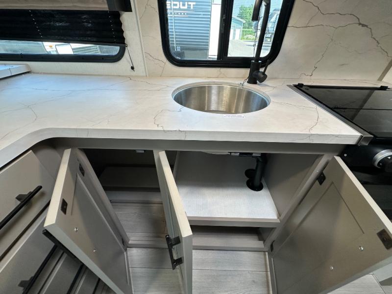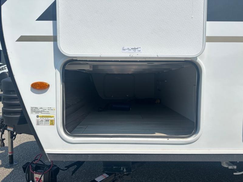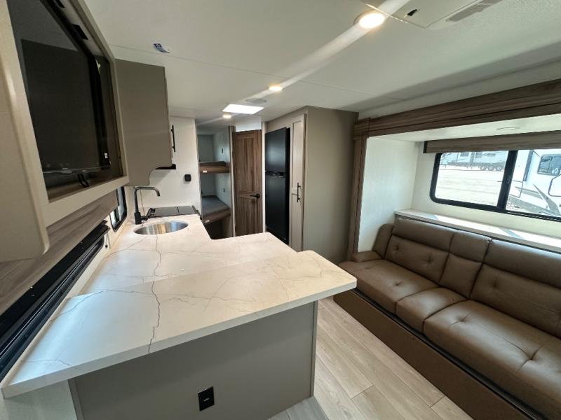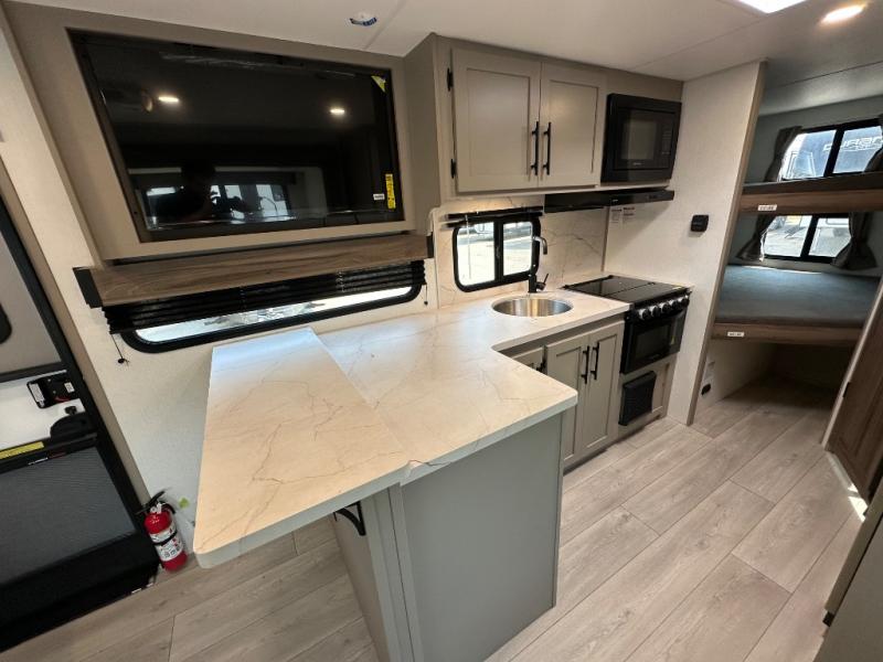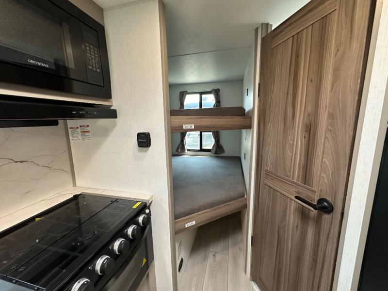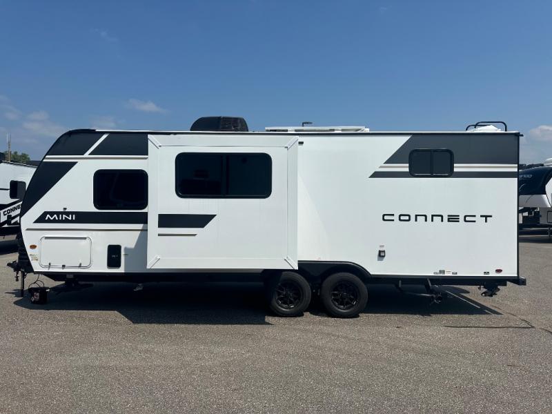 This travel trailer is the biggest in the Connect Mini lineup and you're sure to love it! There are double-size bunks for guests or little ones and a front RV queen bed for you! The slide out with a jackknife sofa and table will provide a place to relax and enjoy a meal together, and there is additional seating at the bar top with two stools. There is plenty of storage space found with this model, including dual bedroom closets, a pass-through storage, plus a pass-thru storage up front for fishing poles, hiking gear, and more! You will also love having an outside kitchen to cook meals when the weather is nice!