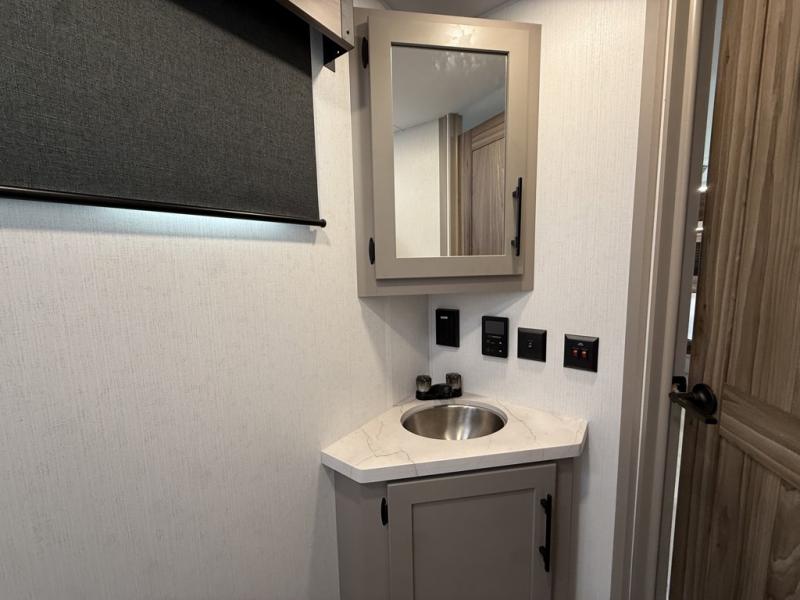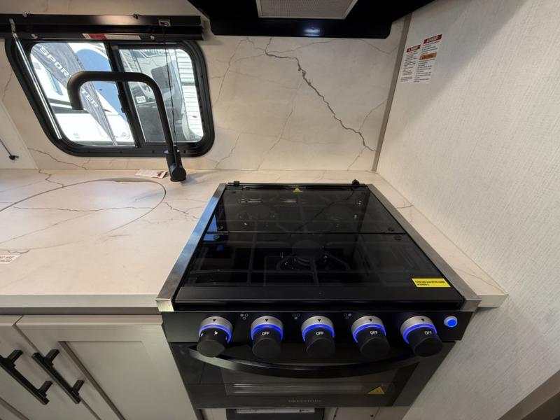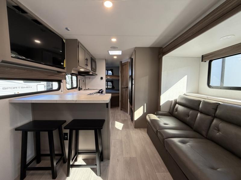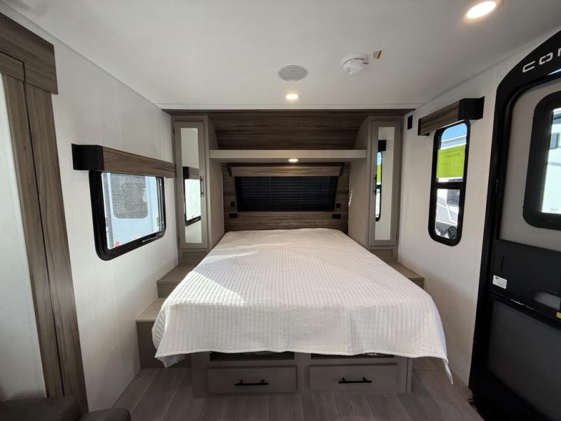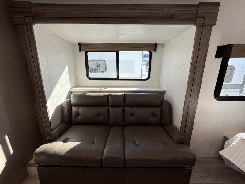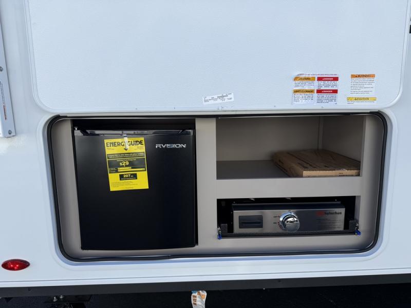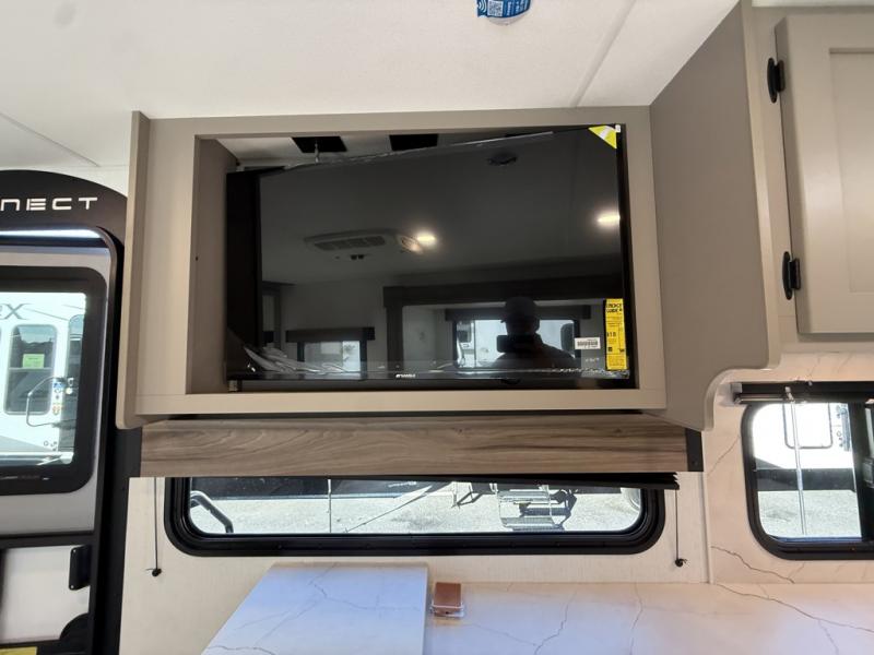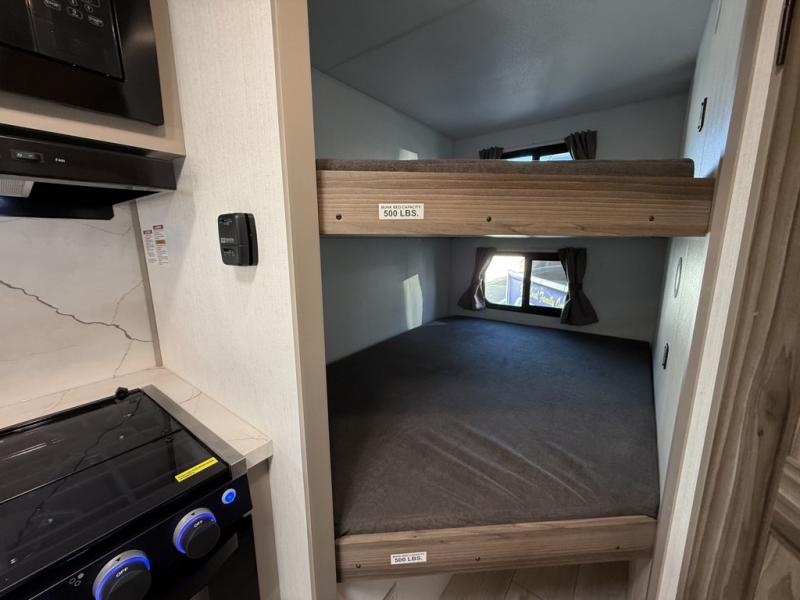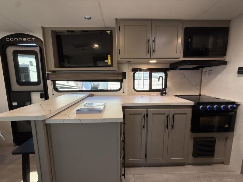 This travel trailer is the biggest in the Connect Mini lineup and you're sure to love it! There are double-size bunks for guests or little ones and a front RV queen bed for you! The slide out with a jackknife sofa and table will provide a place to relax and enjoy a meal together, and there is additional seating at the bar top with two stools. There is plenty of storage space found with this model, including dual bedroom closets, a pass-through storage, plus a pass-thru storage up front for fishing poles, hiking gear, and more! You will also love having an outside kitchen to cook meals when the weather is nice!