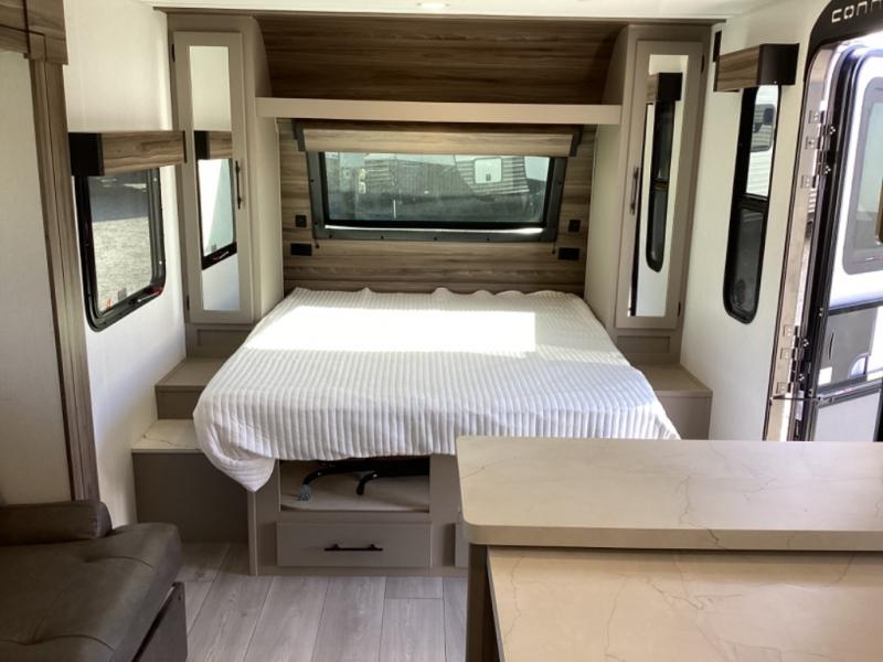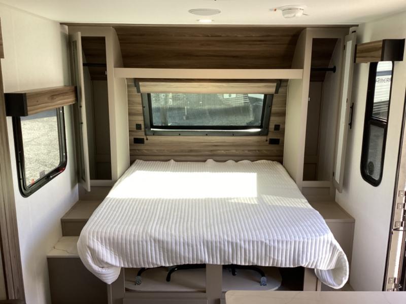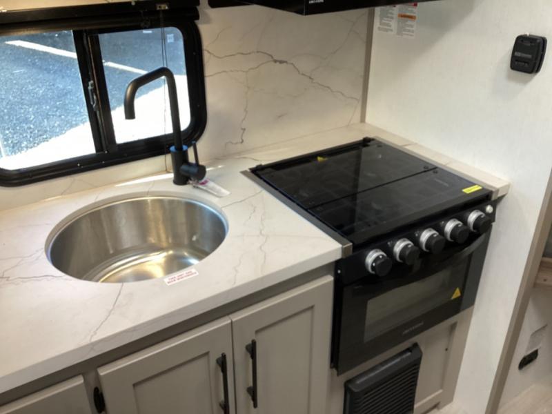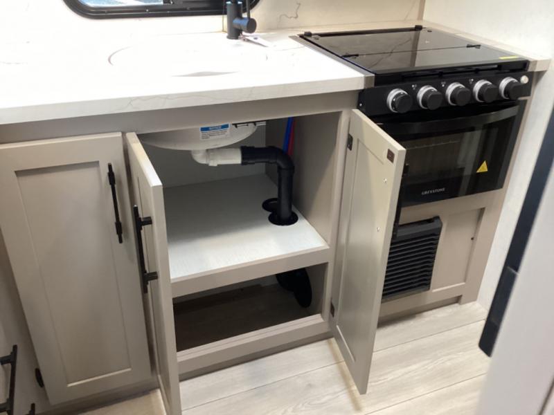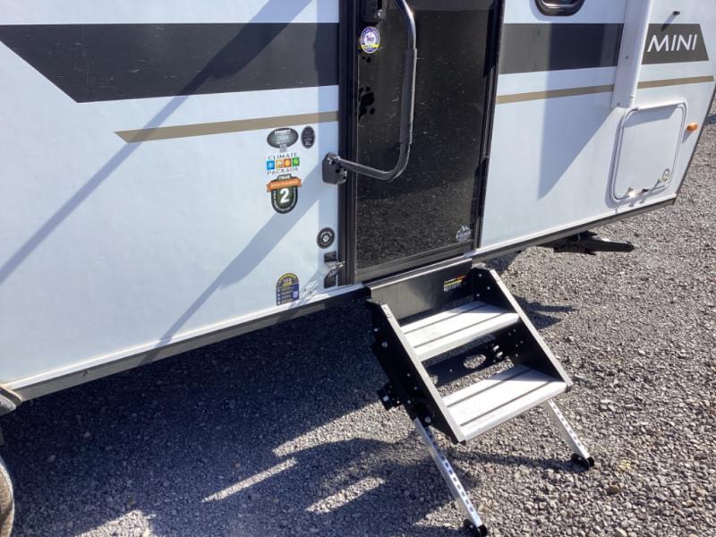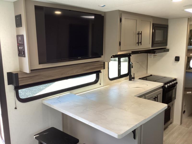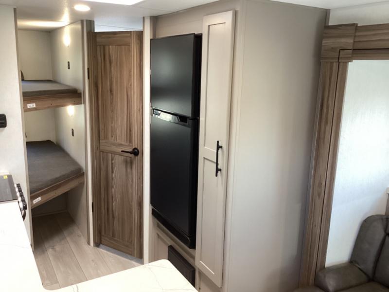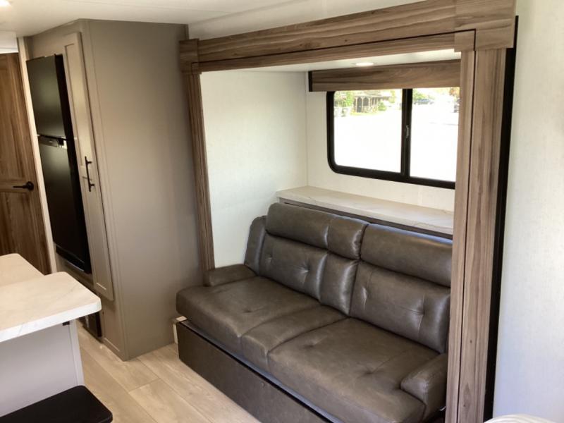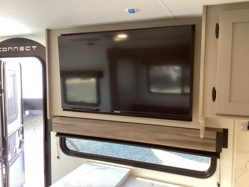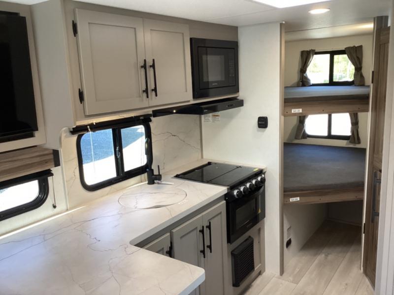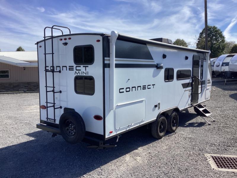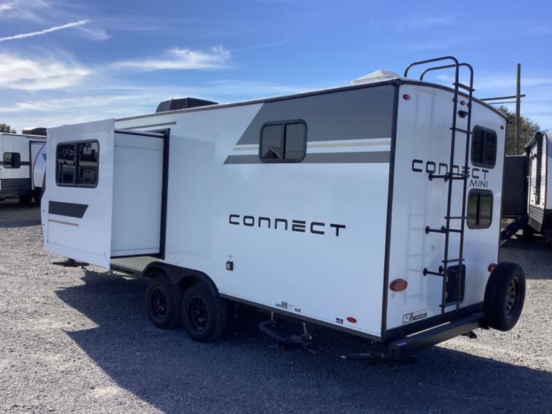 This travel trailer is the biggest in the Connect Mini lineup and you're sure to love it! There are double-size bunks for guests or little ones and a front RV queen bed for you! The slide out with a jackknife sofa and table will provide a place to relax and enjoy a meal together, and there is additional seating at the bar top with two stools. There is plenty of storage space found with this model, including dual bedroom closets, a pass-through storage, plus a pass-thru storage up front for fishing poles, hiking gear, and more! You will also love having an outside kitchen to cook meals when the weather is nice!