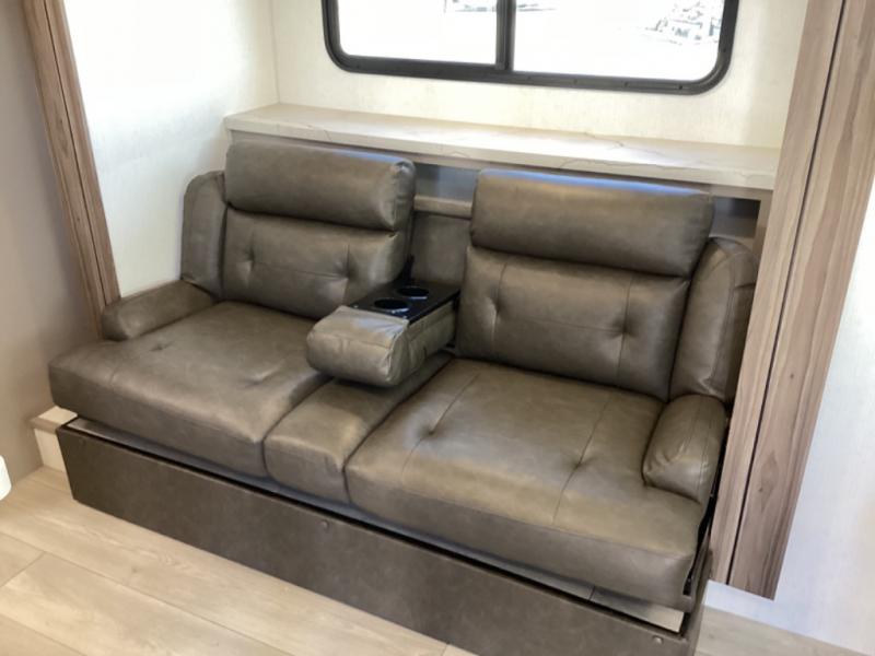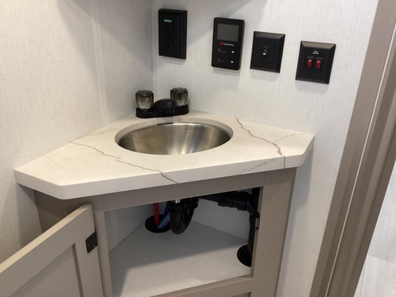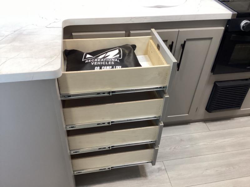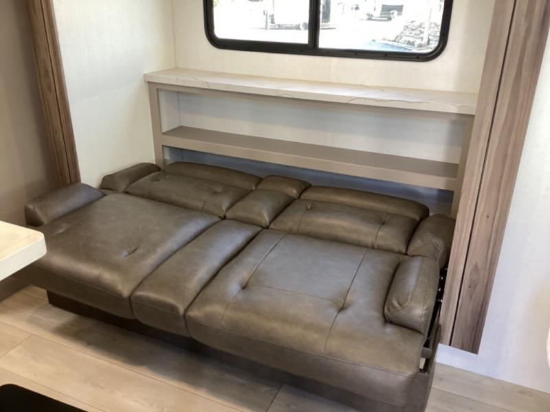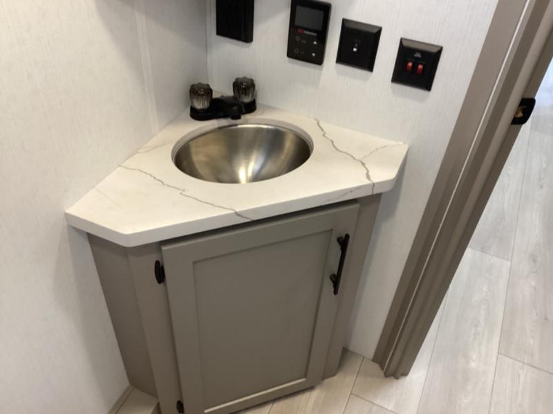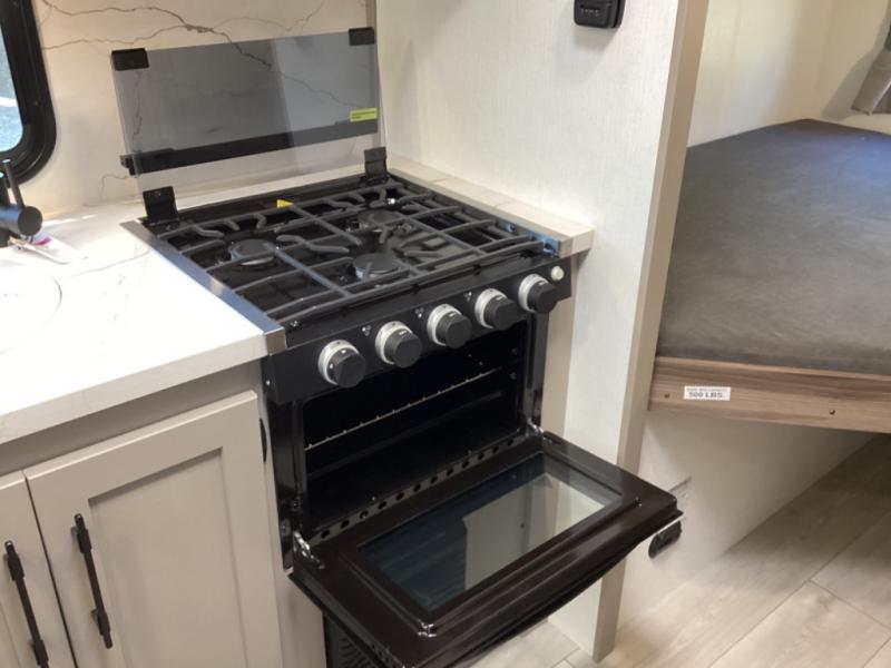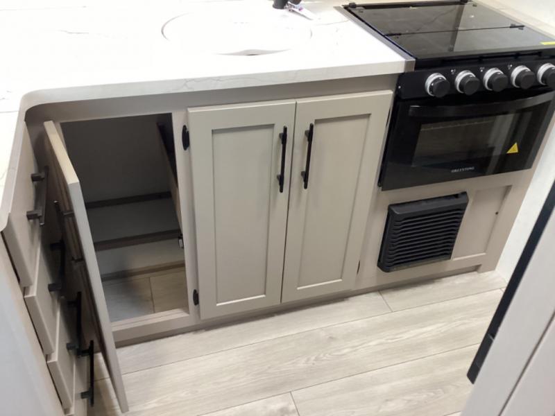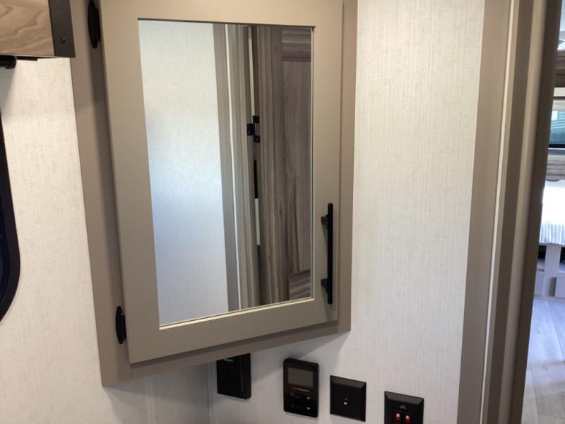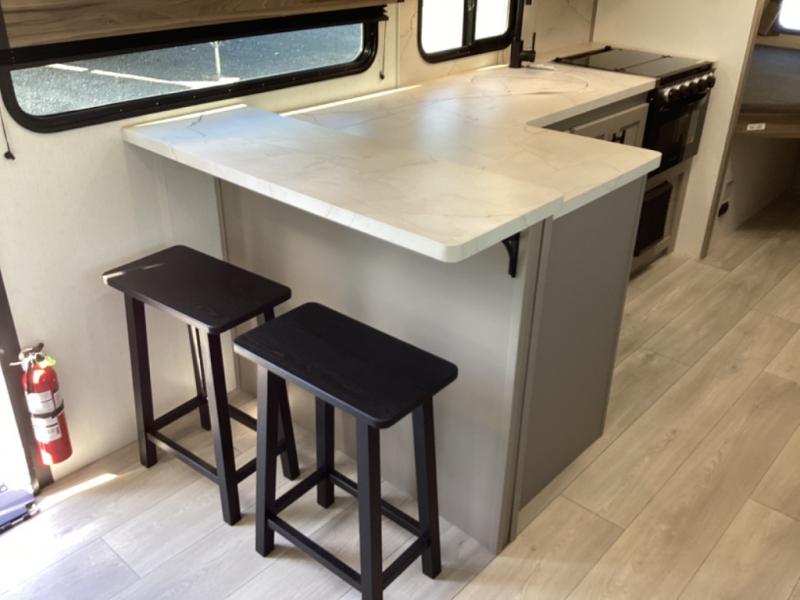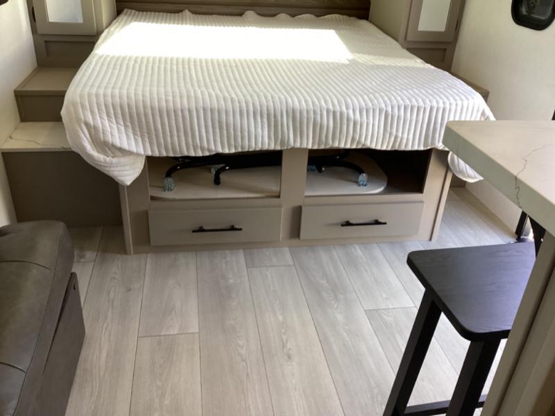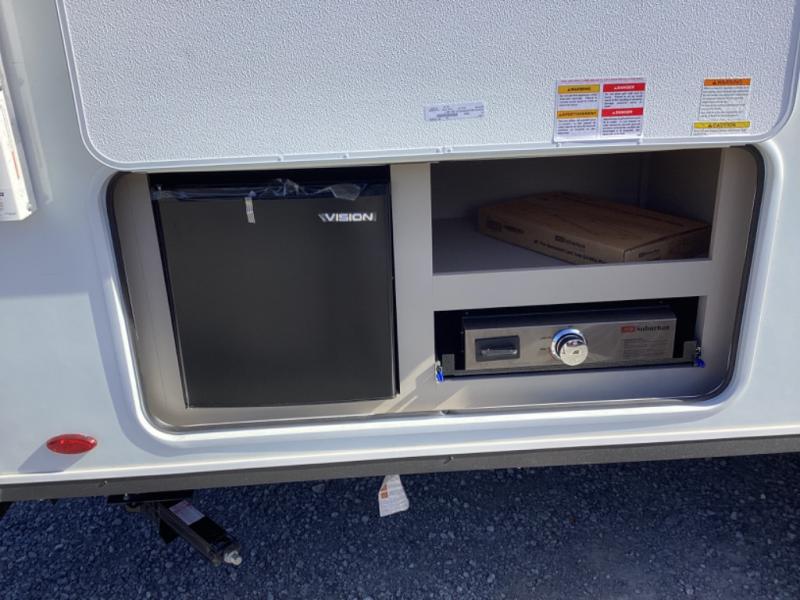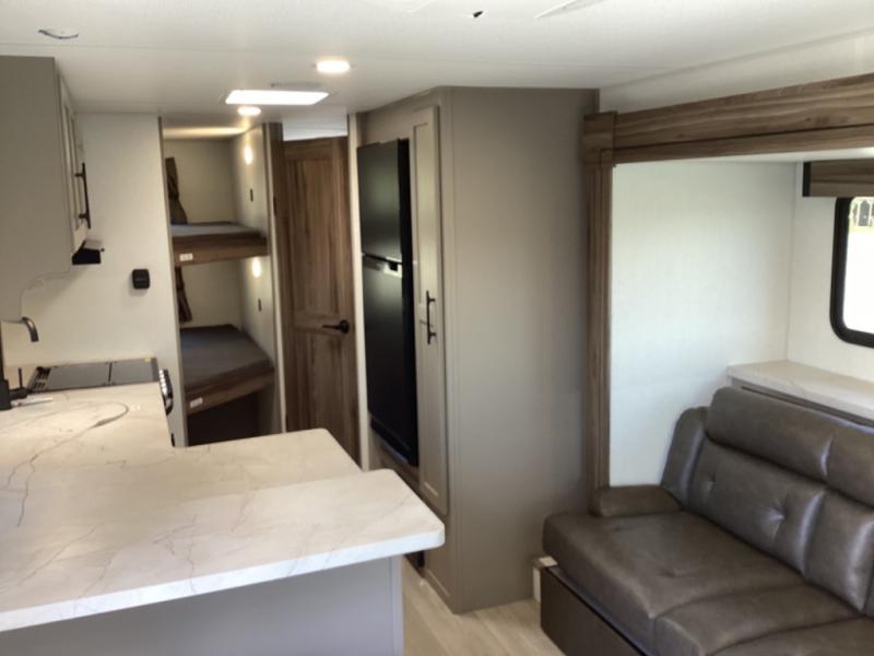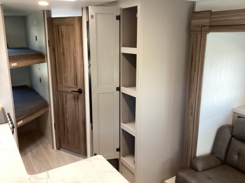 This travel trailer is the biggest in the Connect Mini lineup and you're sure to love it! There are double-size bunks for guests or little ones and a front RV queen bed for you! The slide out with a jackknife sofa and table will provide a place to relax and enjoy a meal together, and there is additional seating at the bar top with two stools. There is plenty of storage space found with this model, including dual bedroom closets, a pass-through storage, plus a pass-thru storage up front for fishing poles, hiking gear, and more! You will also love having an outside kitchen to cook meals when the weather is nice!