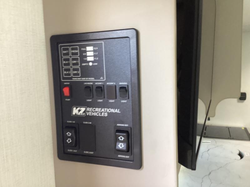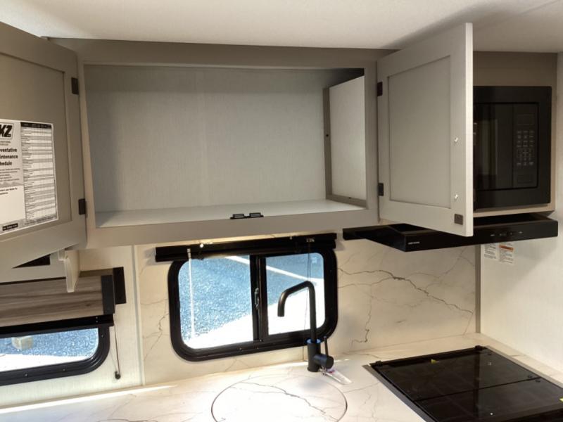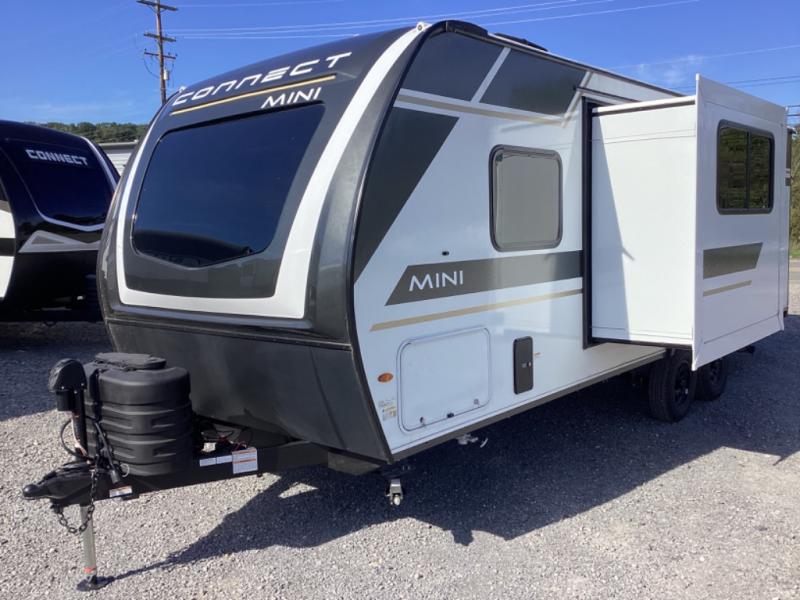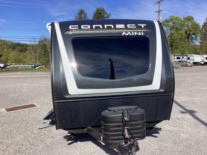With any Connect Mini travel trailer by KZ, you will enjoy lightweight towing, interior comforts, and a price point you're sure to appreciate. Each model is constructed with durable 1-piece Tufflex material, 5/8" tongue and groove plywood flooring, and a molded fiberglass front cap with a windshield to let of your outdoor views in! You will love the look of the full glass friction hinged entry door, and the power awning with an LED light strip will provide a place to visit outdoors with friends and family. A hot and cold exterior shower also comes standard, along with a folding grab handle plus roof mounted solar prep and backup camera prep. Head inside to find residential grade linoleum, seamless countertops, roller shades, and painted hardwood cabinet doors. The 42,000 BTU tankless hot water heater will provide endless hot showers, and the low profile 13,500 BTU A/C will keep you comfortable during the summer!