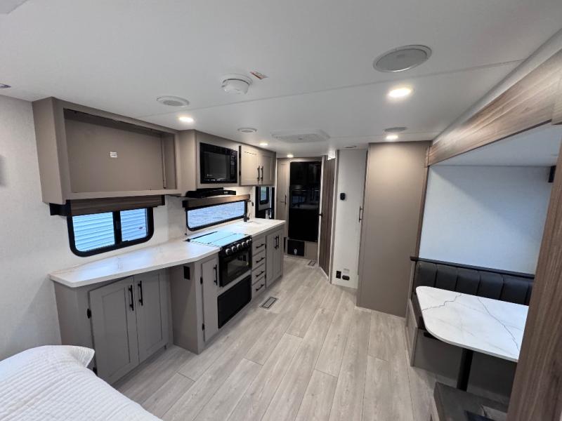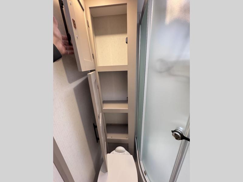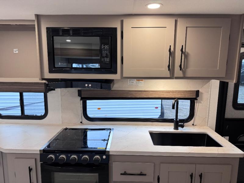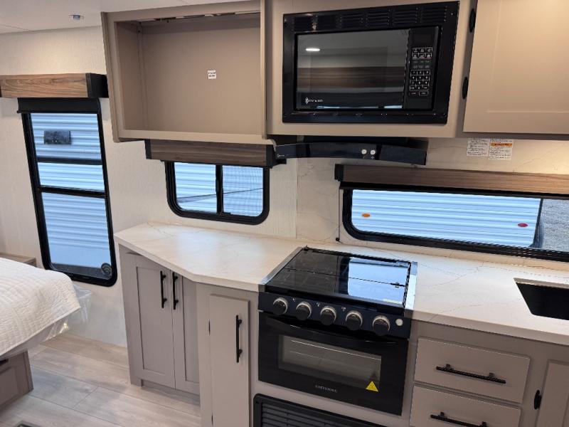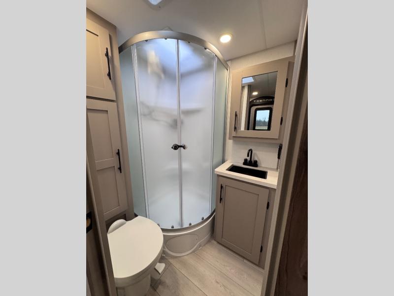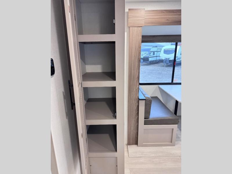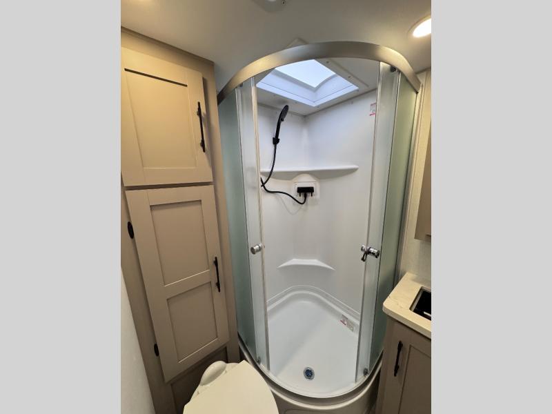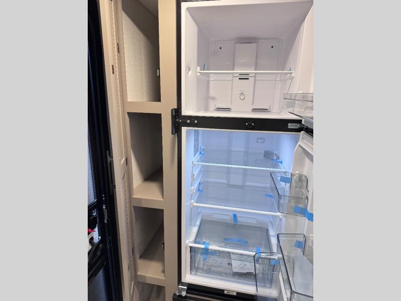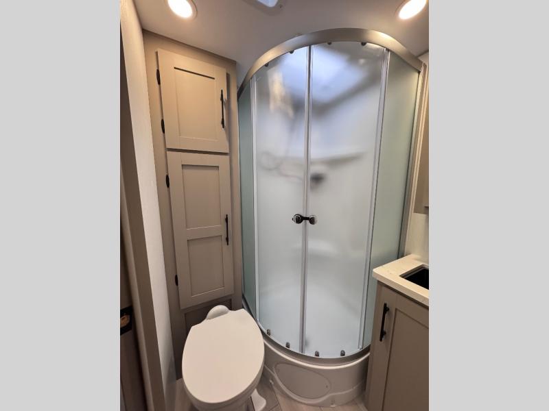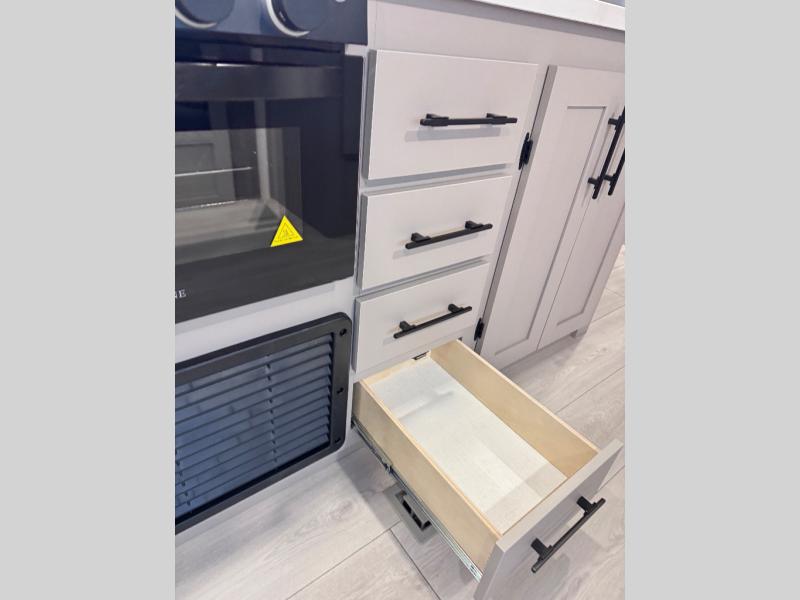 Step inside and you’ll find a thoughtfully designed layout built for both comfort and convenience. At the front, a full bedroom welcomes you with a cozy queen bed, ensuring a restful night’s sleep after a day of adventure, along with wardrobes on each side to neatly store your clothing and essentials. Moving into the center, the kitchen showcases seamless countertops, a deep undermount stainless steel sink, a three-burner range with oven, and a microwave everything you need to prepare and heat up your favorite meals with ease. Across in the slide-out, the spacious 42" dinette offers the perfect spot to enjoy dinner or gather for a board game, with a nearby pantry providing ample storage for dry goods. In the rear corner, a 10 cu. ft. 12V refrigerator keeps your groceries fresh, complemented by an additional wardrobe for extra storage. Opposite, the full bathroom features a generous 34" x 34" shower, allowing you to freshen up comfortably without relying on campsite facilities.