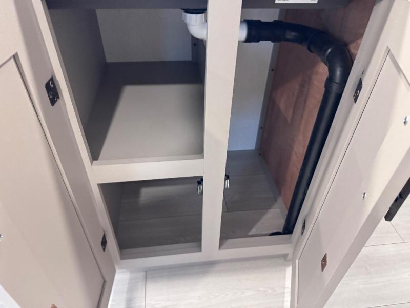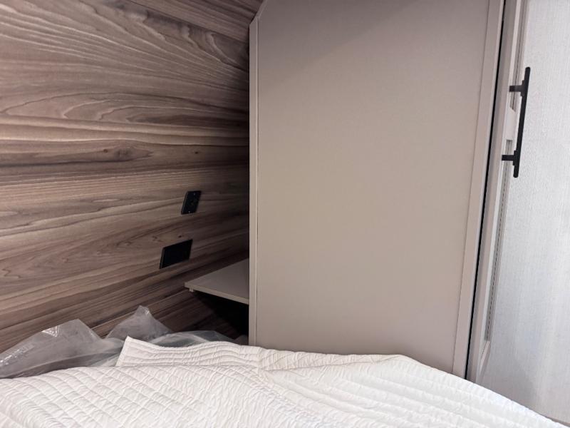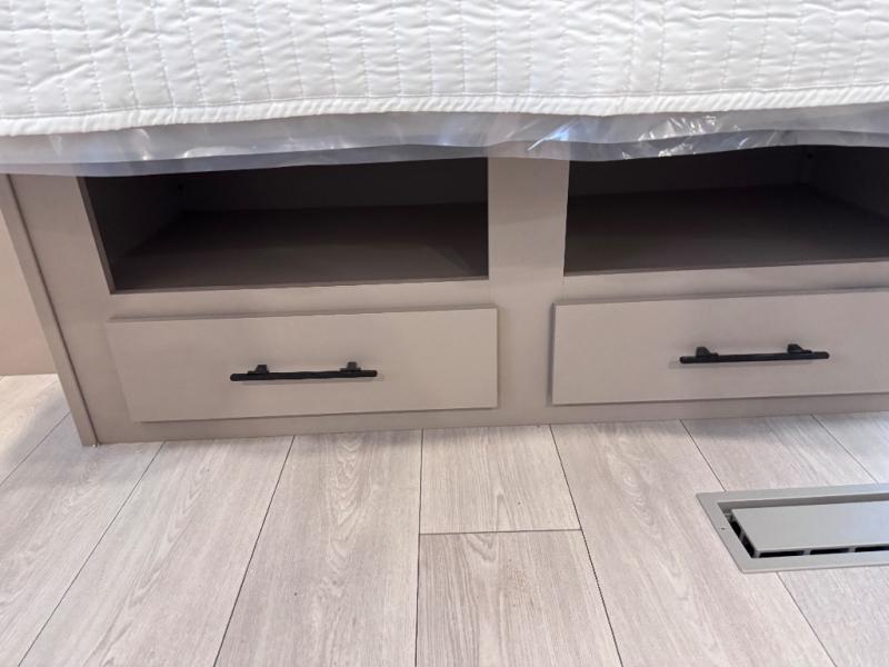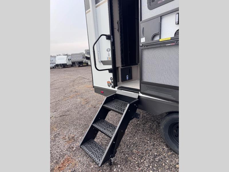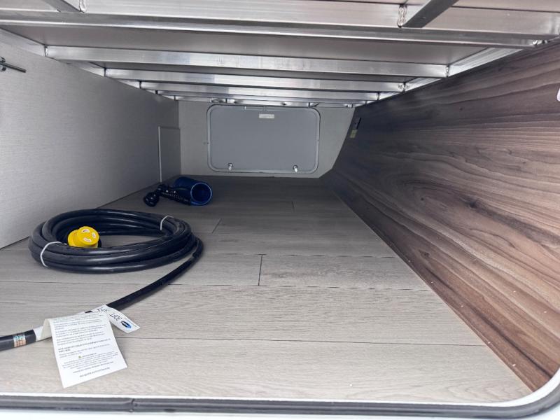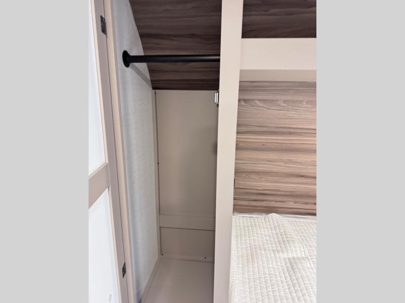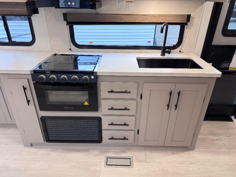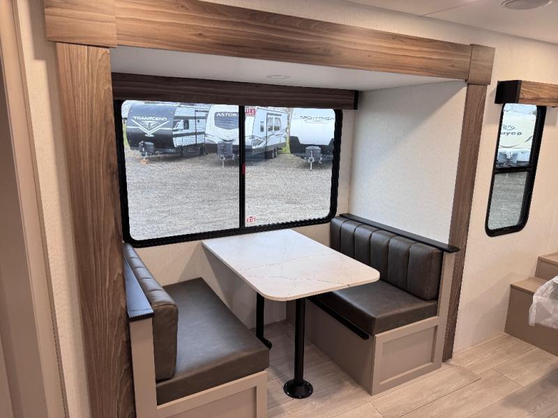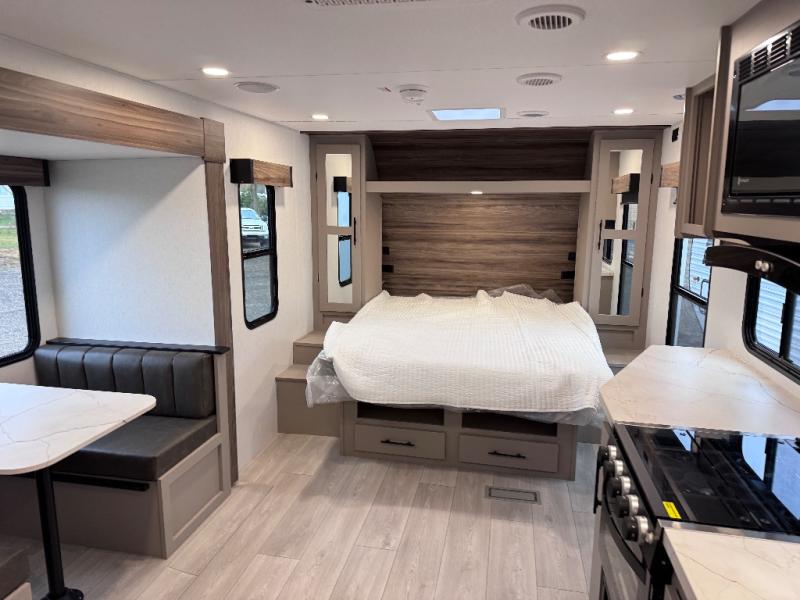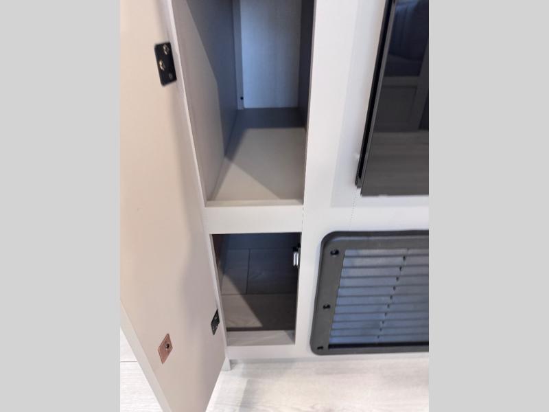 Step inside and you’ll find a thoughtfully designed layout built for both comfort and convenience. At the front, a full bedroom welcomes you with a cozy queen bed, ensuring a restful night’s sleep after a day of adventure, along with wardrobes on each side to neatly store your clothing and essentials. Moving into the center, the kitchen showcases seamless countertops, a deep undermount stainless steel sink, a three-burner range with oven, and a microwave everything you need to prepare and heat up your favorite meals with ease. Across in the slide-out, the spacious 42" dinette offers the perfect spot to enjoy dinner or gather for a board game, with a nearby pantry providing ample storage for dry goods. In the rear corner, a 10 cu. ft. 12V refrigerator keeps your groceries fresh, complemented by an additional wardrobe for extra storage. Opposite, the full bathroom features a generous 34" x 34" shower, allowing you to freshen up comfortably without relying on campsite facilities.