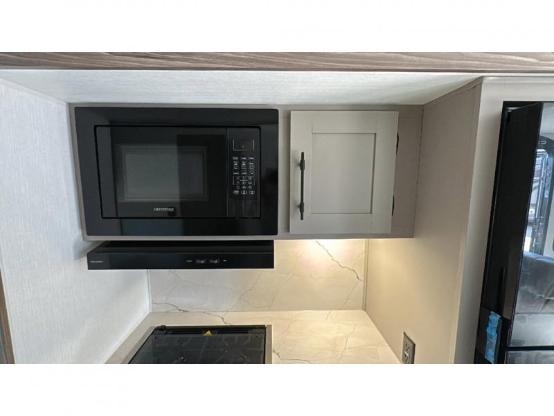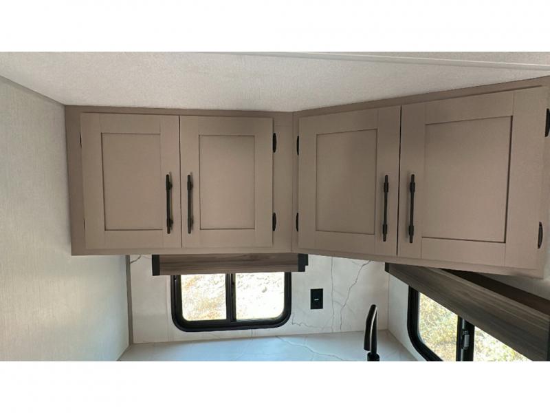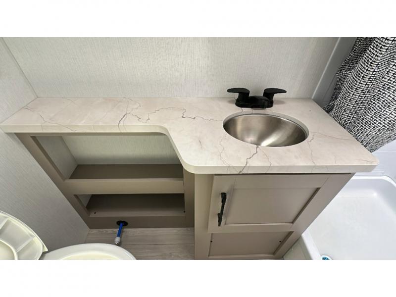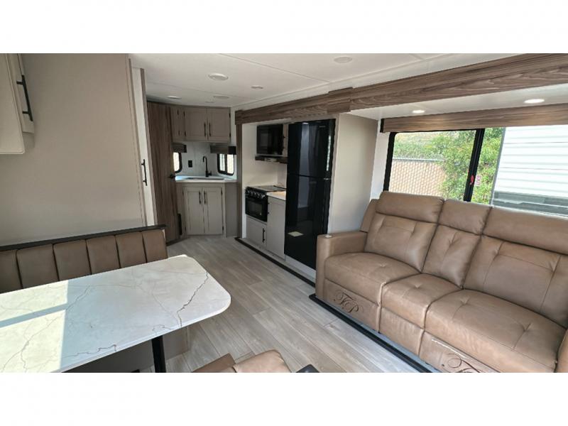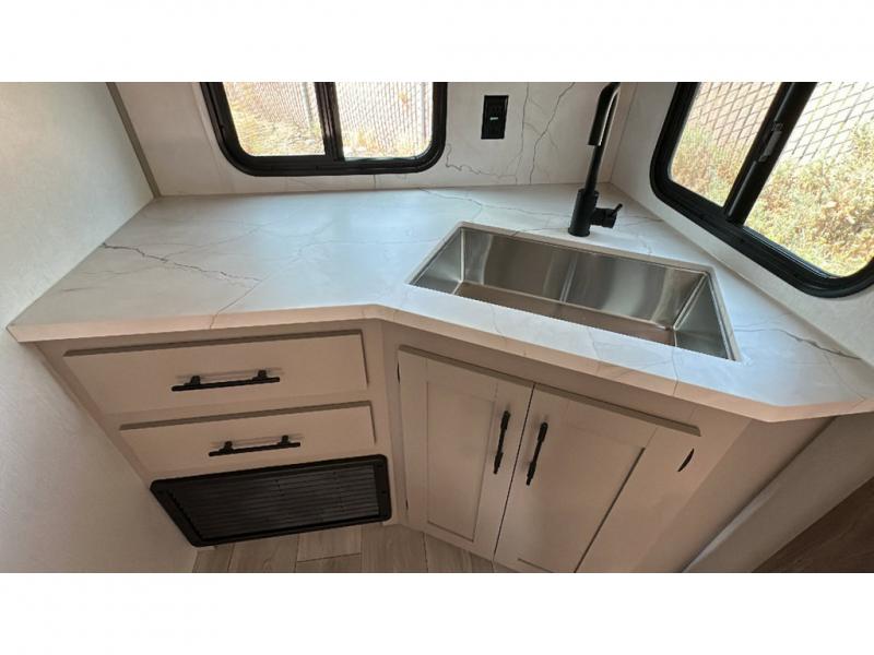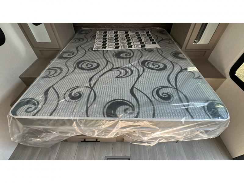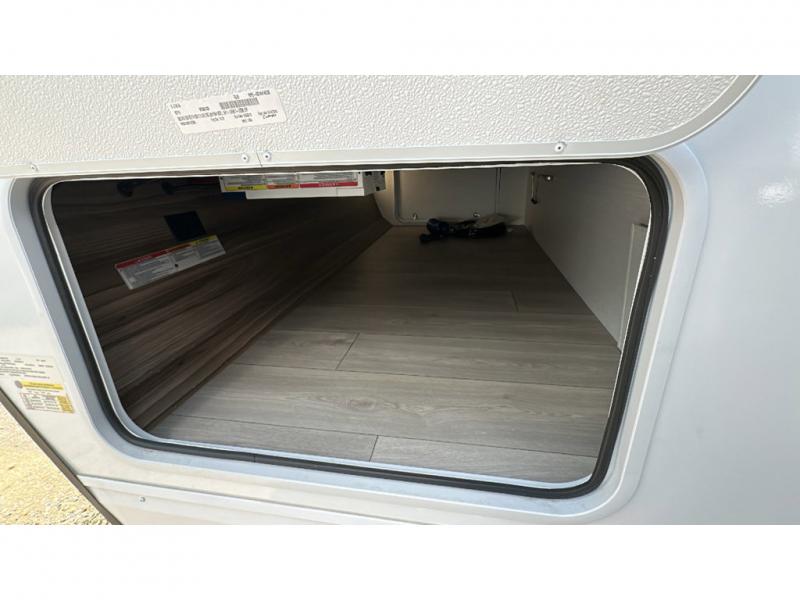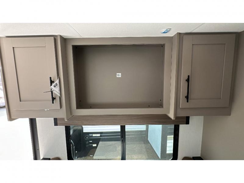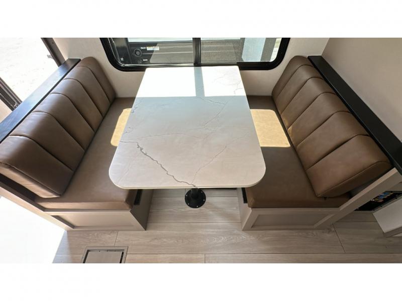 Travel on weekends, weekdays or whenever you want with this spacious trailer that has a large slide out that holds the theater seats with cupholders and USB ports, the 10 cu. ft. 12V refrigerator, and the cooking appliances. The rear corner has the kitchen sink and more counter space, giving the cook plenty of space to whip up camping meals. You can dine at the booth dinette or outside under the 18' power awning after grabbing your camping chairs from the pass-through storage. At night, get cleaned in the full bathroom with a nice amount of counter space for your toiletries, and fall quickly to sleep on your own queen bed up front with dual wardrobes for your clothing.