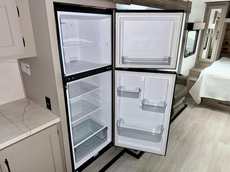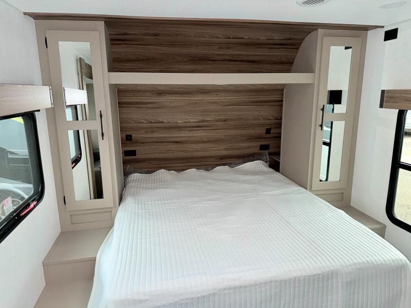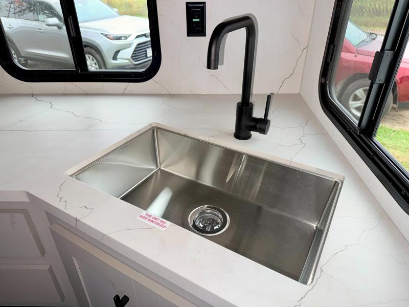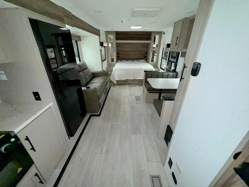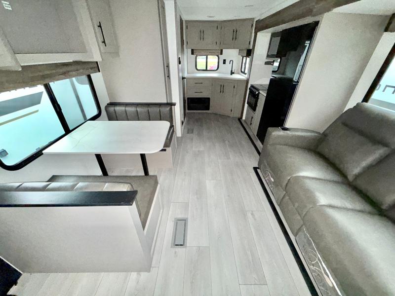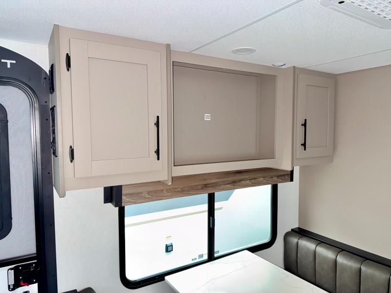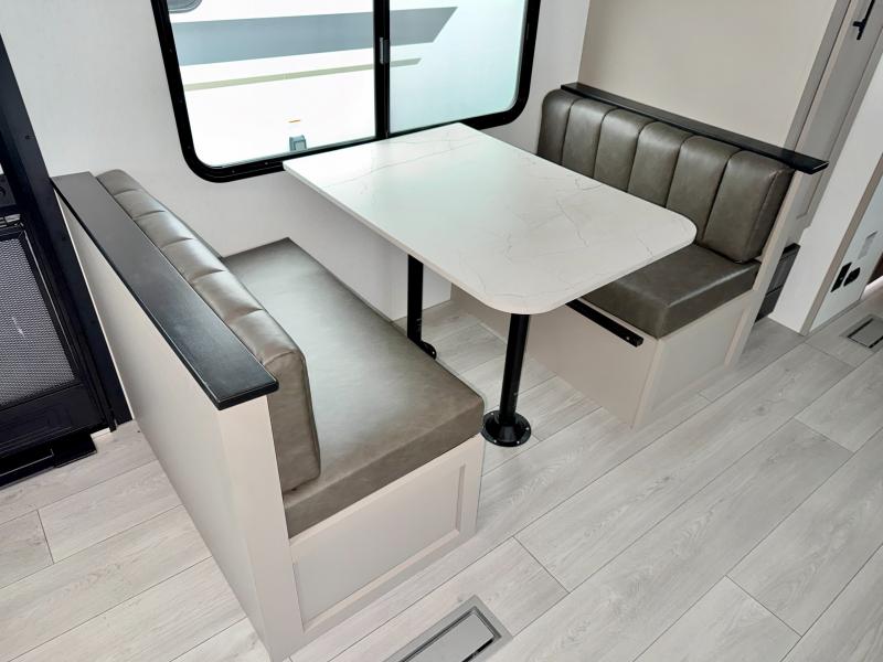 Travel on weekends, weekdays or whenever you want with this spacious trailer that has a large slide out that holds the theater seats with cupholders and USB ports, the 10 cu. ft. 12V refrigerator, and the cooking appliances. The rear corner has the kitchen sink and more counter space, giving the cook plenty of space to whip up camping meals. You can dine at the booth dinette or outside under the 18' power awning after grabbing your camping chairs from the pass-through storage. At night, get cleaned in the full bathroom with a nice amount of counter space for your toiletries, and fall quickly to sleep on your own queen bed up front with dual wardrobes for your clothing.