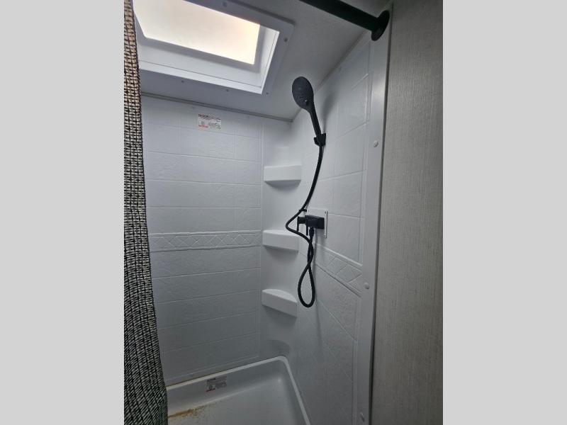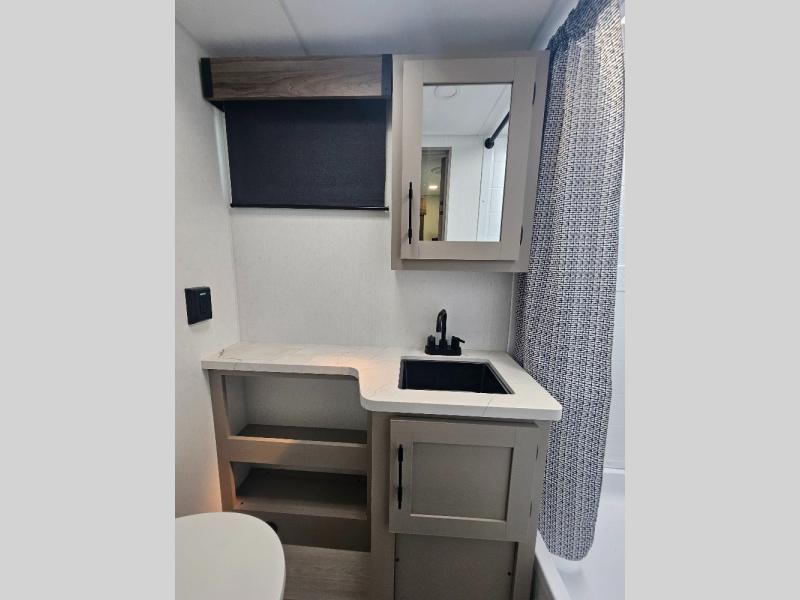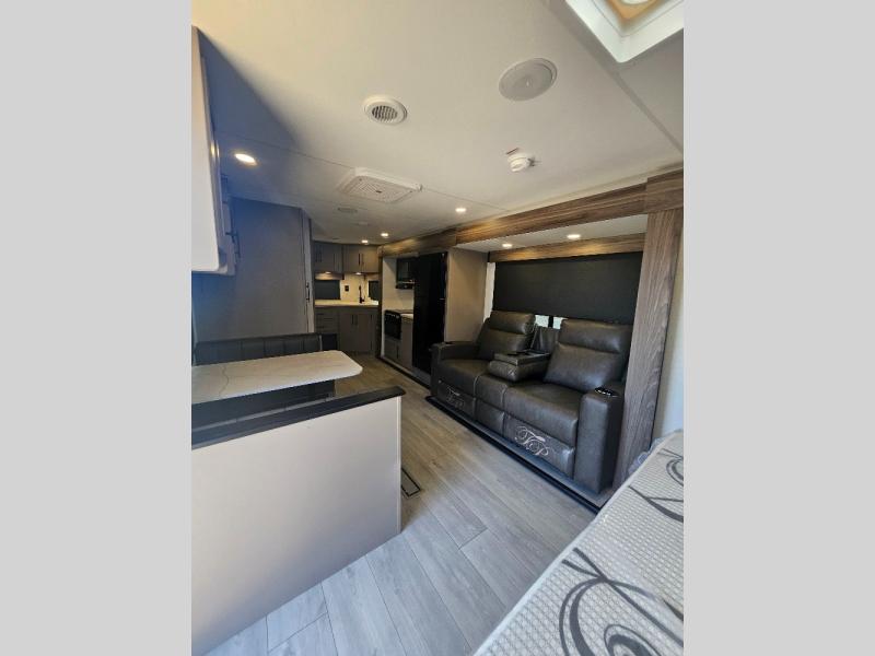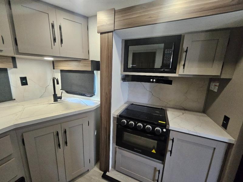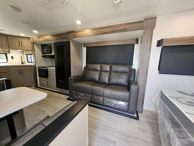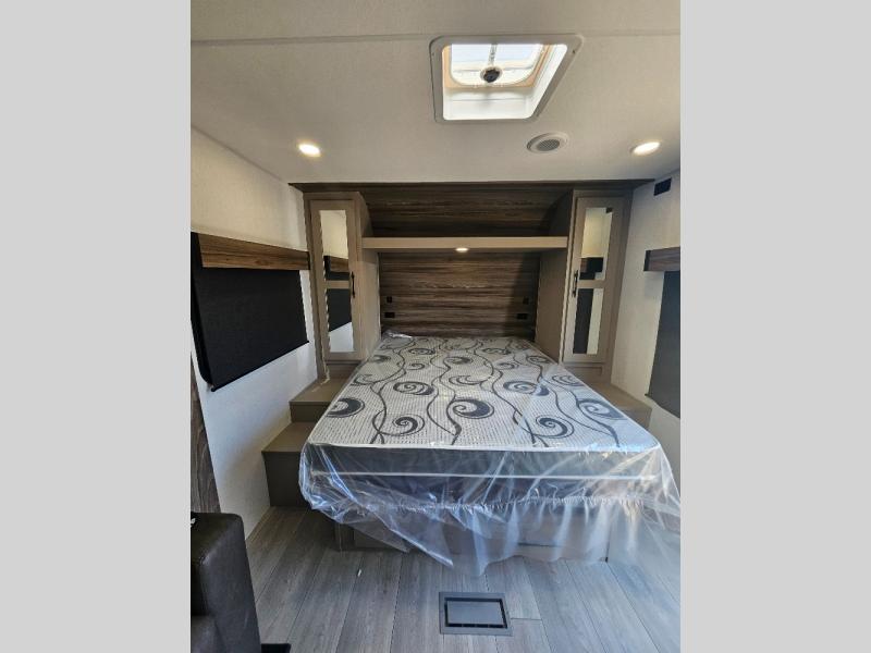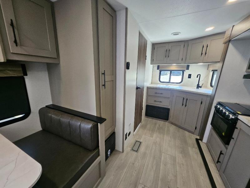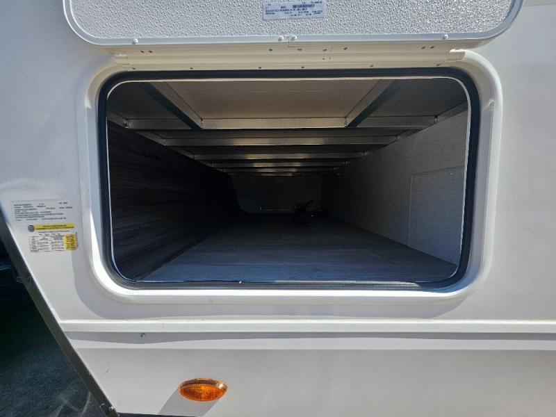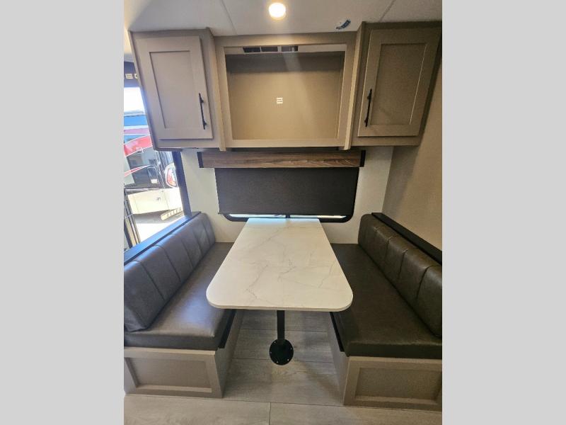 Travel on weekends, weekdays or whenever you want with this spacious trailer that has a large slide out that holds the theater seats with cupholders and USB ports, the 10 cu. ft. 12V refrigerator, and the cooking appliances. The rear corner has the kitchen sink and more counter space, giving the cook plenty of space to whip up camping meals. You can dine at the booth dinette or outside under the 18' power awning after grabbing your camping chairs from the pass-through storage. At night, get cleaned in the full bathroom with a nice amount of counter space for your toiletries, and fall quickly to sleep on your own queen bed up front with dual wardrobes for your clothing.