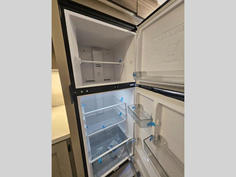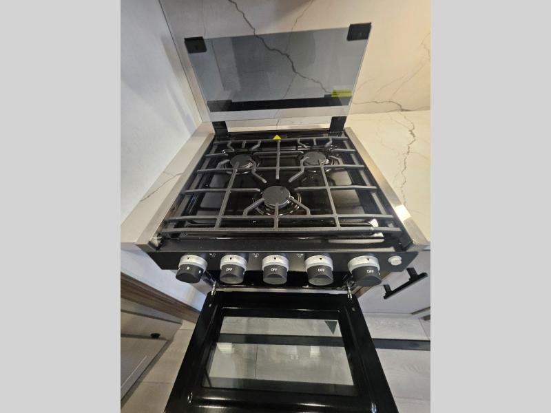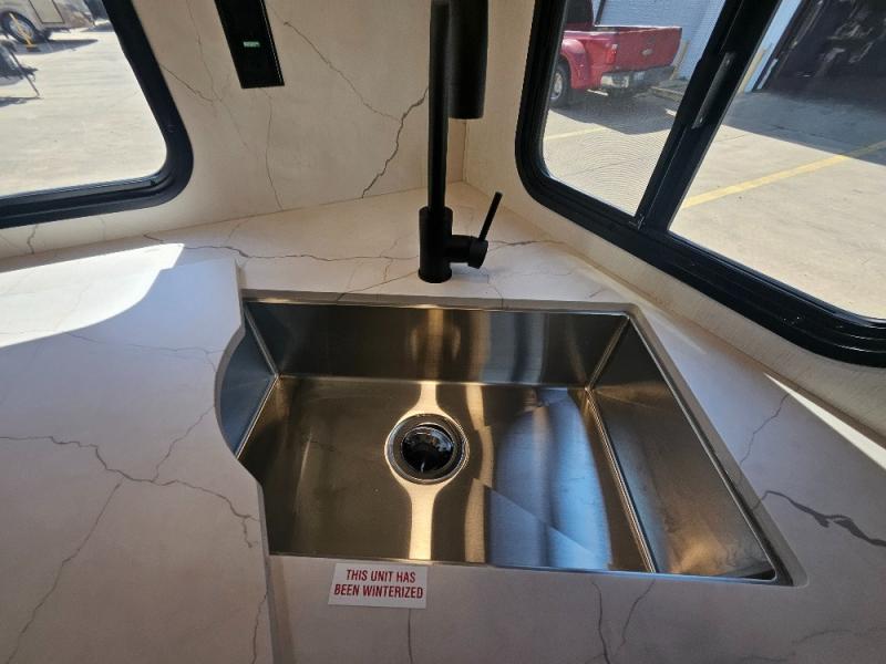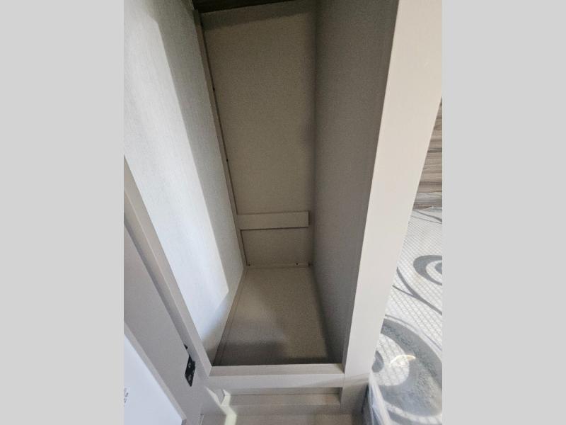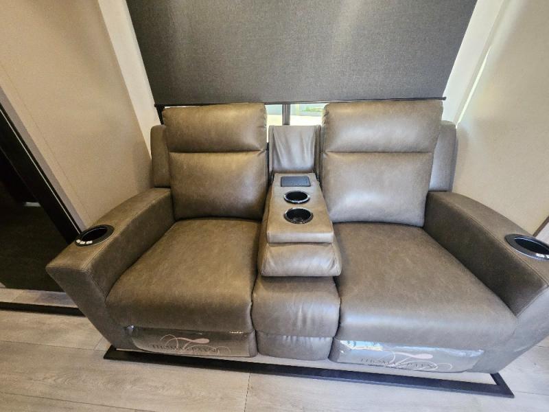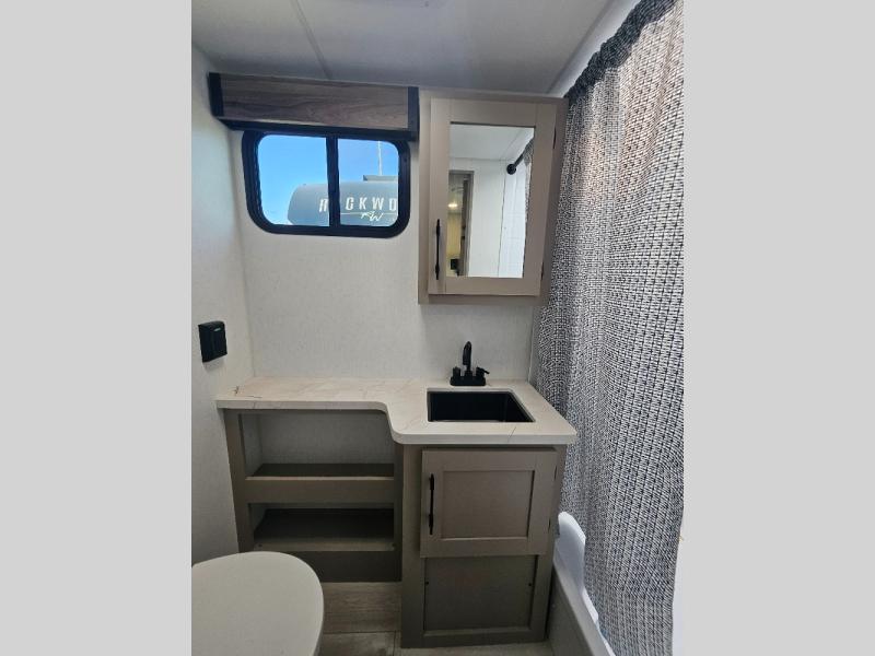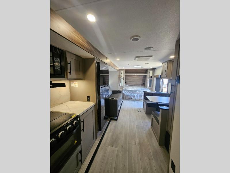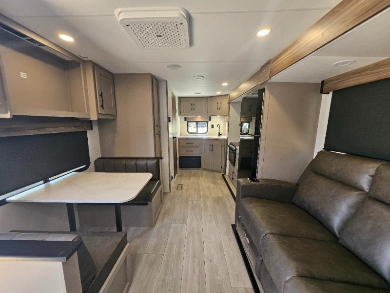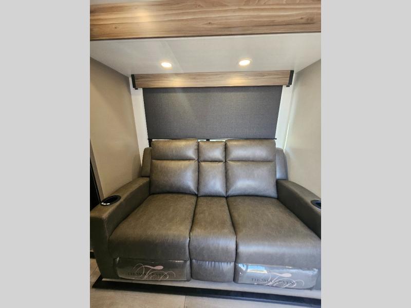 Travel on weekends, weekdays or whenever you want with this spacious trailer that has a large slide out that holds the theater seats with cupholders and USB ports, the 10 cu. ft. 12V refrigerator, and the cooking appliances. The rear corner has the kitchen sink and more counter space, giving the cook plenty of space to whip up camping meals. You can dine at the booth dinette or outside under the 18' power awning after grabbing your camping chairs from the pass-through storage. At night, get cleaned in the full bathroom with a nice amount of counter space for your toiletries, and fall quickly to sleep on your own queen bed up front with dual wardrobes for your clothing.
