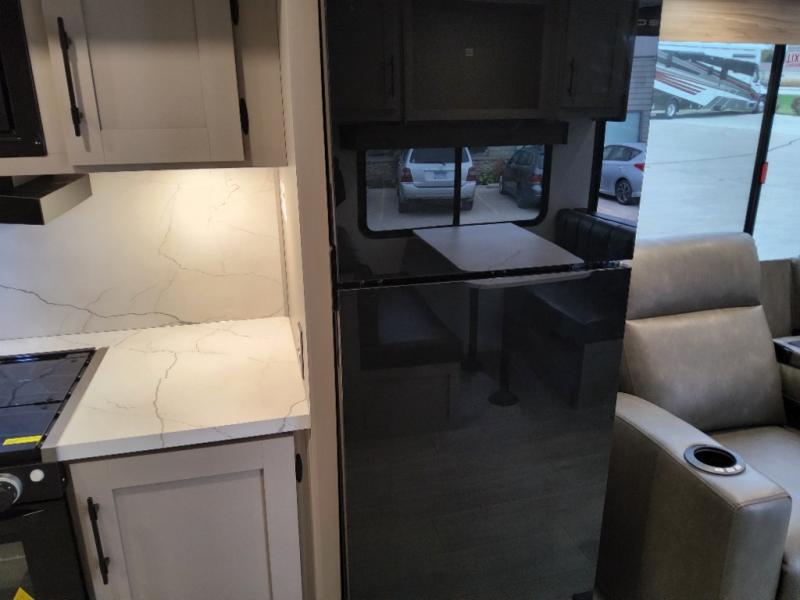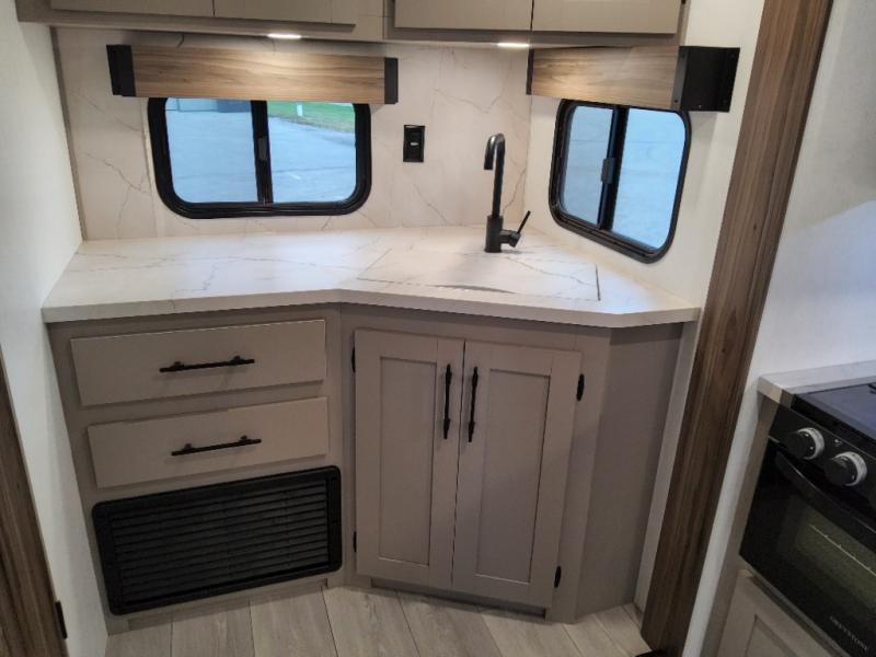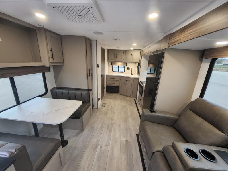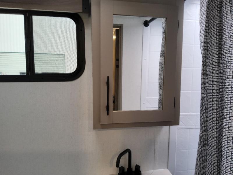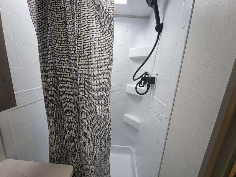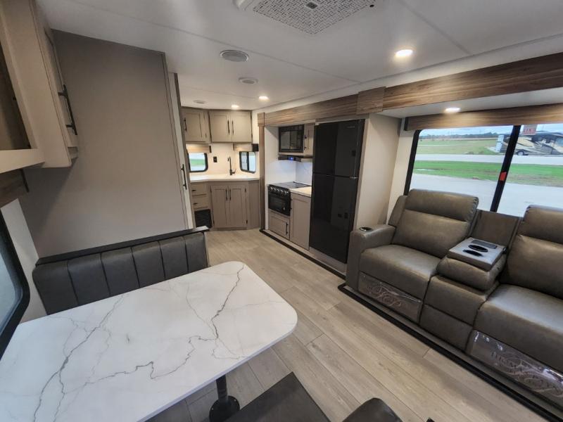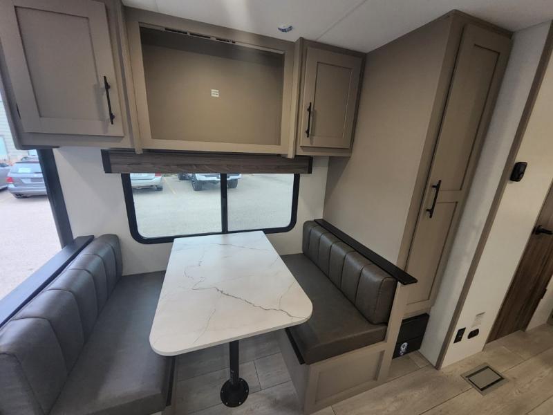 Travel on weekends, weekdays or whenever you want with this spacious trailer that has a large slide out that holds the theater seats with cupholders and USB ports, the 10 cu. ft. 12V refrigerator, and the cooking appliances. The rear corner has the kitchen sink and more counter space, giving the cook plenty of space to whip up camping meals. You can dine at the booth dinette or outside under the 18' power awning after grabbing your camping chairs from the pass-through storage. At night, get cleaned in the full bathroom with a nice amount of counter space for your toiletries, and fall quickly to sleep on your own queen bed up front with dual wardrobes for your clothing.