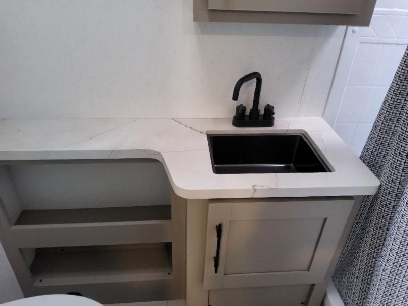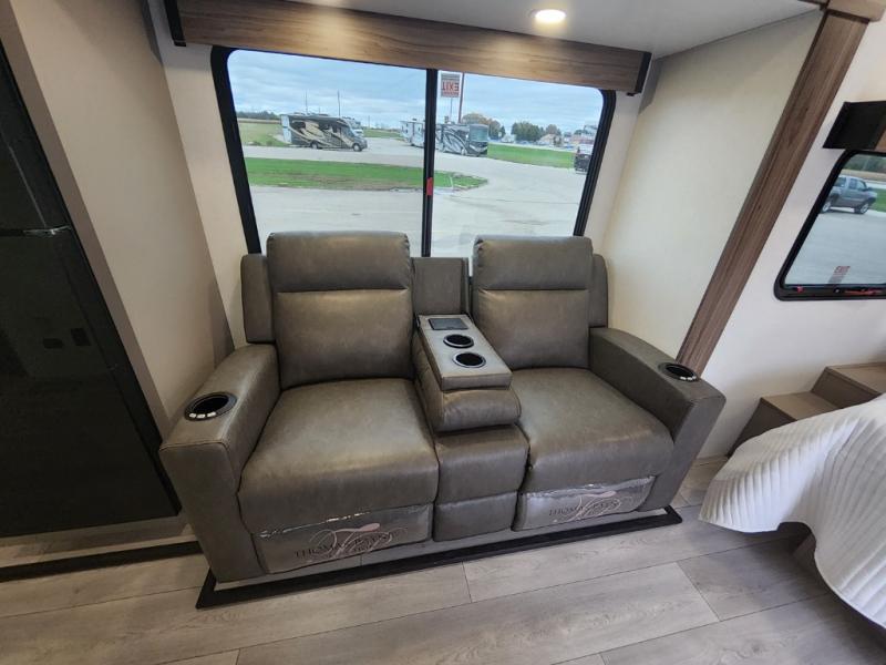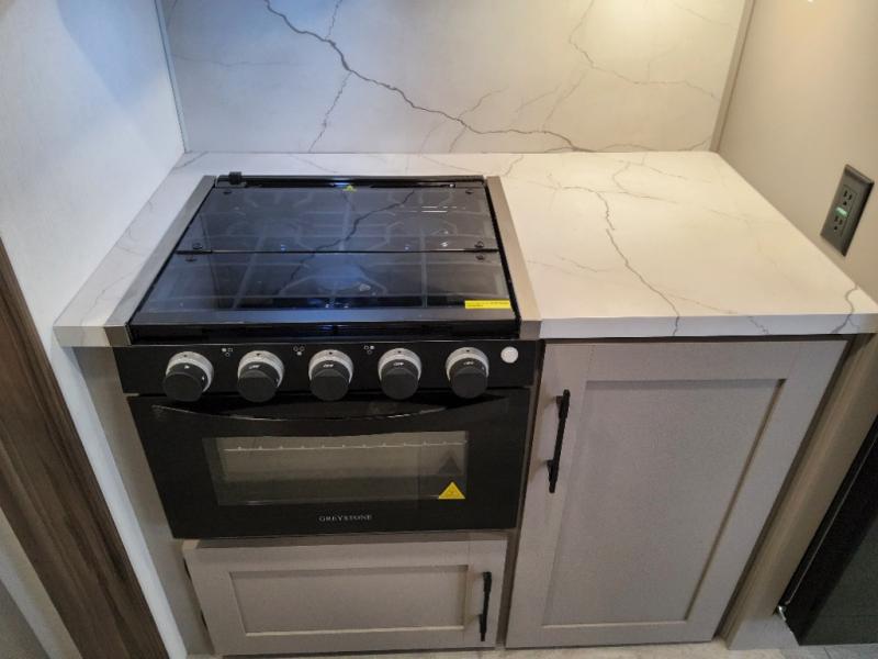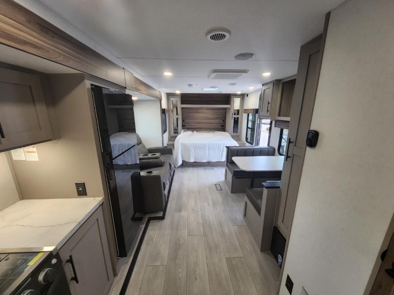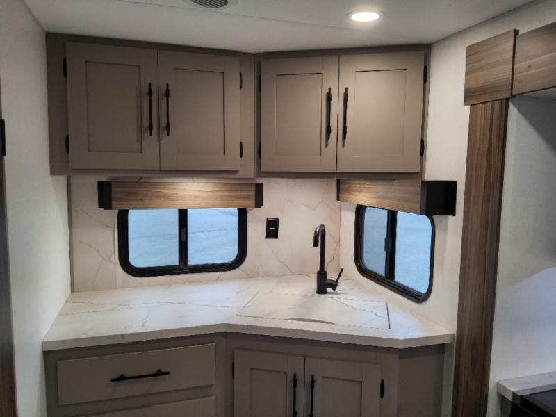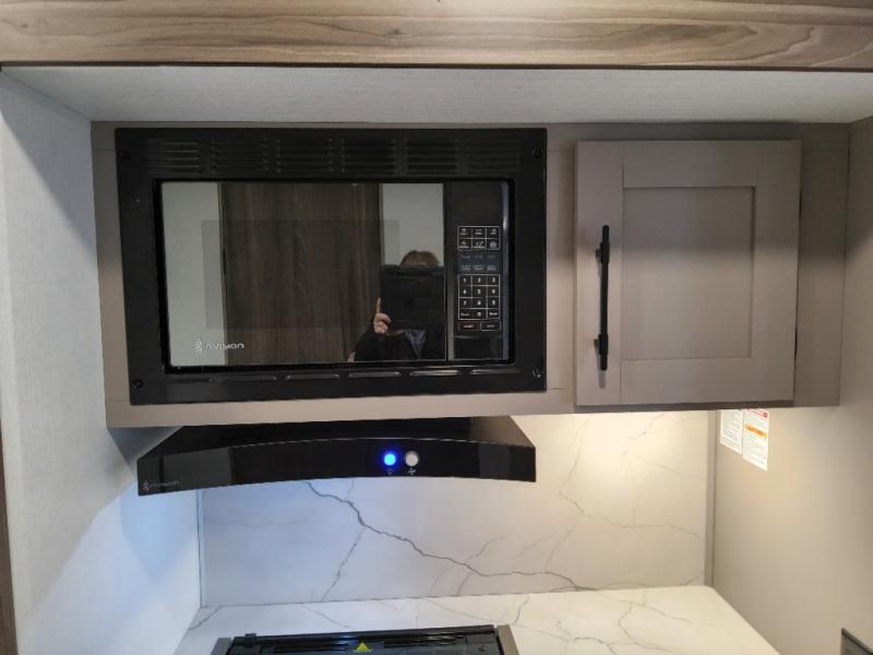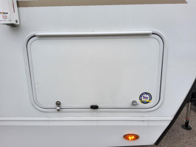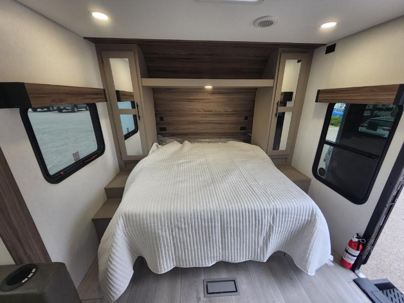 Travel on weekends, weekdays or whenever you want with this spacious trailer that has a large slide out that holds the theater seats with cupholders and USB ports, the 10 cu. ft. 12V refrigerator, and the cooking appliances. The rear corner has the kitchen sink and more counter space, giving the cook plenty of space to whip up camping meals. You can dine at the booth dinette or outside under the 18' power awning after grabbing your camping chairs from the pass-through storage. At night, get cleaned in the full bathroom with a nice amount of counter space for your toiletries, and fall quickly to sleep on your own queen bed up front with dual wardrobes for your clothing.