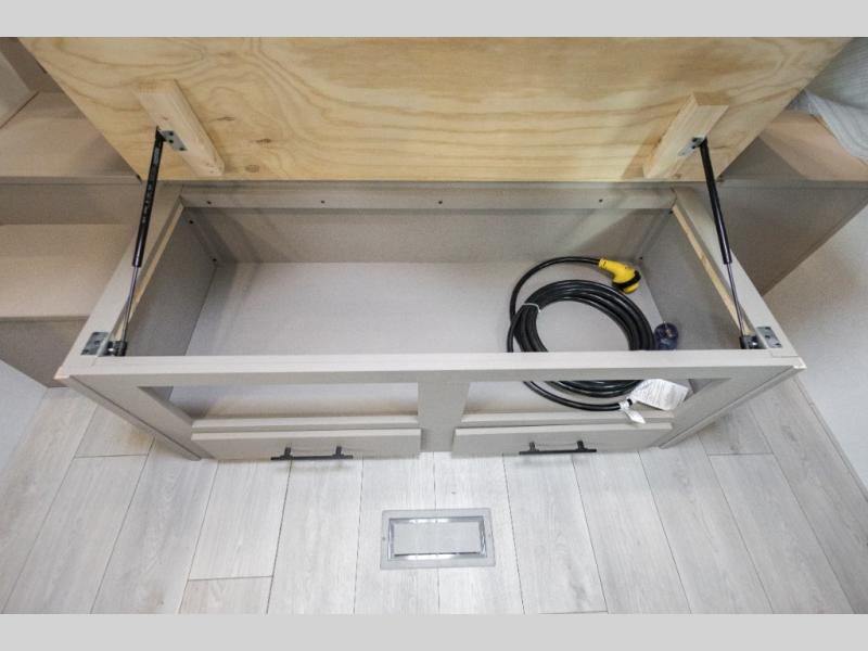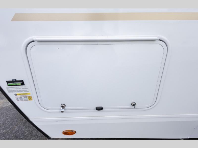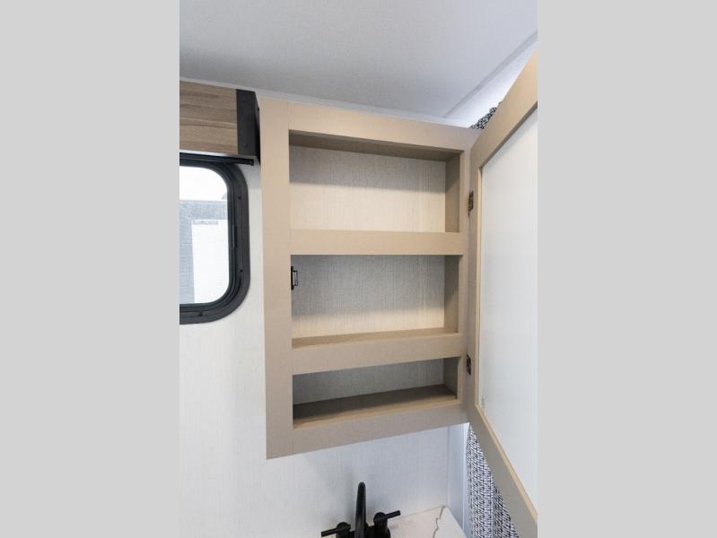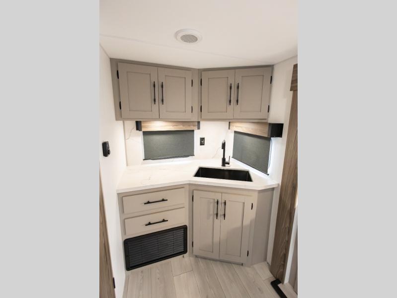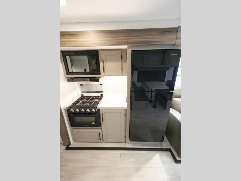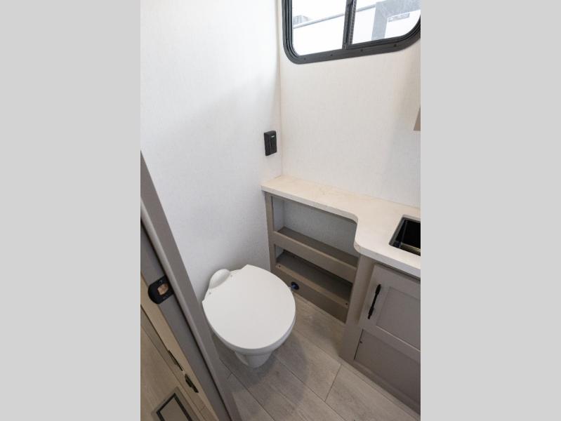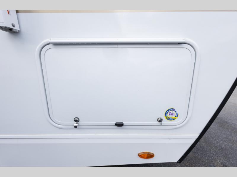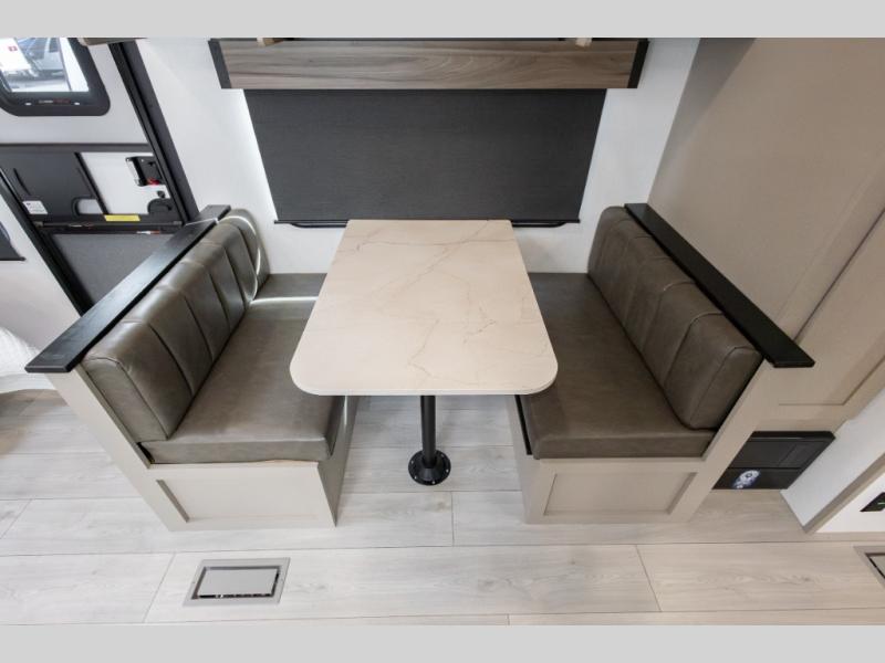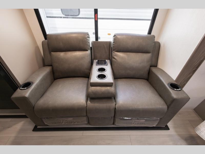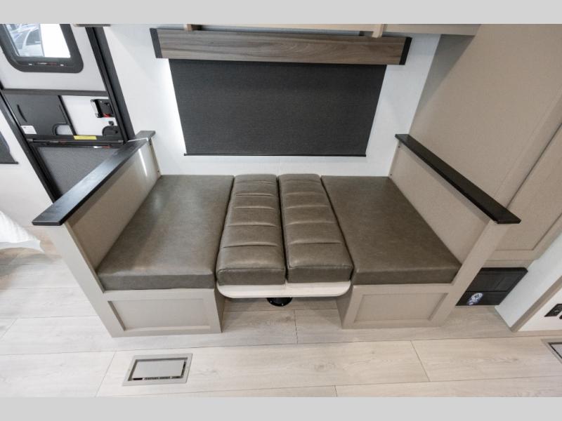 Travel on weekends, weekdays or whenever you want with this spacious trailer that has a large slide out that holds the theater seats with cupholders and USB ports, the 10 cu. ft. 12V refrigerator, and the cooking appliances. The rear corner has the kitchen sink and more counter space, giving the cook plenty of space to whip up camping meals. You can dine at the booth dinette or outside under the 18' power awning after grabbing your camping chairs from the pass-through storage. At night, get cleaned in the full bathroom with a nice amount of counter space for your toiletries, and fall quickly to sleep on your own queen bed up front with dual wardrobes for your clothing.