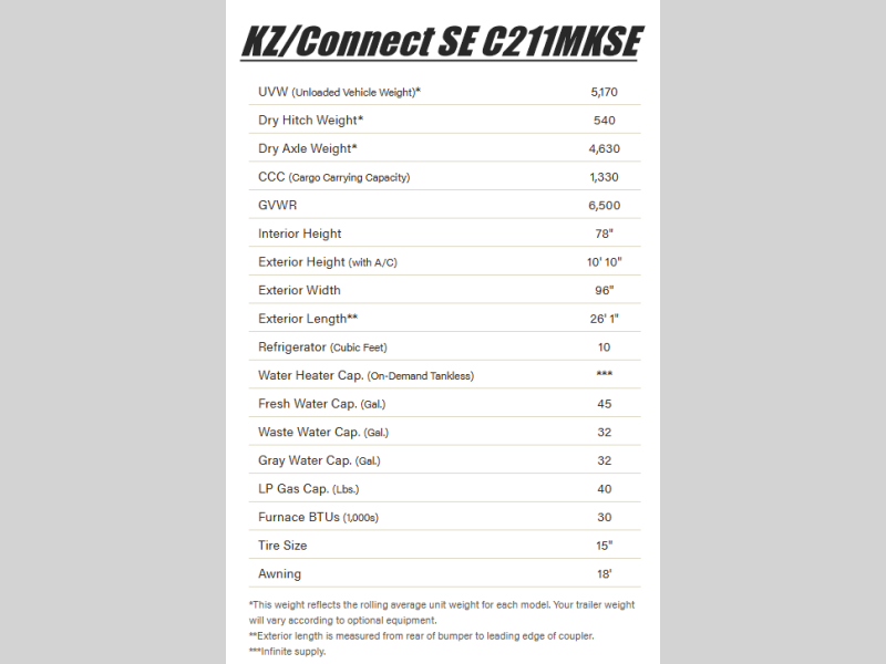Each Connect SE travel trailer by KZ includes an NXG frame, which is a high quality, highly engineered frame that provides a lightweight yet strong foundation for your RV. The Climate package provides added insulation to extend your camping season year-round with a fully enclosed, insulated and heated underbelly to protect the tanks and pipes. Some top features include the 17-inch range with illuminated control knobs, the seamless countertops with a deep undermount stainless steel kitchen sink including a sink cover for added countertop space, and a black high-rise faucet. You will also enjoy the KZ Engage that is powered by OneControl to monitor and control the battery levels, the slide(s), the leveling system, the awning(s), plus the inside and outside lighting. Choose your favorite today!