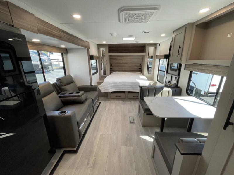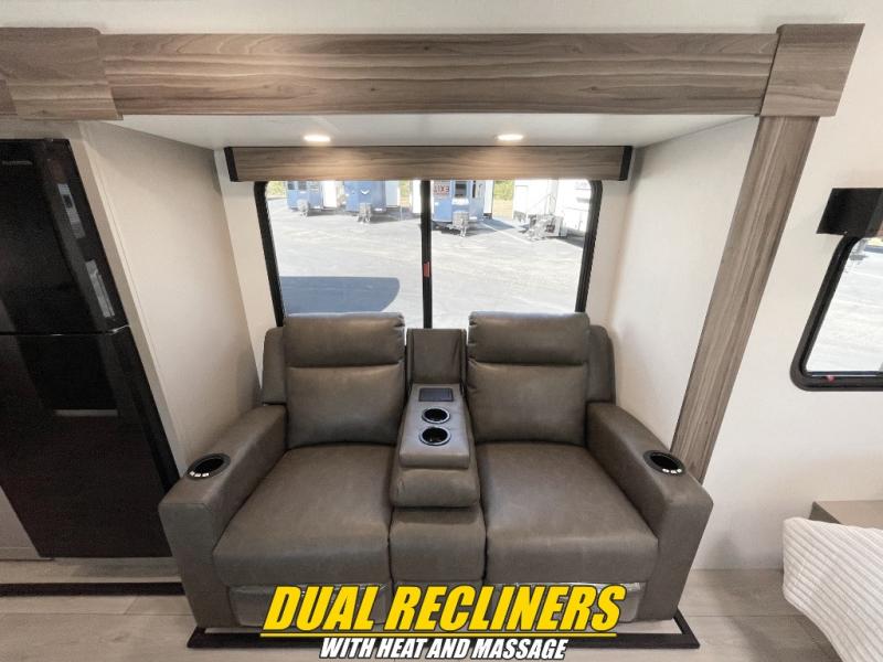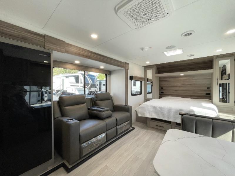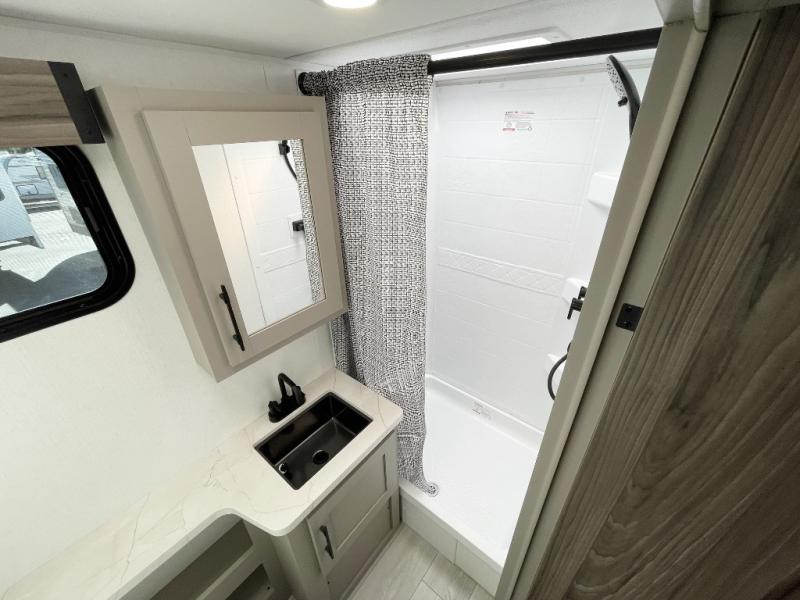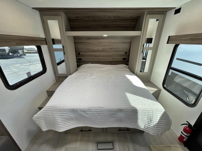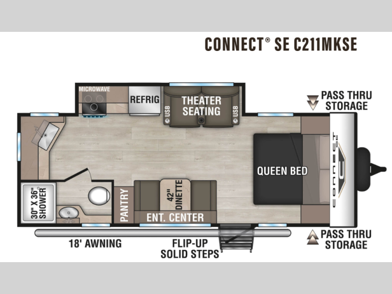 Travel on weekends, weekdays or whenever you want with this spacious trailer that has a large slide out that holds the theater seats with cupholders and USB ports, the 10 cu. ft. 12V refrigerator, and the cooking appliances. The rear corner has the kitchen sink and more counter space, giving the cook plenty of space to whip up camping meals. You can dine at the booth dinette or outside under the 18' power awning after grabbing your camping chairs from the pass-through storage. At night, get cleaned in the full bathroom with a nice amount of counter space for your toiletries, and fall quickly to sleep on your own queen bed up front with dual wardrobes for your clothing.