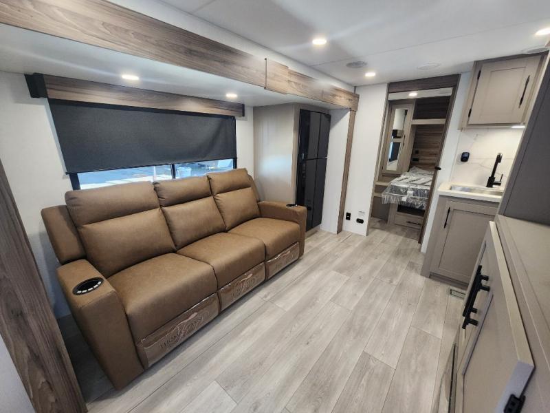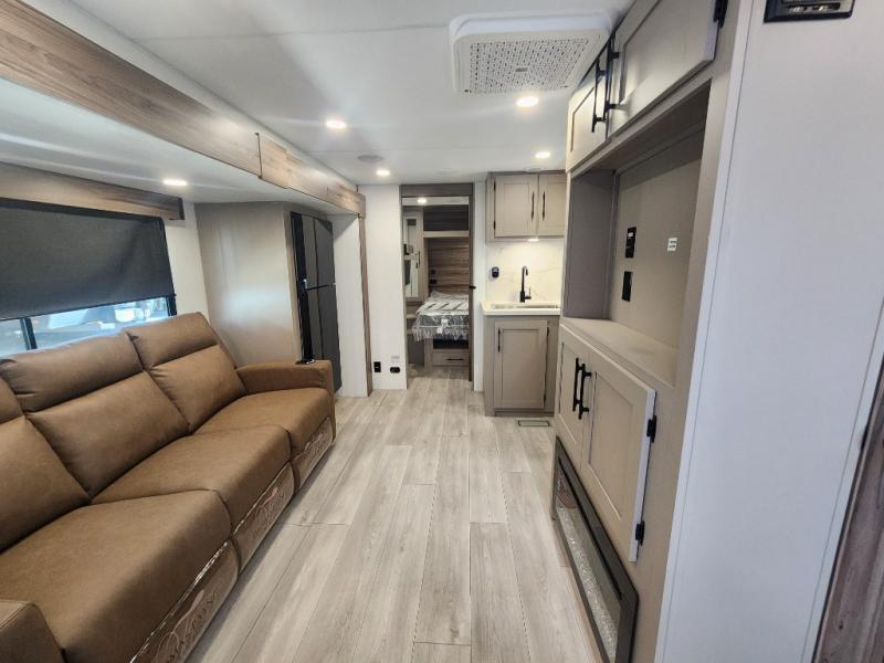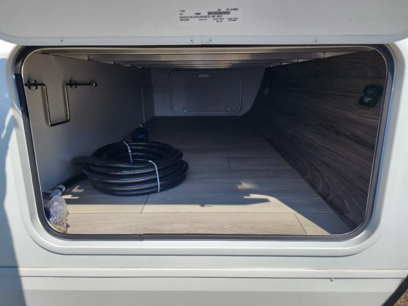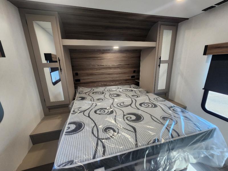 Inside comforts are found throughout this trailer from the theater dinette with a table and a 10 cu. ft. refrigerator within the slide out, to the rear full bathroom with a space saving door. Outside, you will find comfort under the 16' power awning while relaxing as you decide what to do next. The pass-through storage gives you a place for your larger items like camping chairs, portable stove, charcoal and outdoor games. The cook will love the L-shaped countertop and kitchen appliances, plus the walk-in pantry includes coat hooks. At night, head to the front to enjoy your own queen bed with clothing storage on each side, plus there is a TV mount if you want to add your own TV.