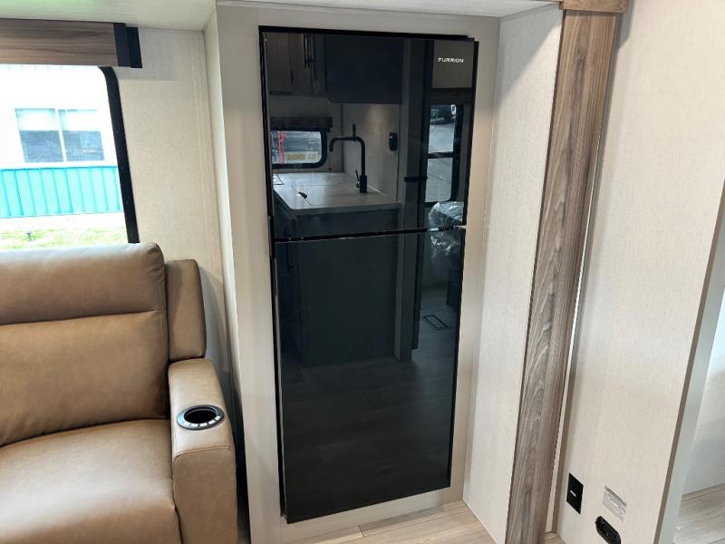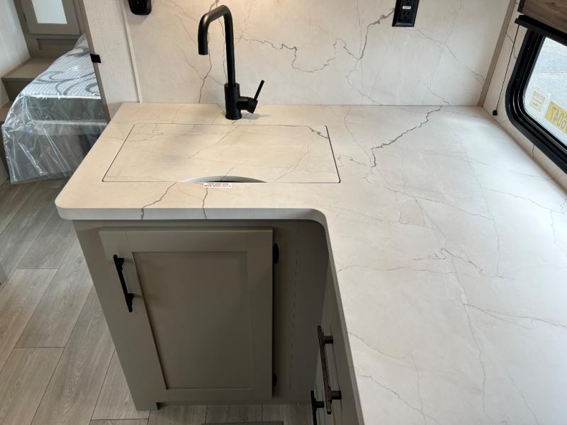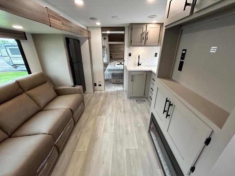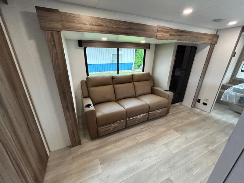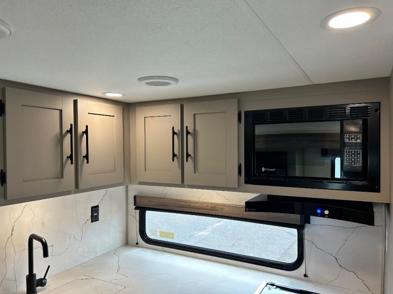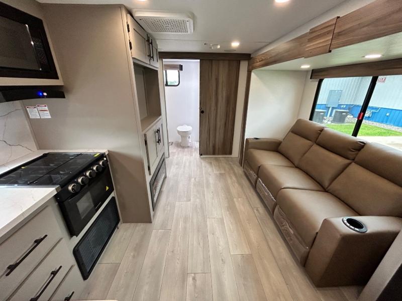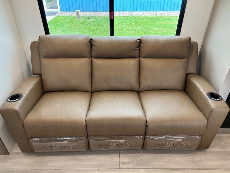 Inside comforts are found throughout this trailer from the theater dinette with a table and a 10 cu. ft. refrigerator within the slide out, to the rear full bathroom with a space saving door. Outside, you will find comfort under the 16' power awning while relaxing as you decide what to do next. The pass-through storage gives you a place for your larger items like camping chairs, portable stove, charcoal and outdoor games. The cook will love the L-shaped countertop and kitchen appliances, plus the walk-in pantry includes coat hooks. At night, head to the front to enjoy your own queen bed with clothing storage on each side, plus there is a TV mount if you want to add your own TV.