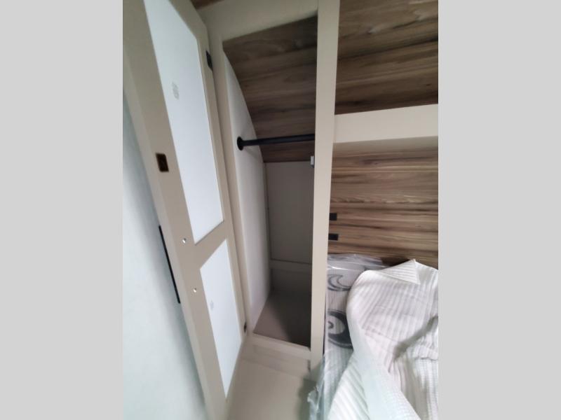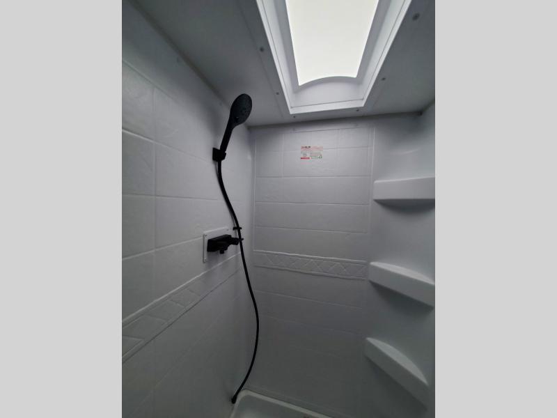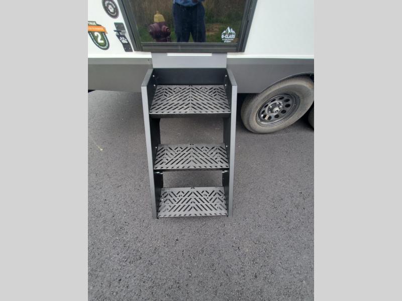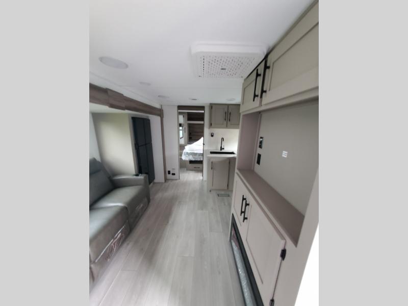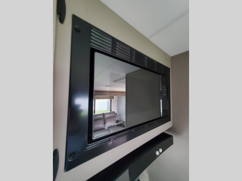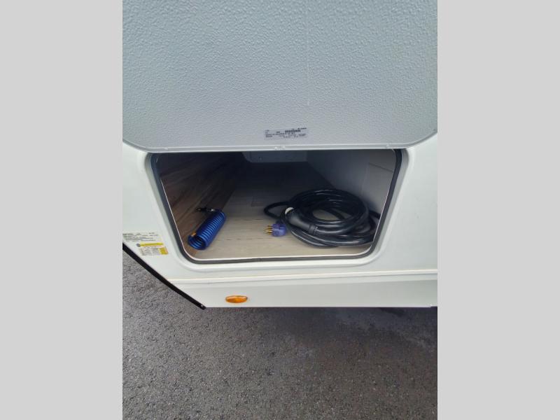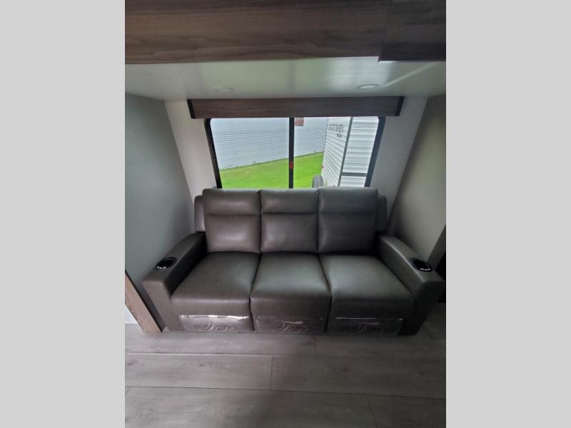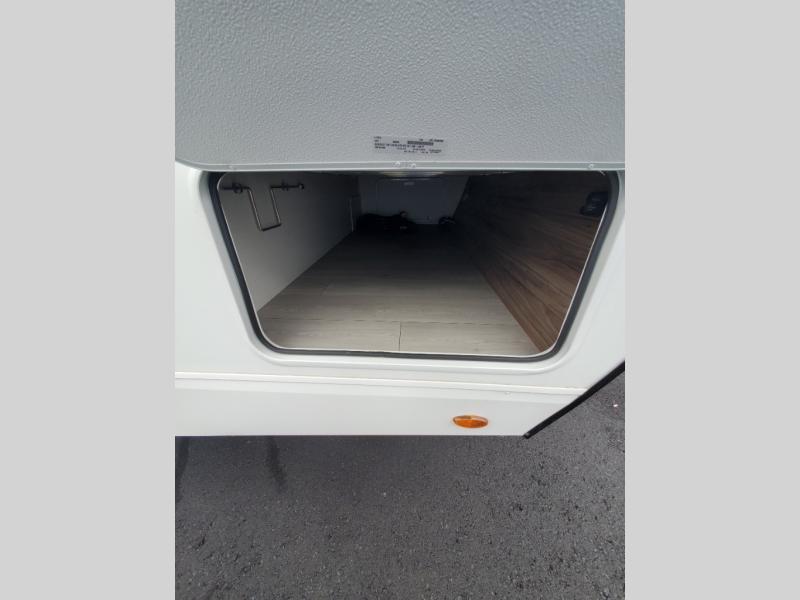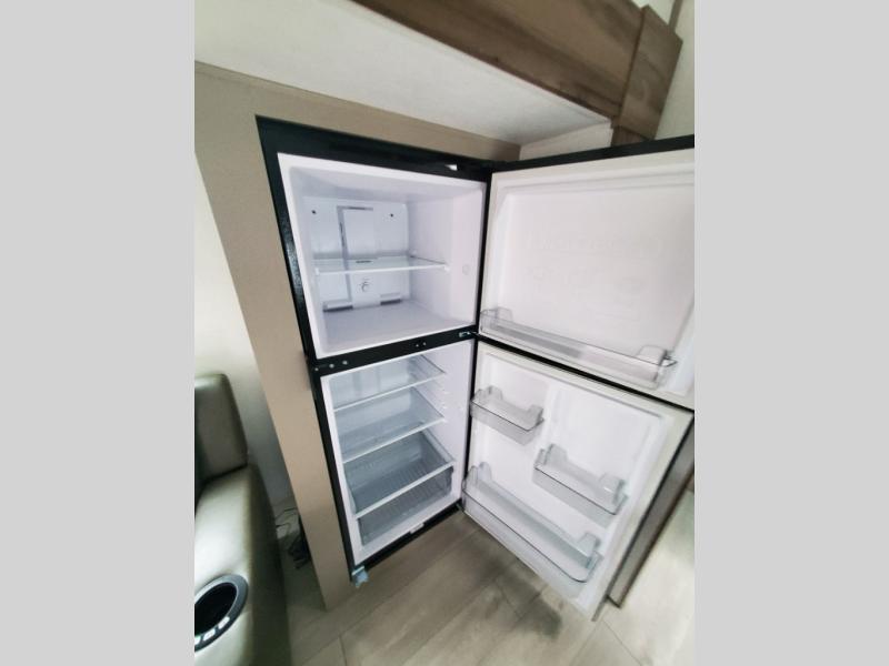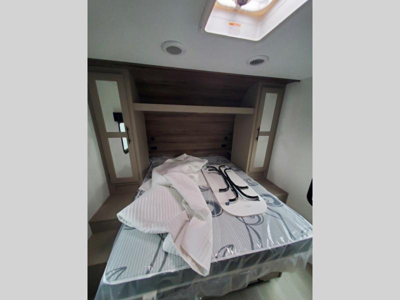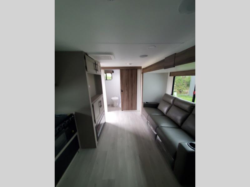 Inside comforts are found throughout this trailer from the theater dinette with a table and a 10 cu. ft. refrigerator within the slide out, to the rear full bathroom with a space saving door. Outside, you will find comfort under the 16' power awning while relaxing as you decide what to do next. The pass-through storage gives you a place for your larger items like camping chairs, portable stove, charcoal and outdoor games. The cook will love the L-shaped countertop and kitchen appliances, plus the walk-in pantry includes coat hooks. At night, head to the front to enjoy your own queen bed with clothing storage on each side, plus there is a TV mount if you want to add your own TV.