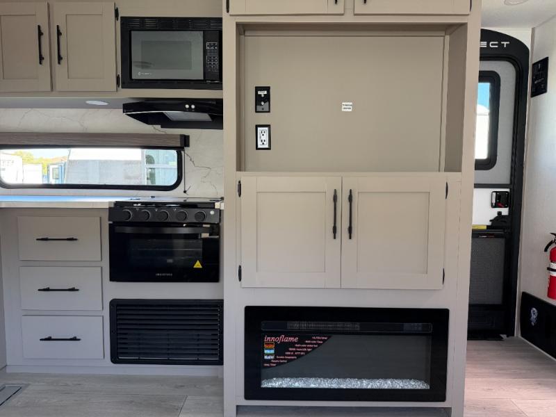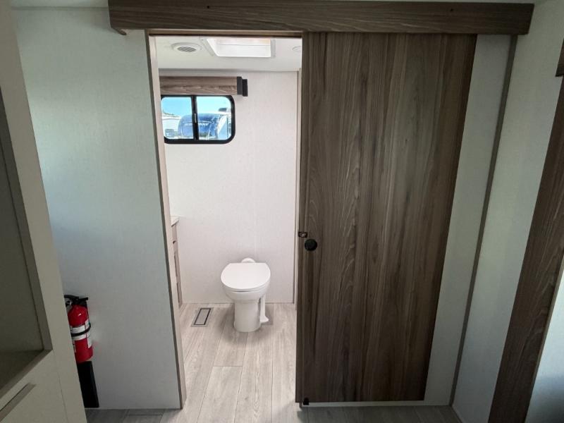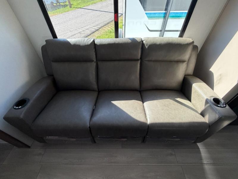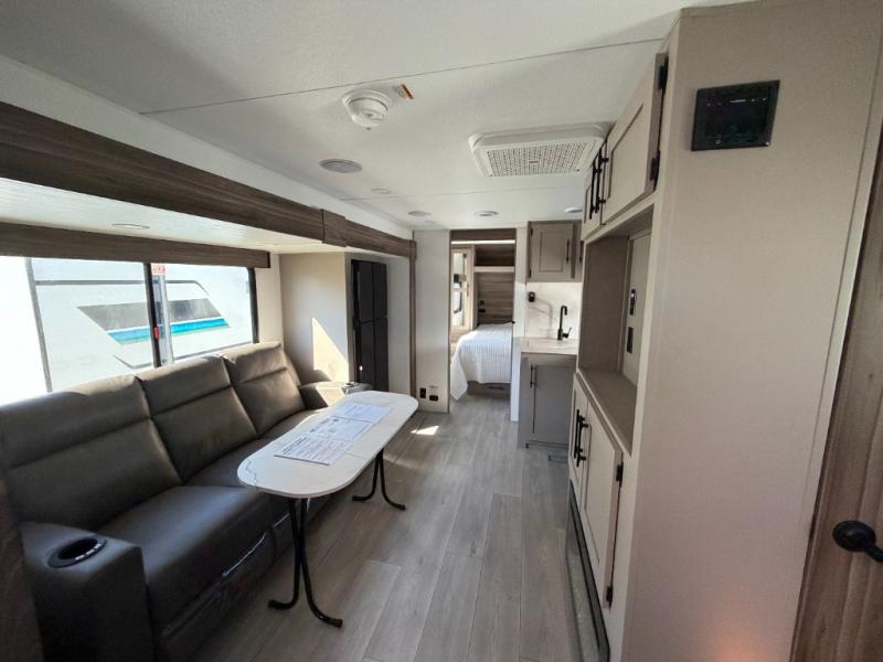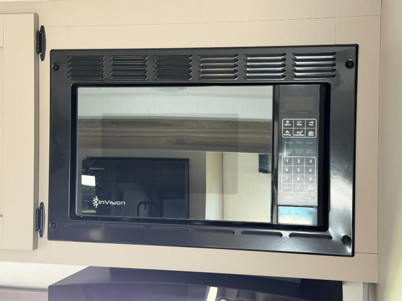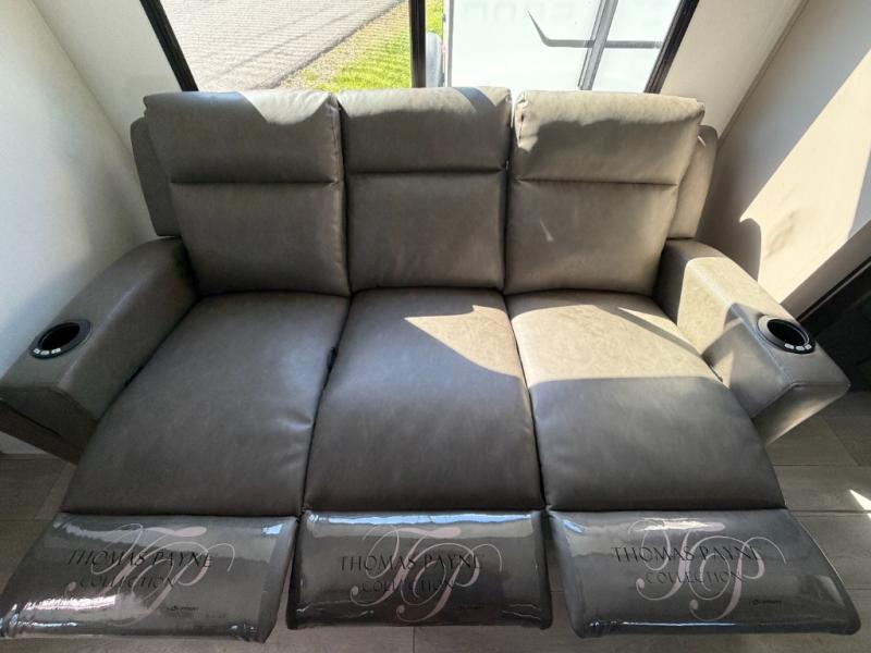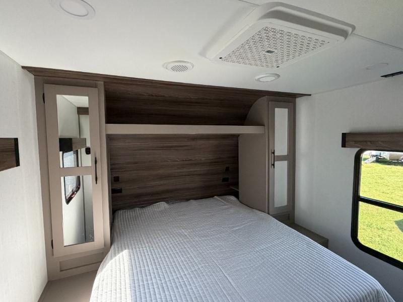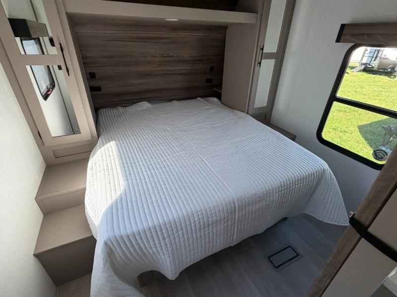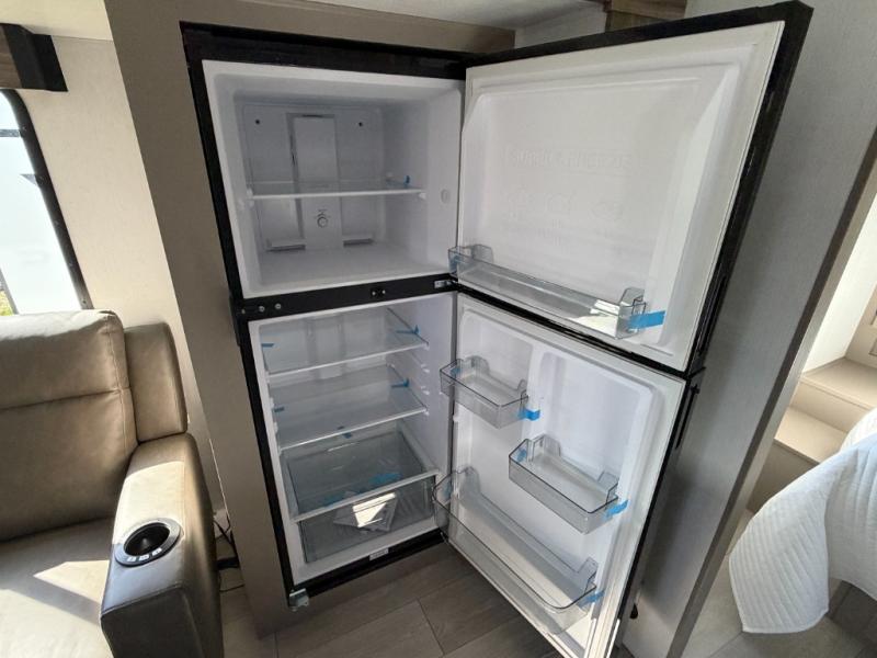 Inside comforts are found throughout this trailer from the theater dinette with a table and a 10 cu. ft. refrigerator within the slide out, to the rear full bathroom with a space saving door. Outside, you will find comfort under the 16' power awning while relaxing as you decide what to do next. The pass-through storage gives you a place for your larger items like camping chairs, portable stove, charcoal and outdoor games. The cook will love the L-shaped countertop and kitchen appliances, plus the walk-in pantry includes coat hooks. At night, head to the front to enjoy your own queen bed with clothing storage on each side, plus there is a TV mount if you want to add your own TV.