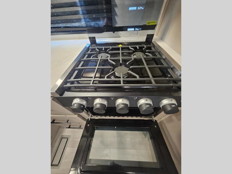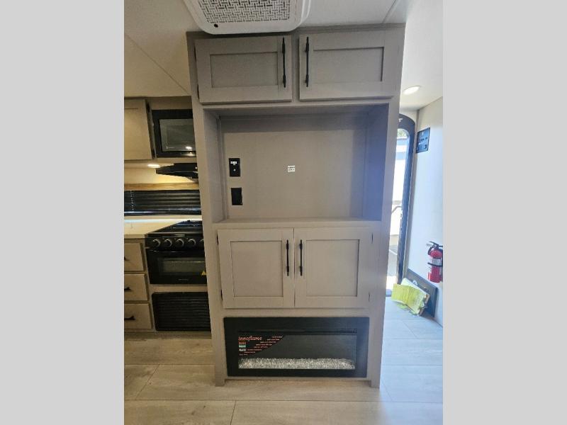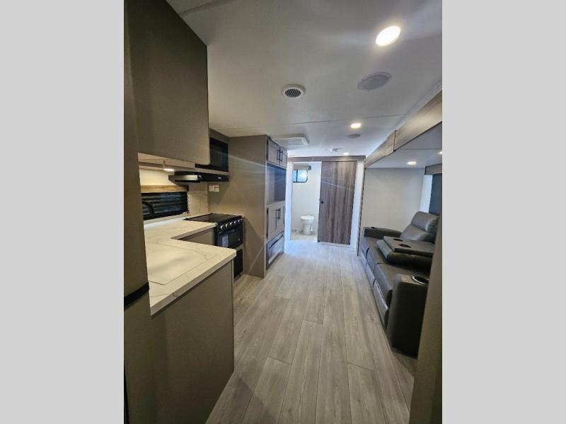 Inside comforts are found throughout this trailer from the theater dinette with a table and a 10 cu. ft. refrigerator within the slide out, to the rear full bathroom with a space saving door. Outside, you will find comfort under the 16' power awning while relaxing as you decide what to do next. The pass-through storage gives you a place for your larger items like camping chairs, portable stove, charcoal and outdoor games. The cook will love the L-shaped countertop and kitchen appliances, plus the walk-in pantry includes coat hooks. At night, head to the front to enjoy your own queen bed with clothing storage on each side, plus there is a TV mount if you want to add your own TV.