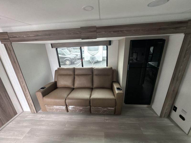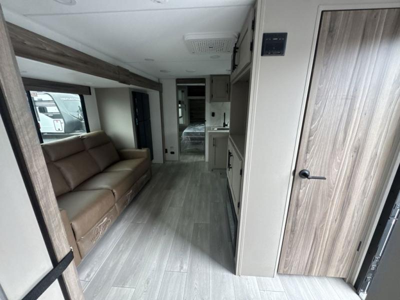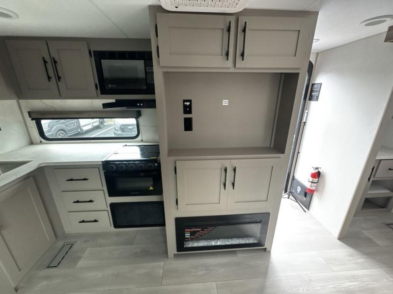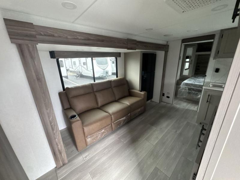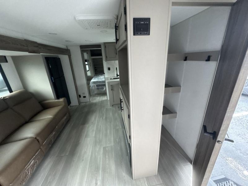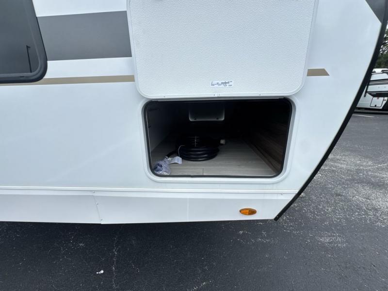 Inside comforts are found throughout this trailer from the theater dinette with a table and a 10 cu. ft. refrigerator within the slide out, to the rear full bathroom with a space saving door. Outside, you will find comfort under the 16' power awning while relaxing as you decide what to do next. The pass-through storage gives you a place for your larger items like camping chairs, portable stove, charcoal and outdoor games. The cook will love the L-shaped countertop and kitchen appliances, plus the walk-in pantry includes coat hooks. At night, head to the front to enjoy your own queen bed with clothing storage on each side, plus there is a TV mount if you want to add your own TV.
