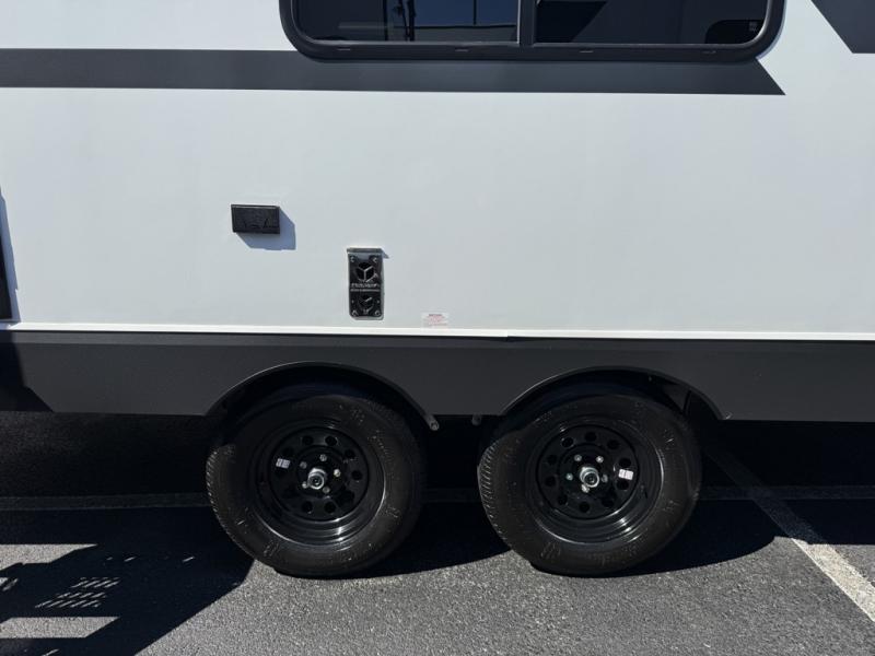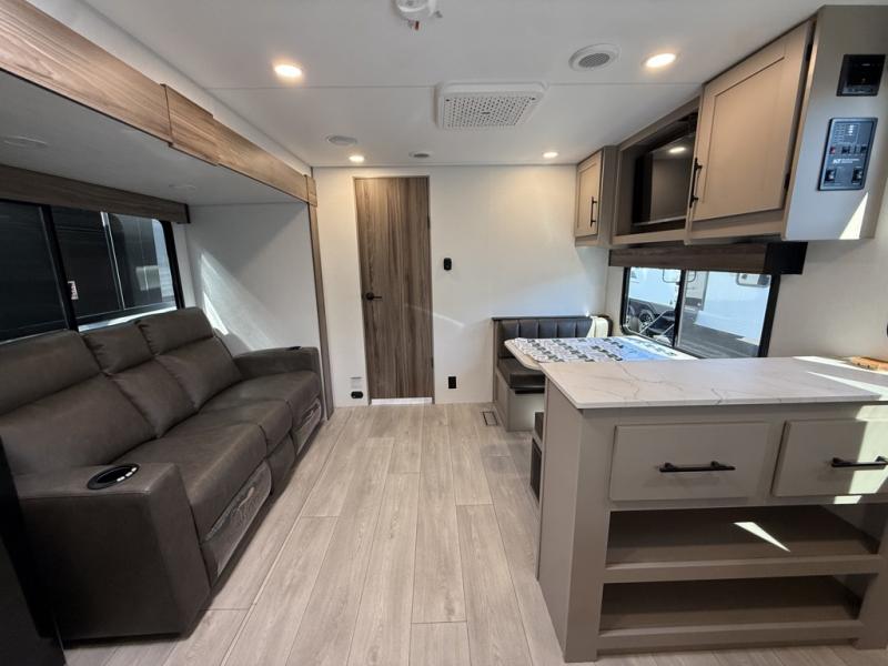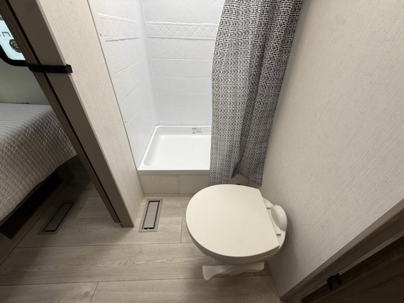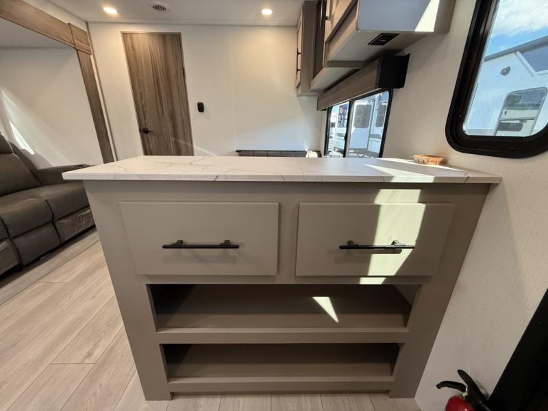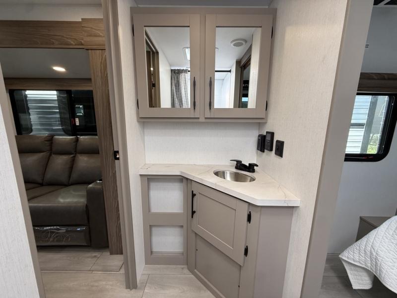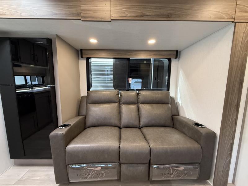 The spacious rear kitchen is equipped with a pantry for ample storage, a three-burner cooktop for culinary creativity, a refrigerator, and a cozy booth dinette for meals or socializing. This unit also has a hutch for additional storage and display. You can unwind in the plush theater seating, organize all of your footwear in the convenient shoe storage. Further, you can relax and refresh after a long day of adventures in the walk-through bath, which provides easy access and convenience, and have a good night's sleep in the spacious front bedroom boasting an ample queen bed and two wardrobes to keep your favorite outfits neat. Finally, head outside and create unforgettable memories under the protection of the exterior power awning.