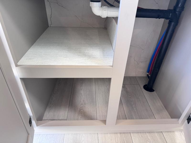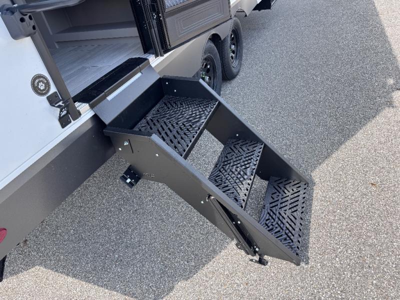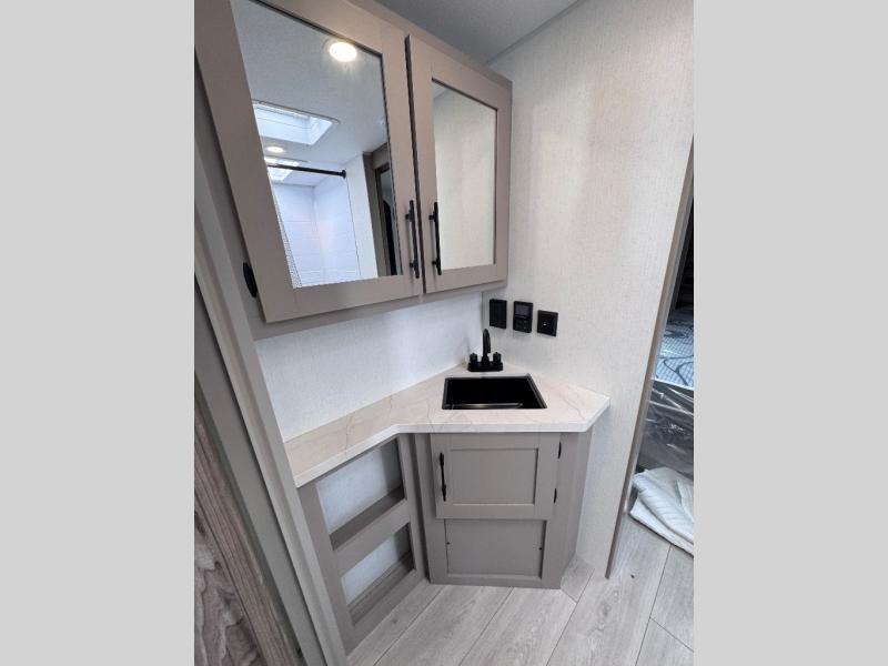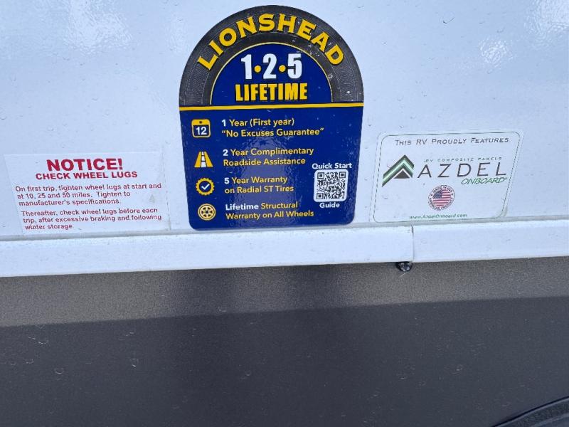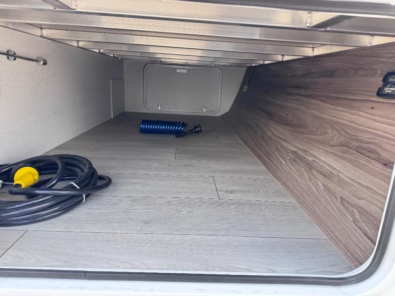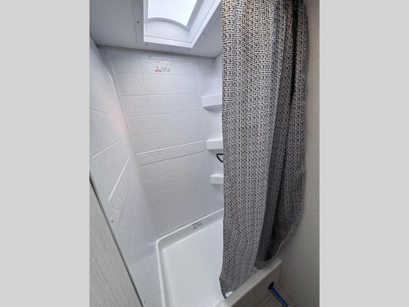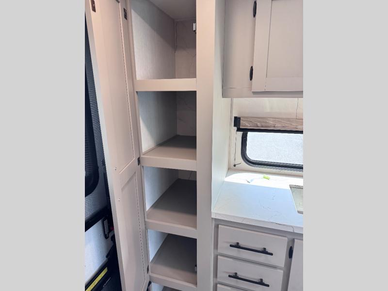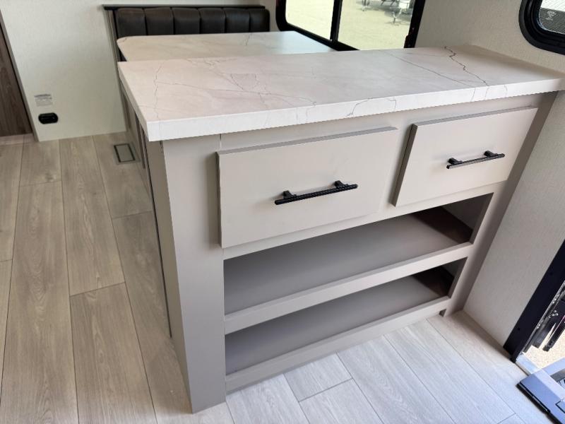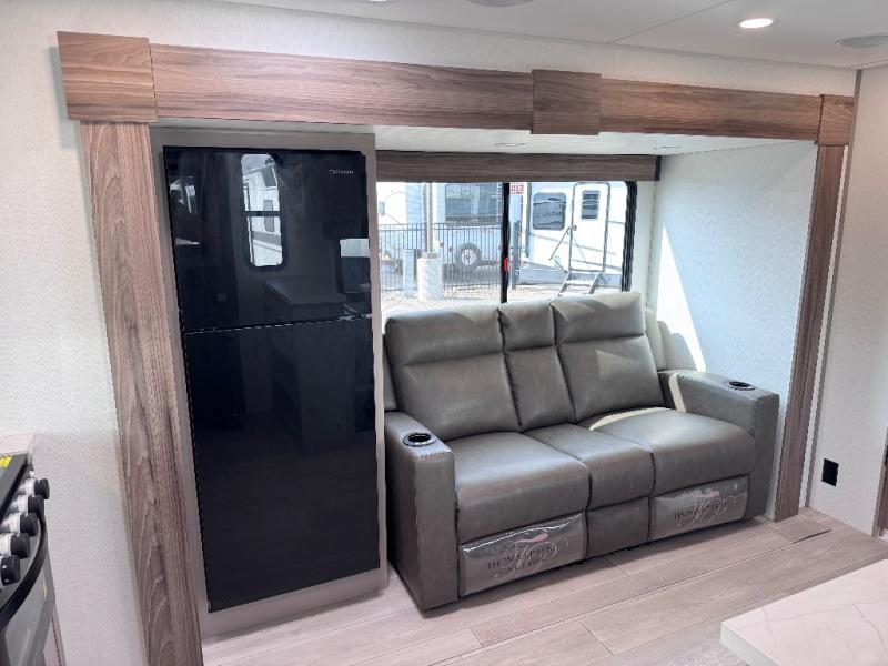 The spacious rear kitchen is equipped with a pantry for ample storage, a three-burner cooktop for culinary creativity, a refrigerator, and a cozy booth dinette for meals or socializing. This unit also has a hutch for additional storage and display. You can unwind in the plush theater seating, organize all of your footwear in the convenient shoe storage. Further, you can relax and refresh after a long day of adventures in the walk-through bath, which provides easy access and convenience, and have a good night's sleep in the spacious front bedroom boasting an ample queen bed and two wardrobes to keep your favorite outfits neat. Finally, head outside and create unforgettable memories under the protection of the exterior power awning.
