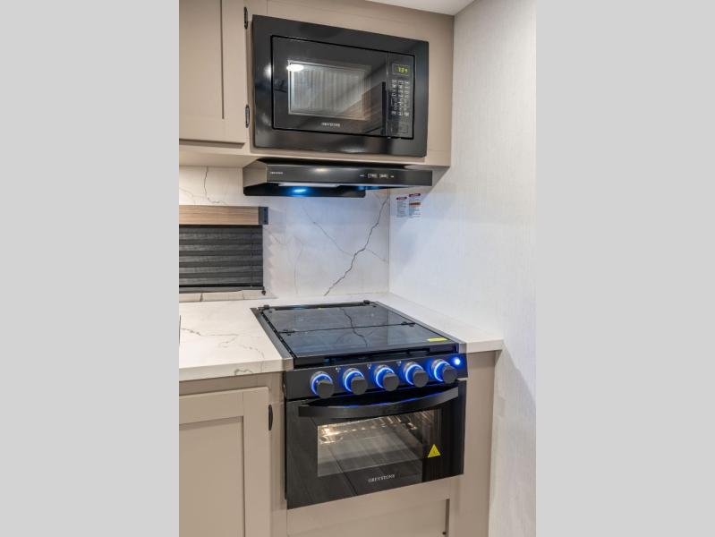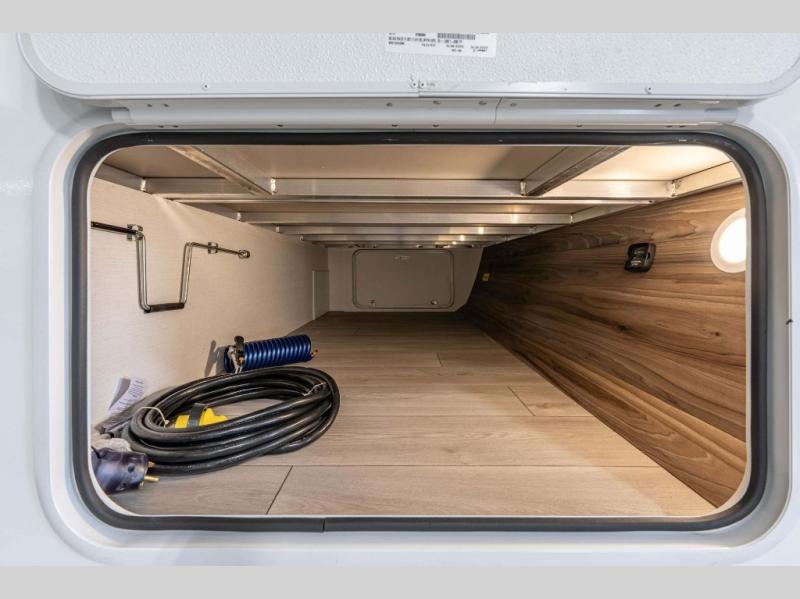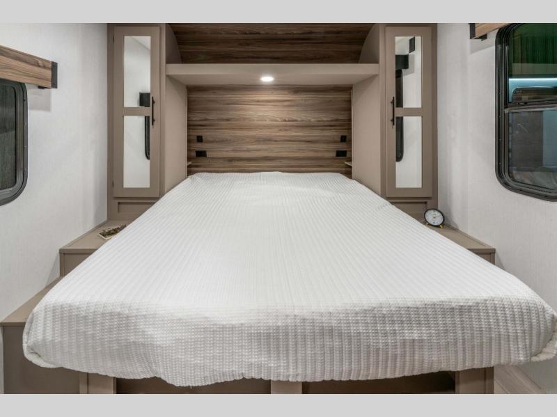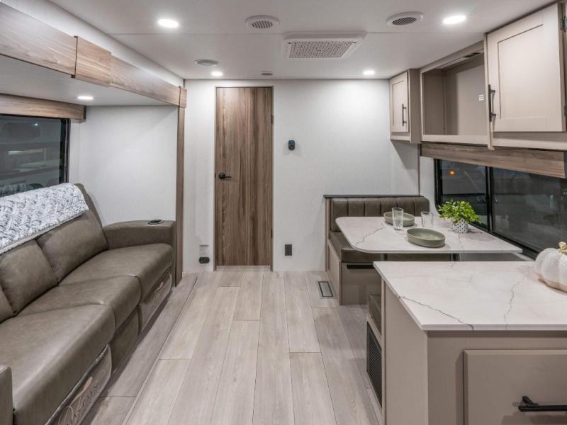 The spacious rear kitchen is equipped with a pantry for ample storage, a three-burner cooktop for culinary creativity, a refrigerator, and a cozy booth dinette for meals or socializing. This unit also has a hutch for additional storage and display. You can unwind in the plush theater seating, organize all of your footwear in the convenient shoe storage. Further, you can relax and refresh after a long day of adventures in the walk-through bath, which provides easy access and convenience, and have a good night's sleep in the spacious front bedroom boasting an ample queen bed and two wardrobes to keep your favorite outfits neat. Finally, head outside and create unforgettable memories under the protection of the exterior power awning.